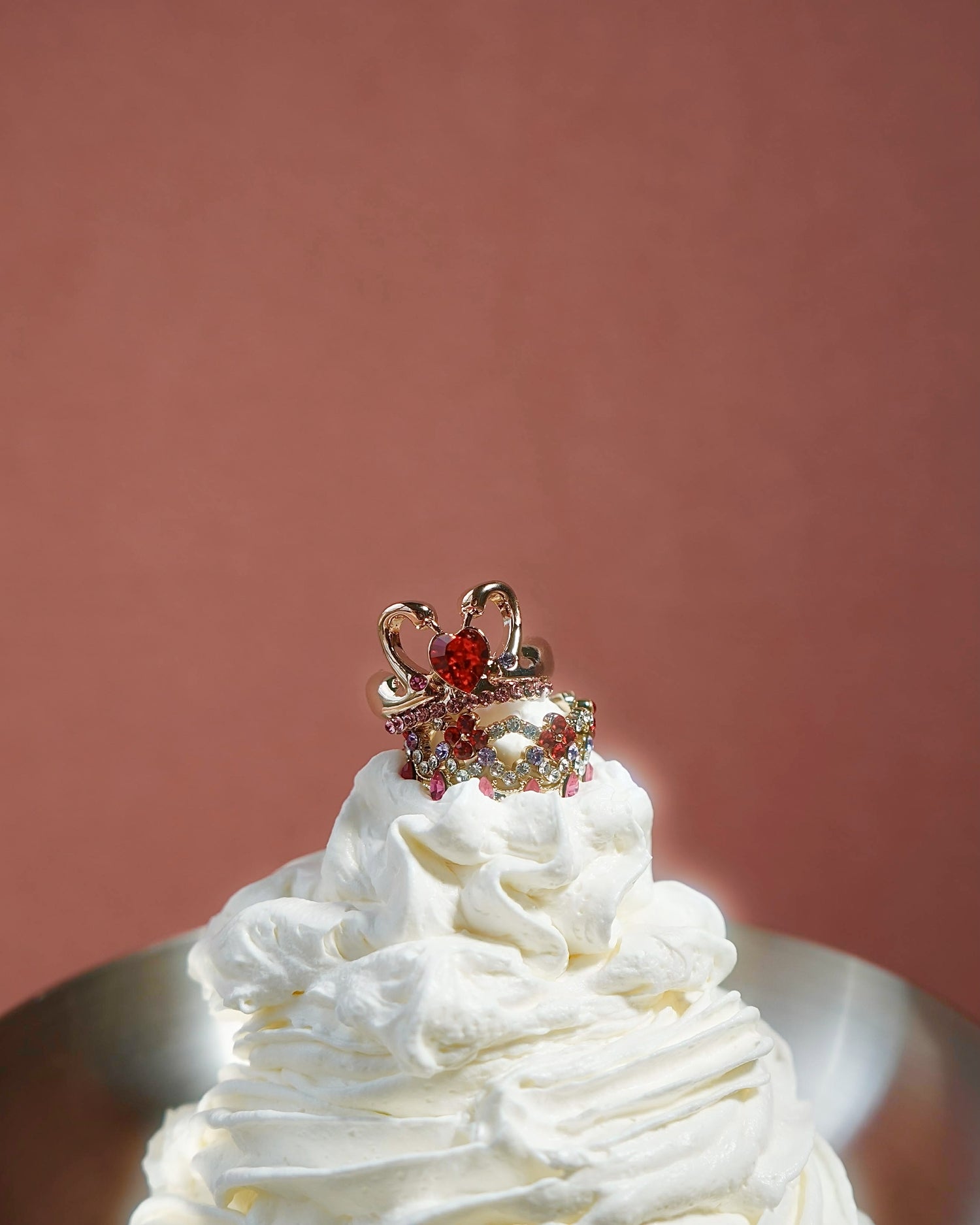 中央で真っ赤なライトシャムのハートを囲む2羽のスワン。実は、歴代のスワンたちと同じ「あの子たち」をイメージしてデザインされています。首元に光るクリスタルの色も、初回からずっと変わらない大切なこだわり。そんな変わらないストーリーを抱きながら、ピンクゴールドの優しい質感が、今の気分にぴったりの温もりを添えてくれます。