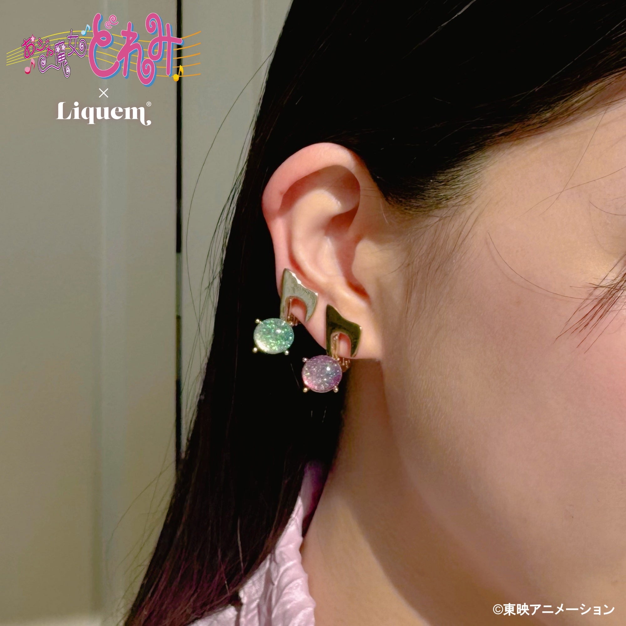 左右で異なるカラーを組み合わせることで、魔女見習いたちの絆を表現しました。樹脂の中のラメは、光の当たり方で色味が変わるオーロラ仕様にこだわり、魔法を使っている瞬間のときめきを再現しています。ペペルトポロンのイヤカフ と重ね付けすれば、より賑やかで楽しい耳元が完成します。