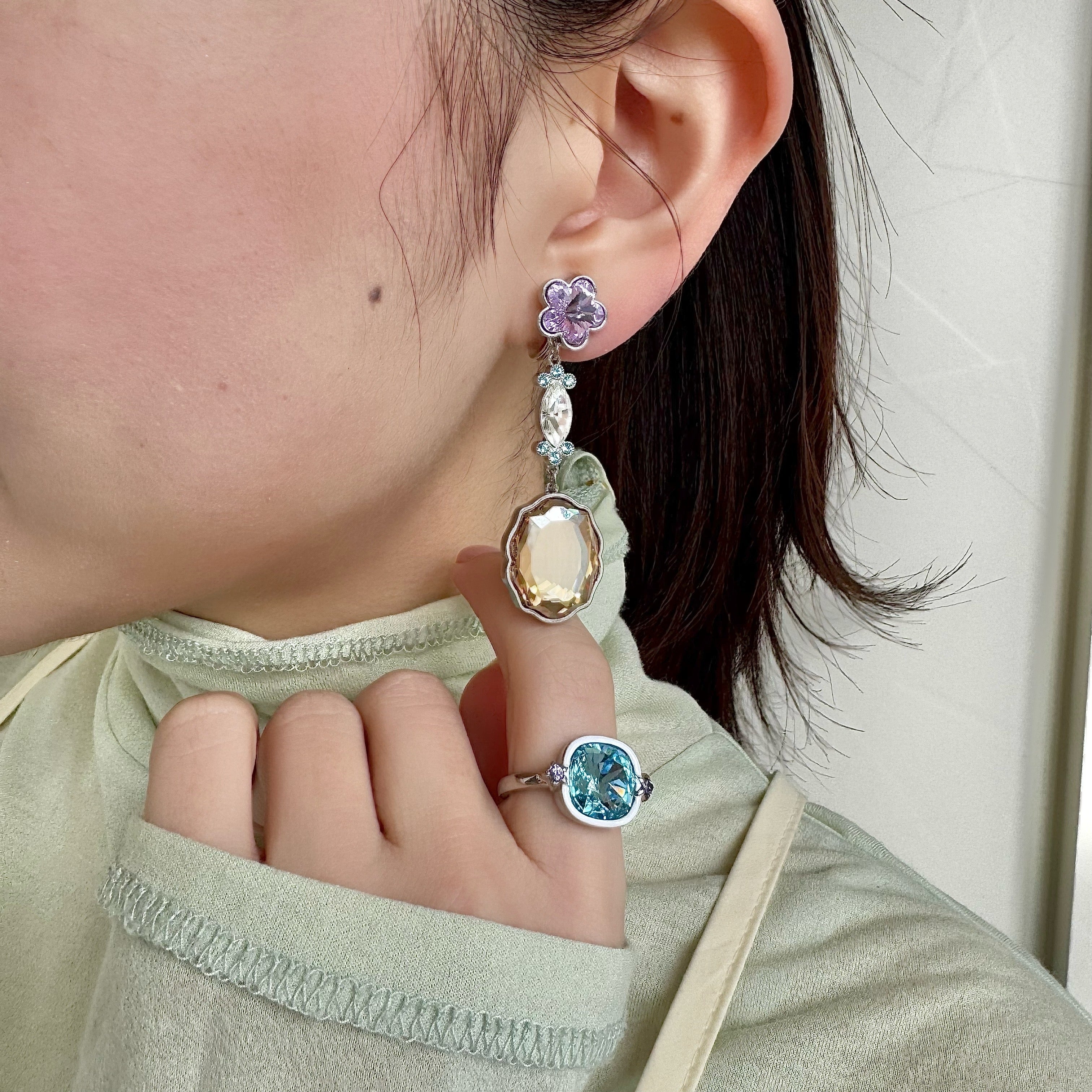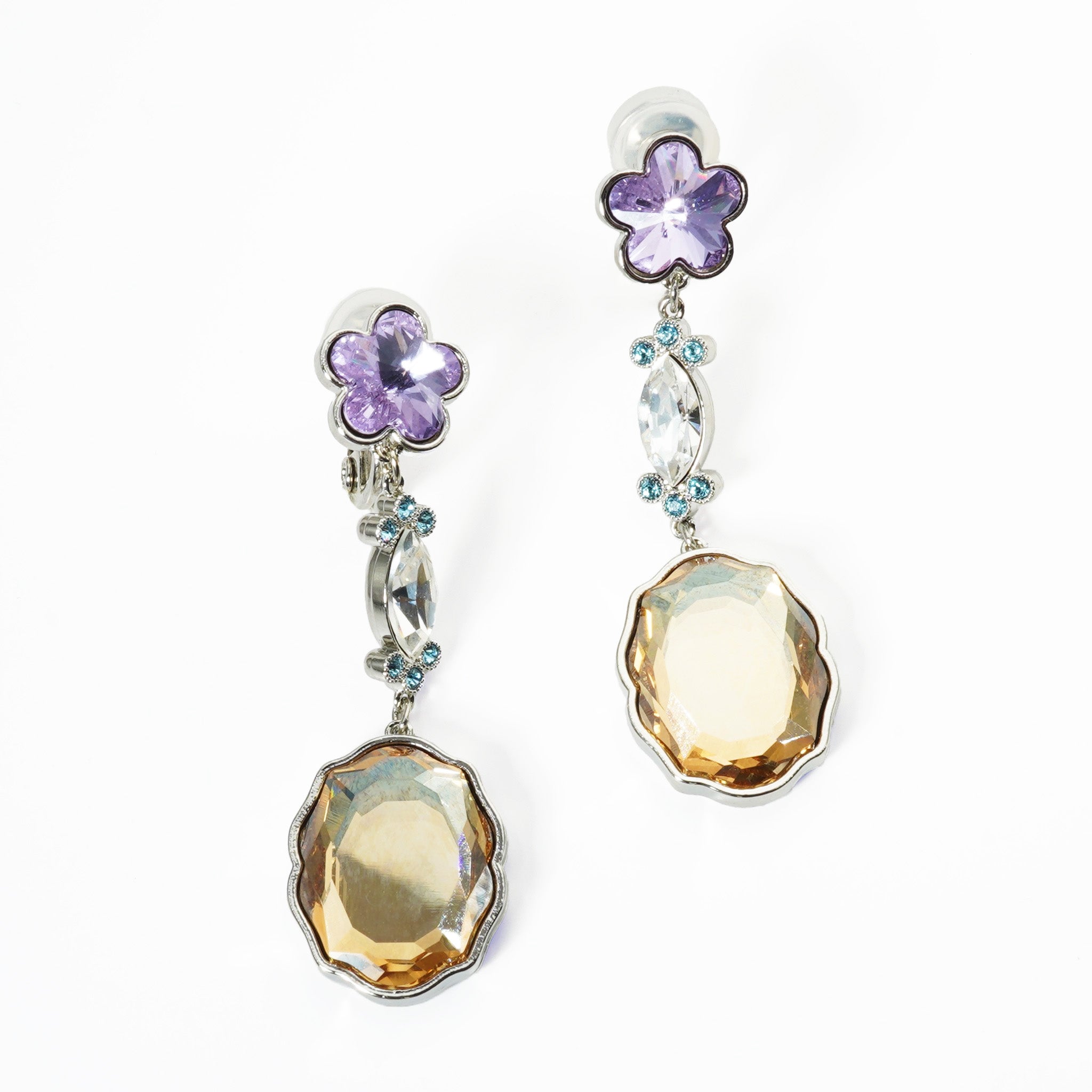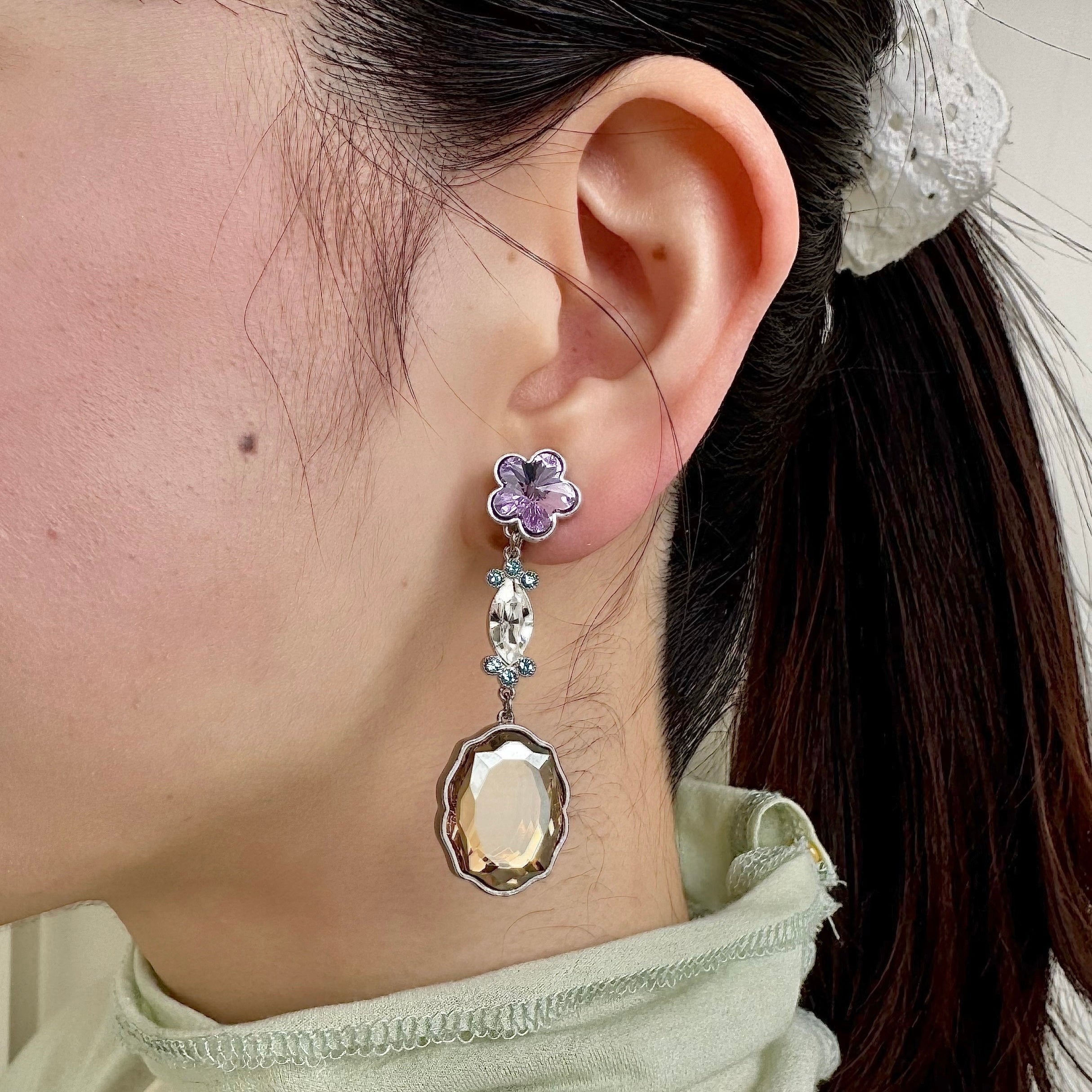 ヘアメイク・髙橋有紀さんの感性が光る、絶妙なカラーパレット。 バイオレット、アクアマリン、ゴールデンシャドウが織りなす、リズムのある輝き。 一番下で揺れる大粒のクリスタルは、今ではもう手に入らない希少な廃盤パーツを使用しています。