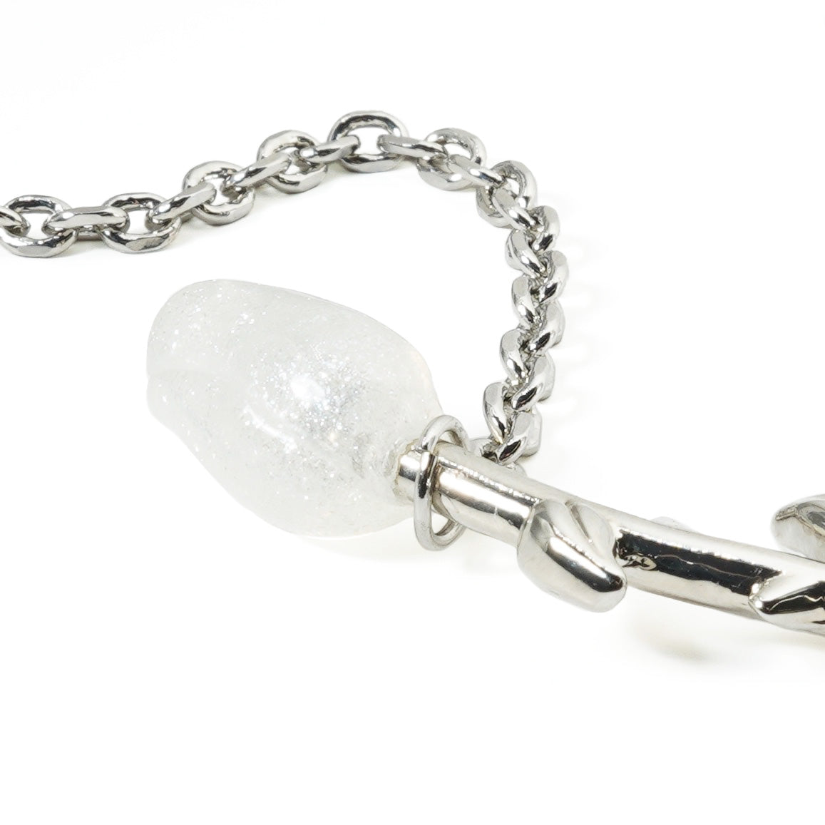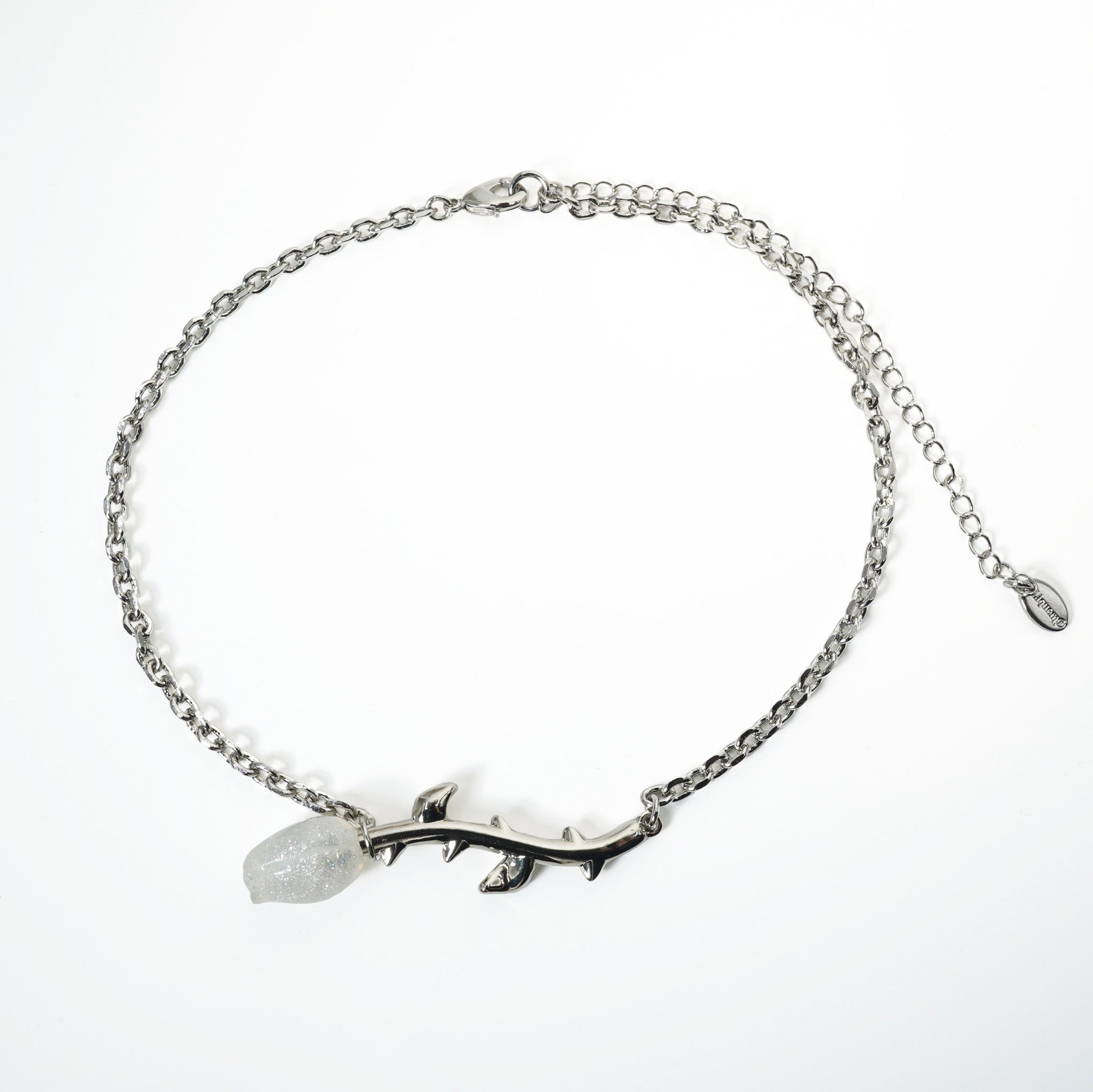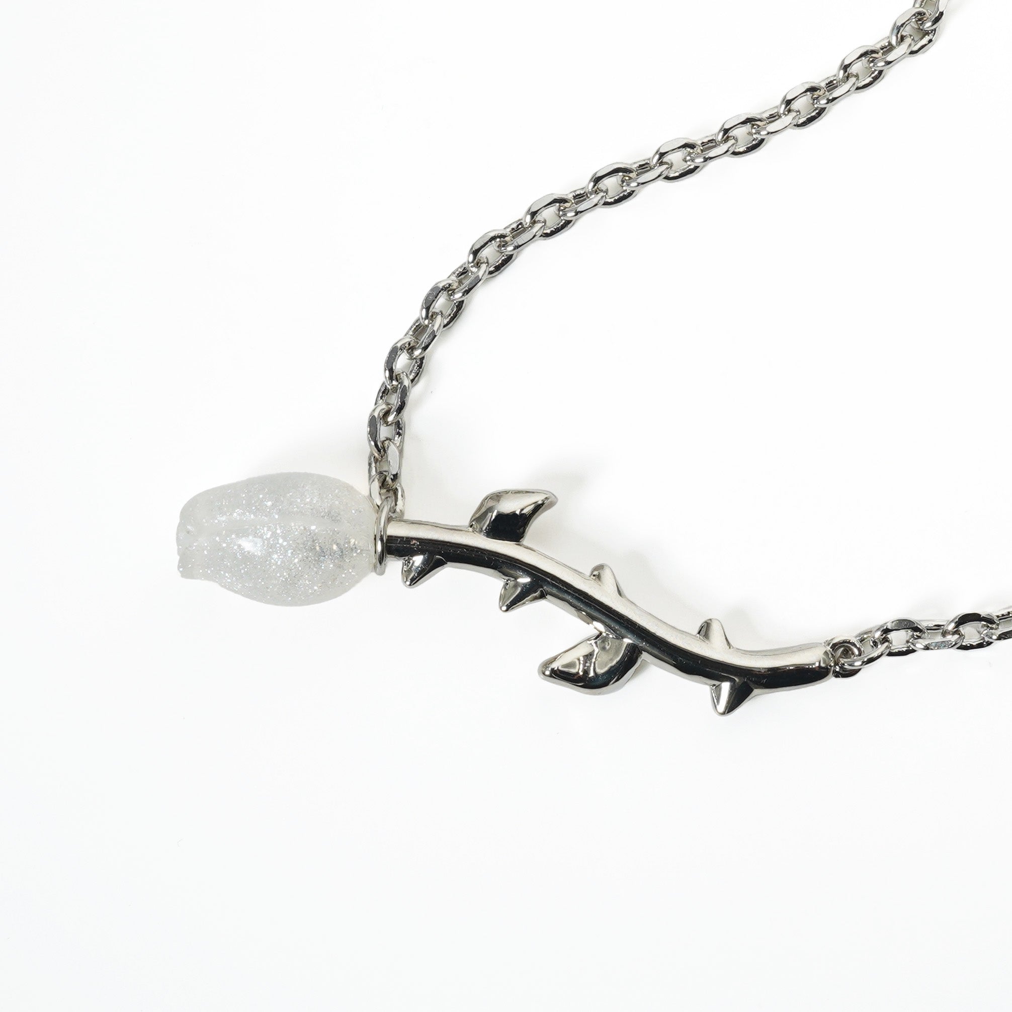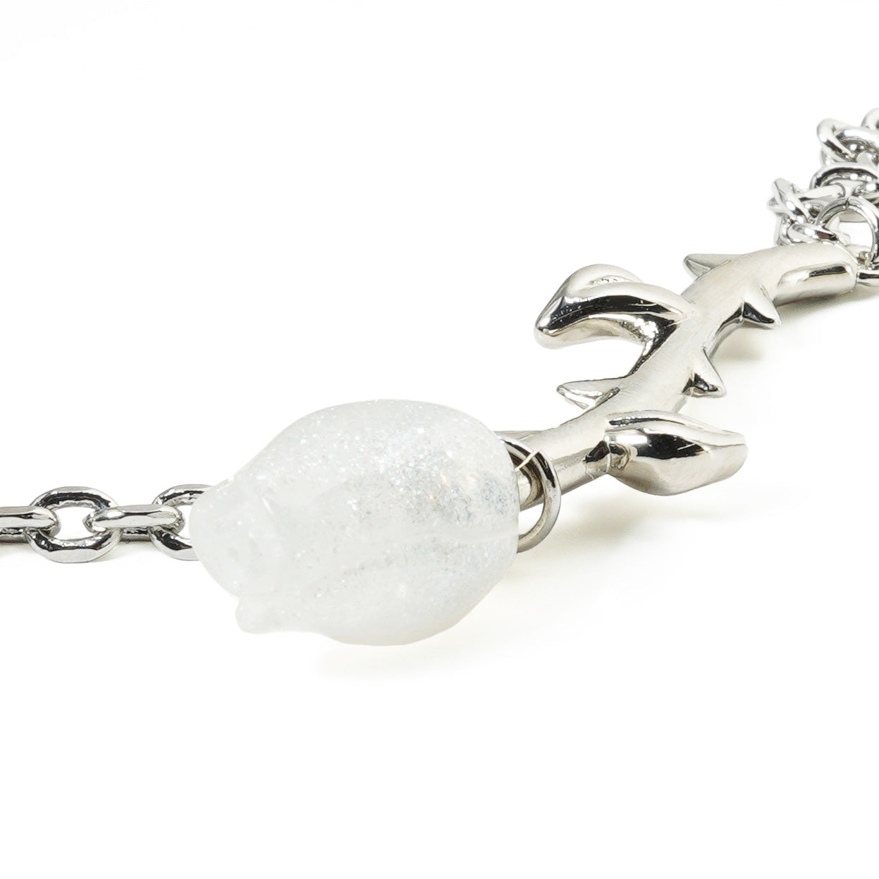 首元にコロンと横たわる、ラメ入りのローズ。 少し太めのチェーンで、チョーカーみたいにカジュアルに楽しめるデザイン。 ホワイトの蕾に忍ばせた繊細なラメが、動くたびに顔まわりを明るく見せてくれます。