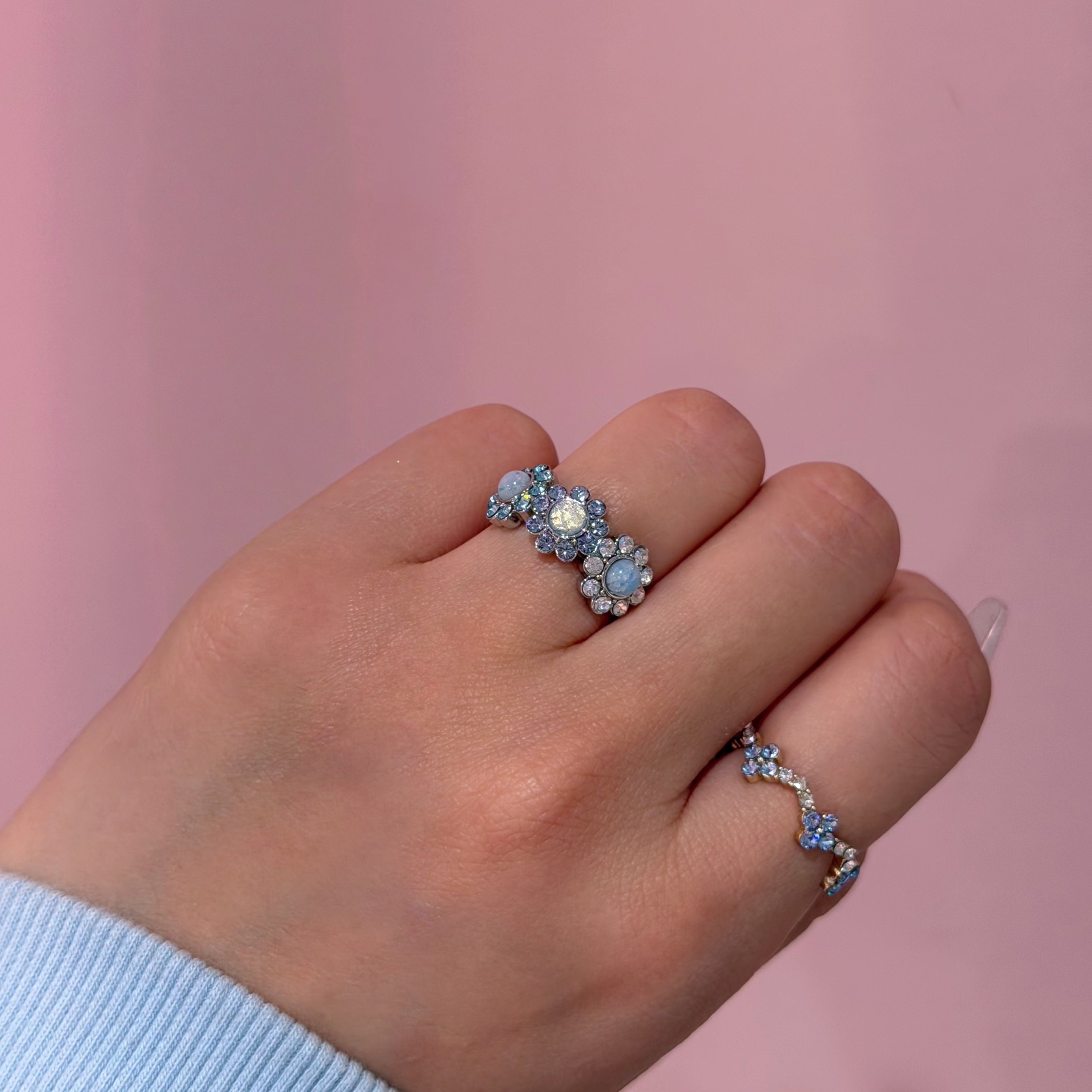 希少なデッドストックのガラスを主役にした、一期一会のお花。 一つひとつ柄の出方が異なるガラスの周りに、澄んだブルー系のクリスタルを散りばめました。 シルバーメタルでキリッと引き締めた、甘すぎずどこか神秘的な佇まいのリングです。