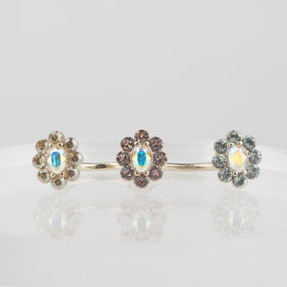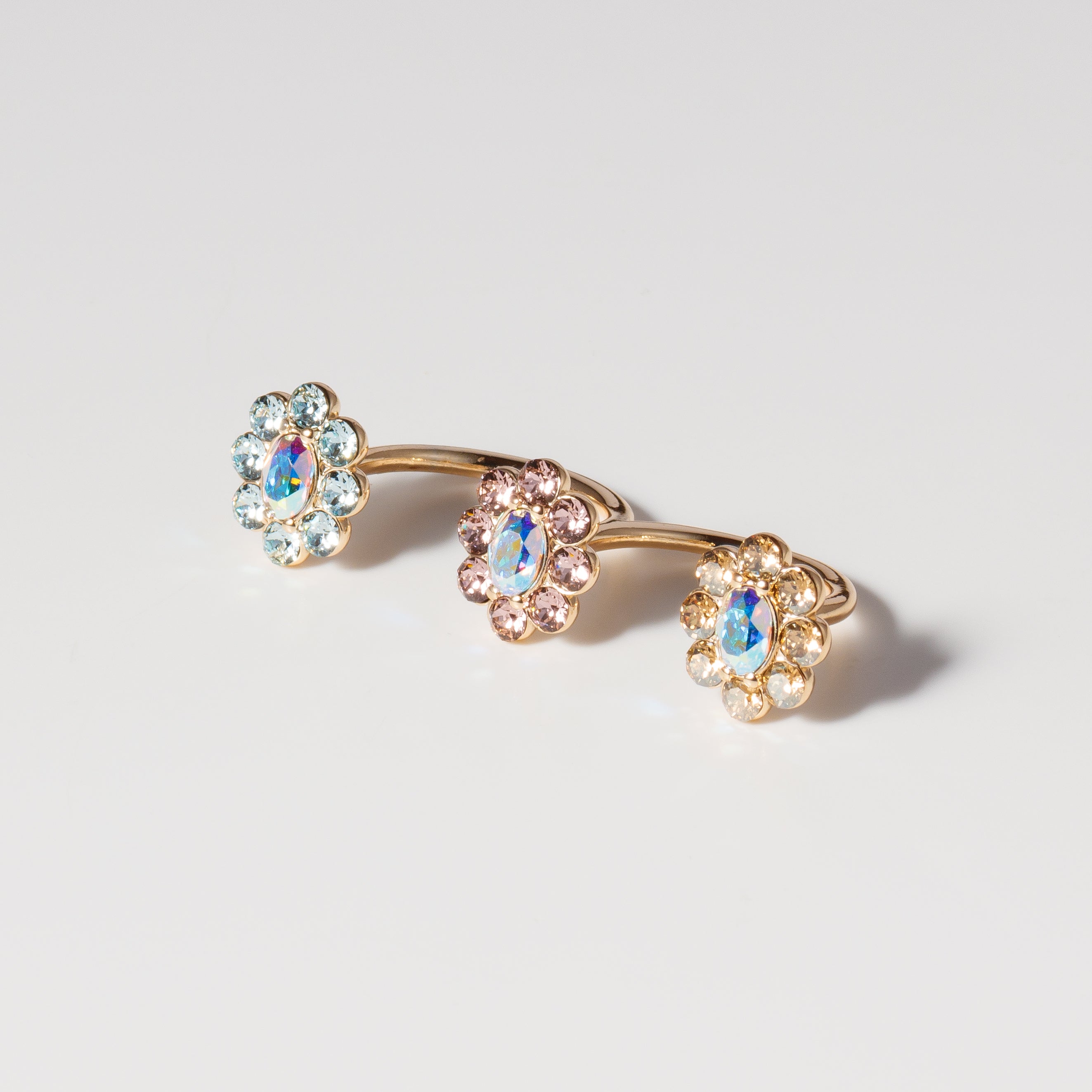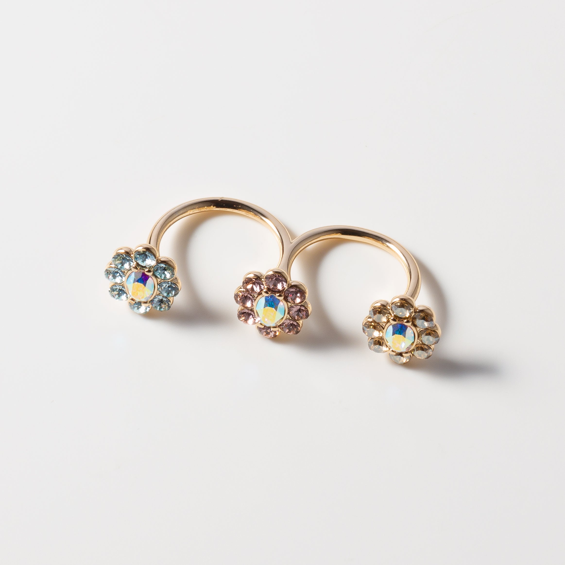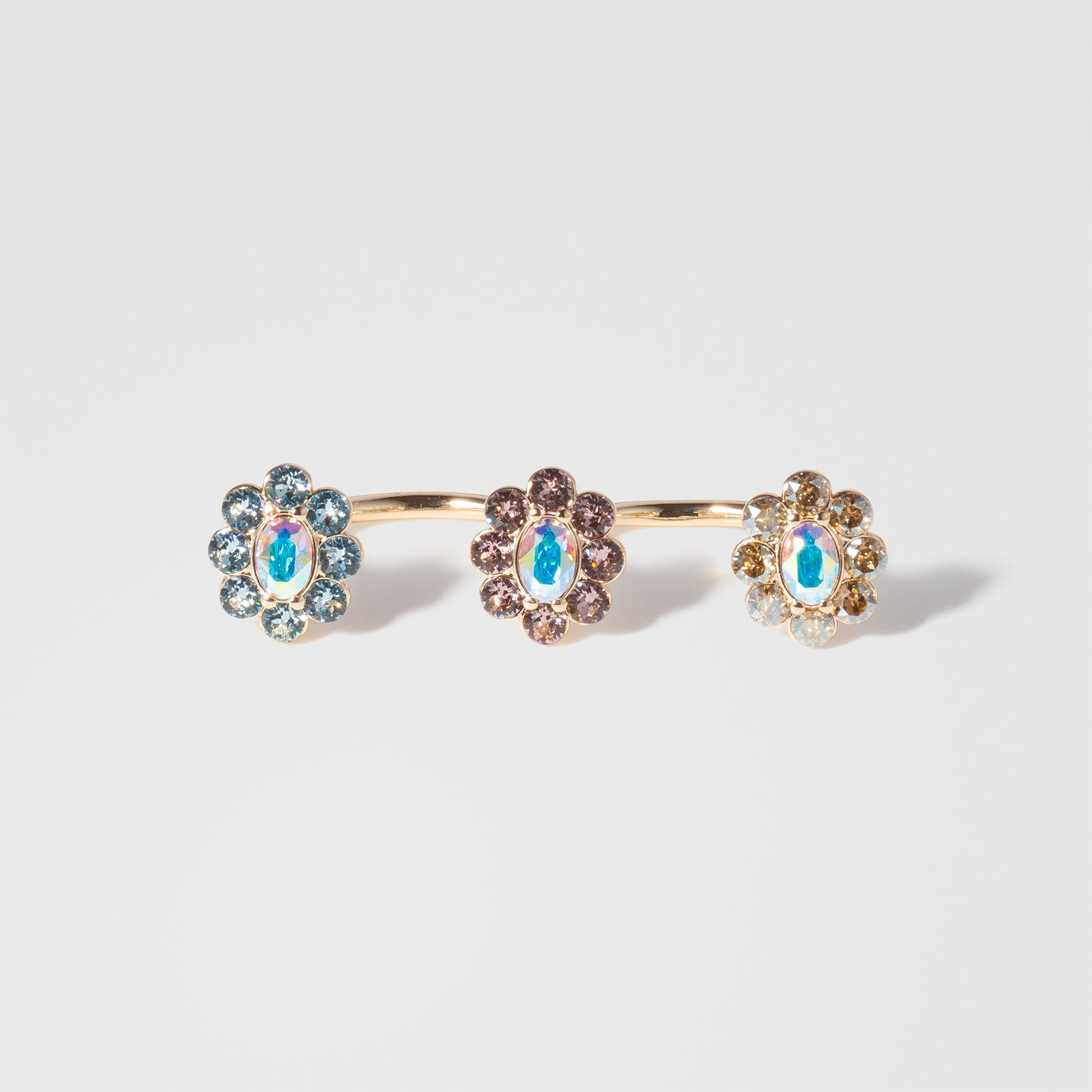 指の間から3輪の花が並ぶように配置されたリング。