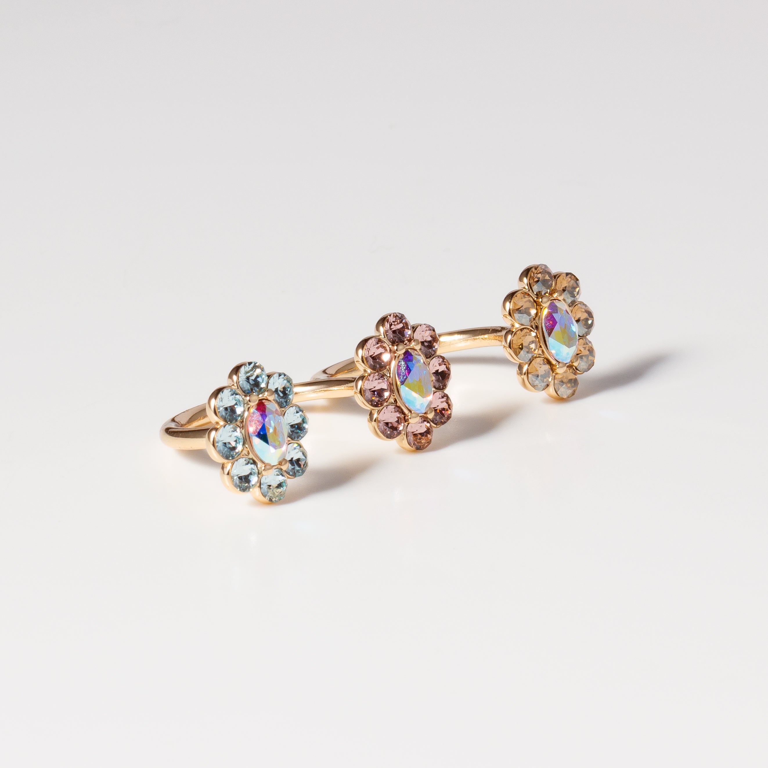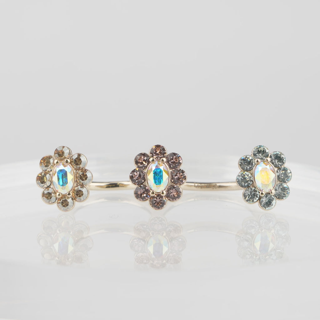 カラーはライトサファイア、ヴィンテージローズ、クリスタルゴールデンシャドー。メタルはライトゴールドでまとめ、手元に小さなブーケを添えたような可憐な印象に仕上げました。