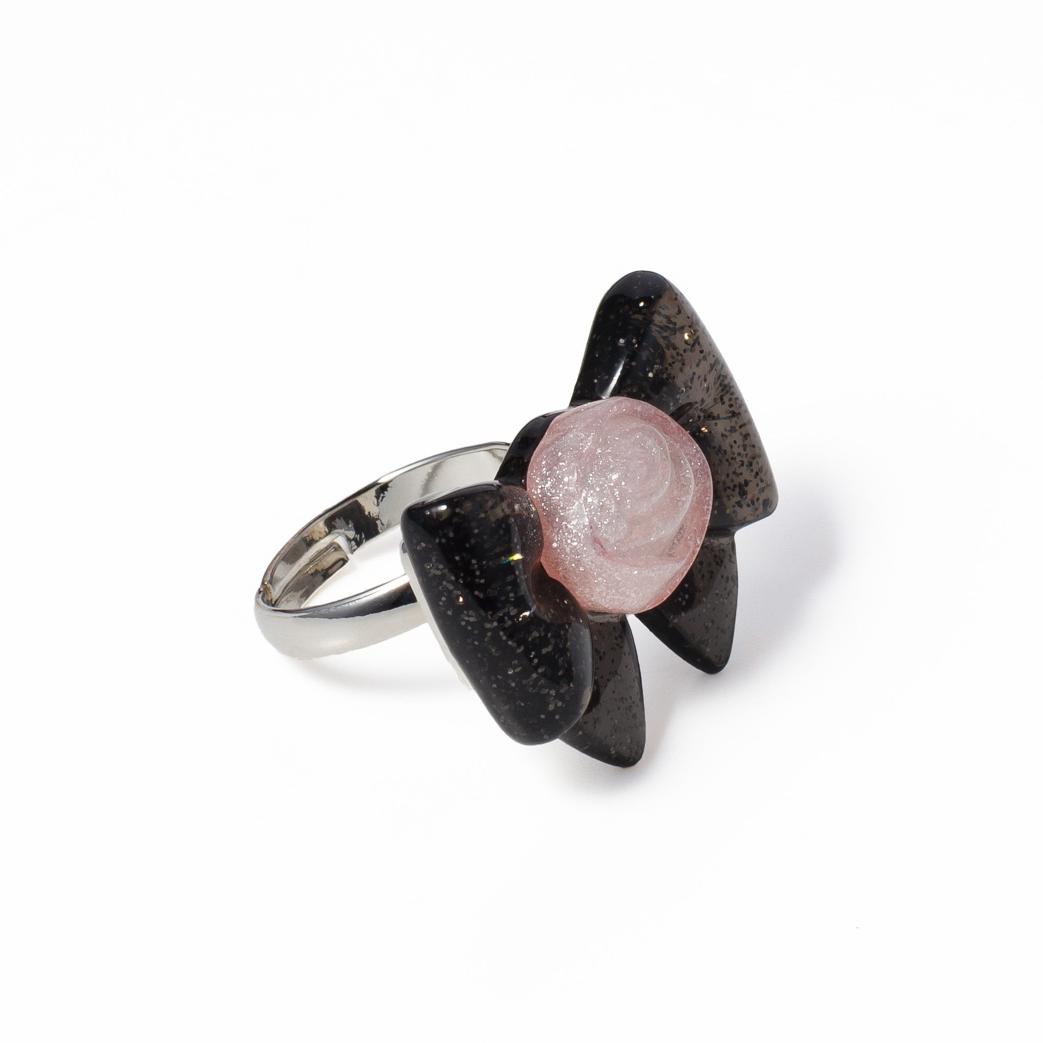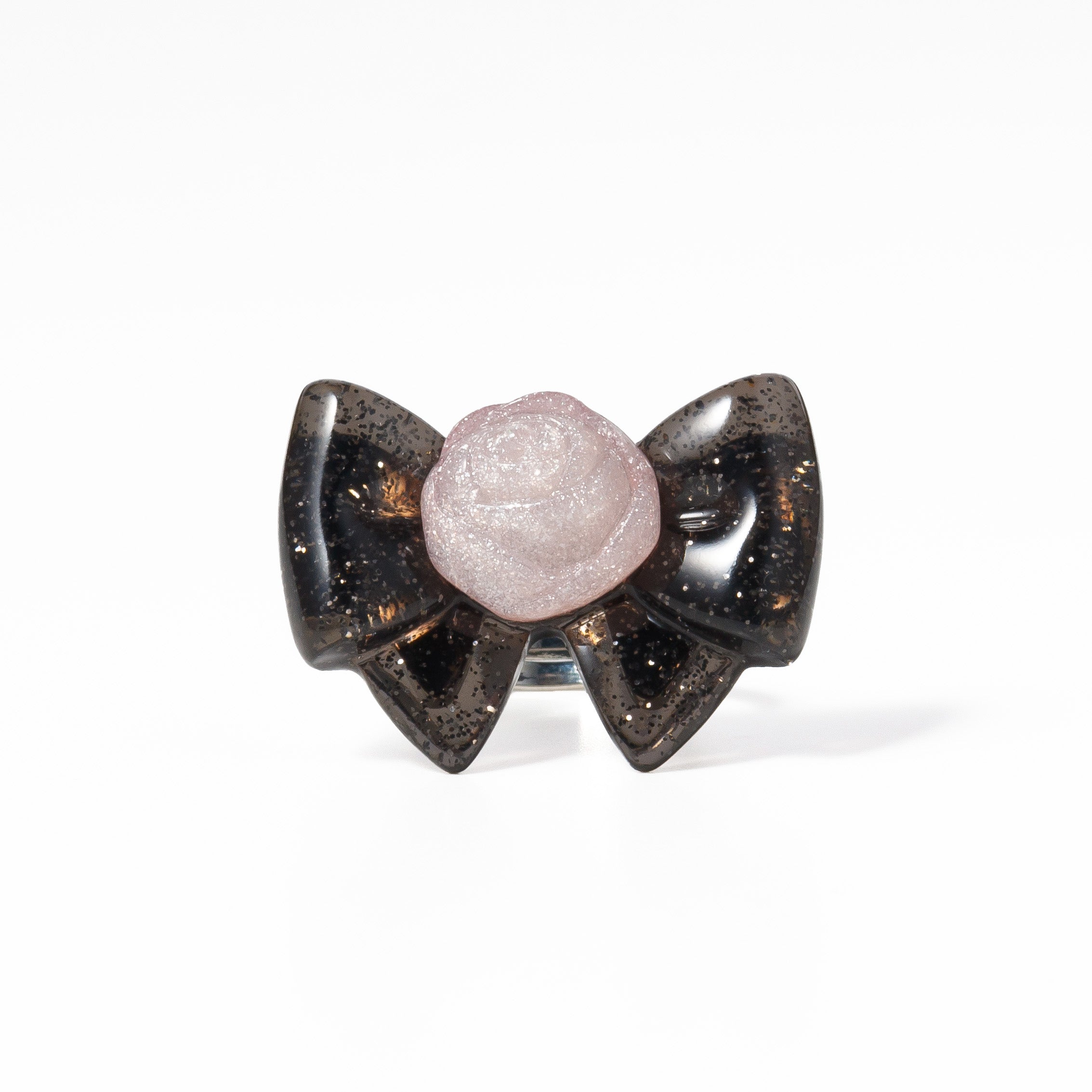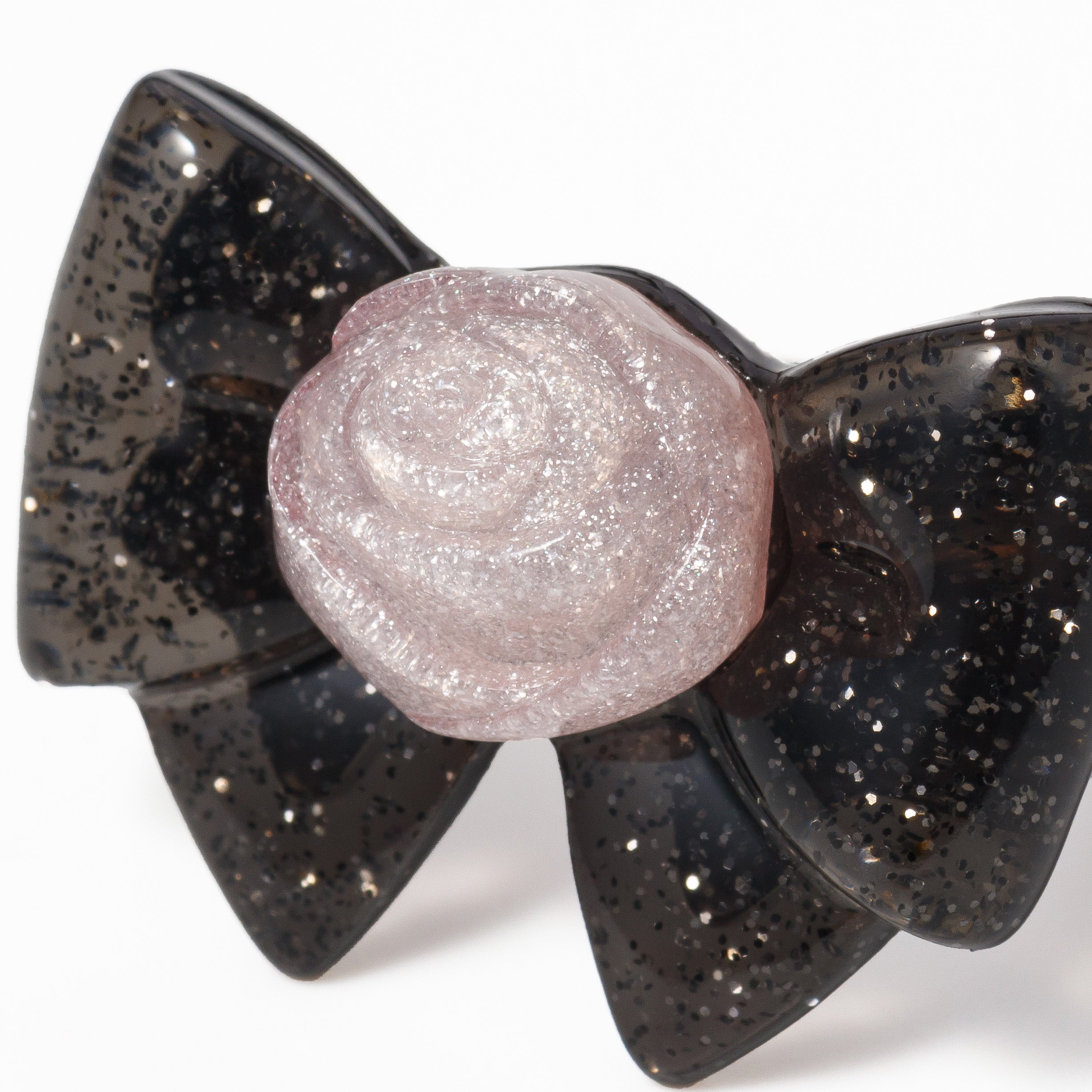 The black ribbon with silver glitter and the rose with delicate glitter sparkle on your hand.