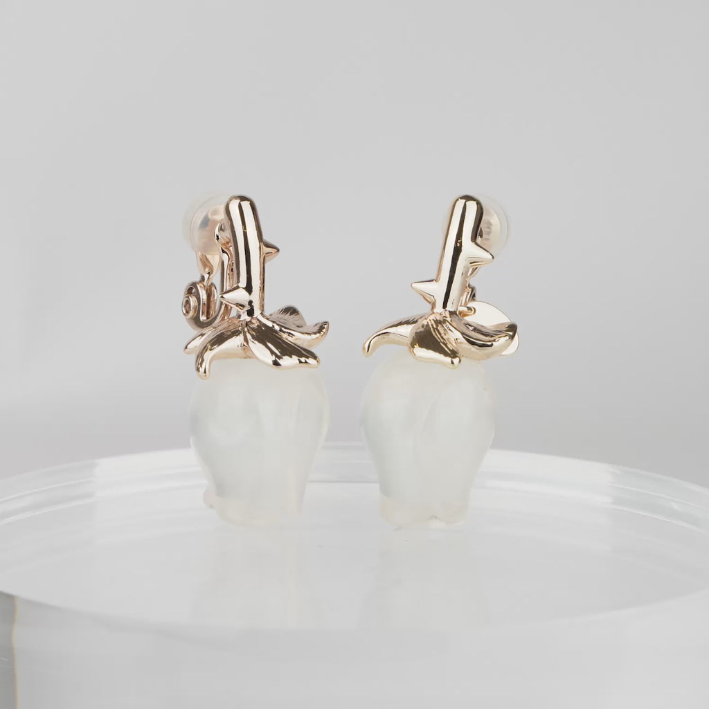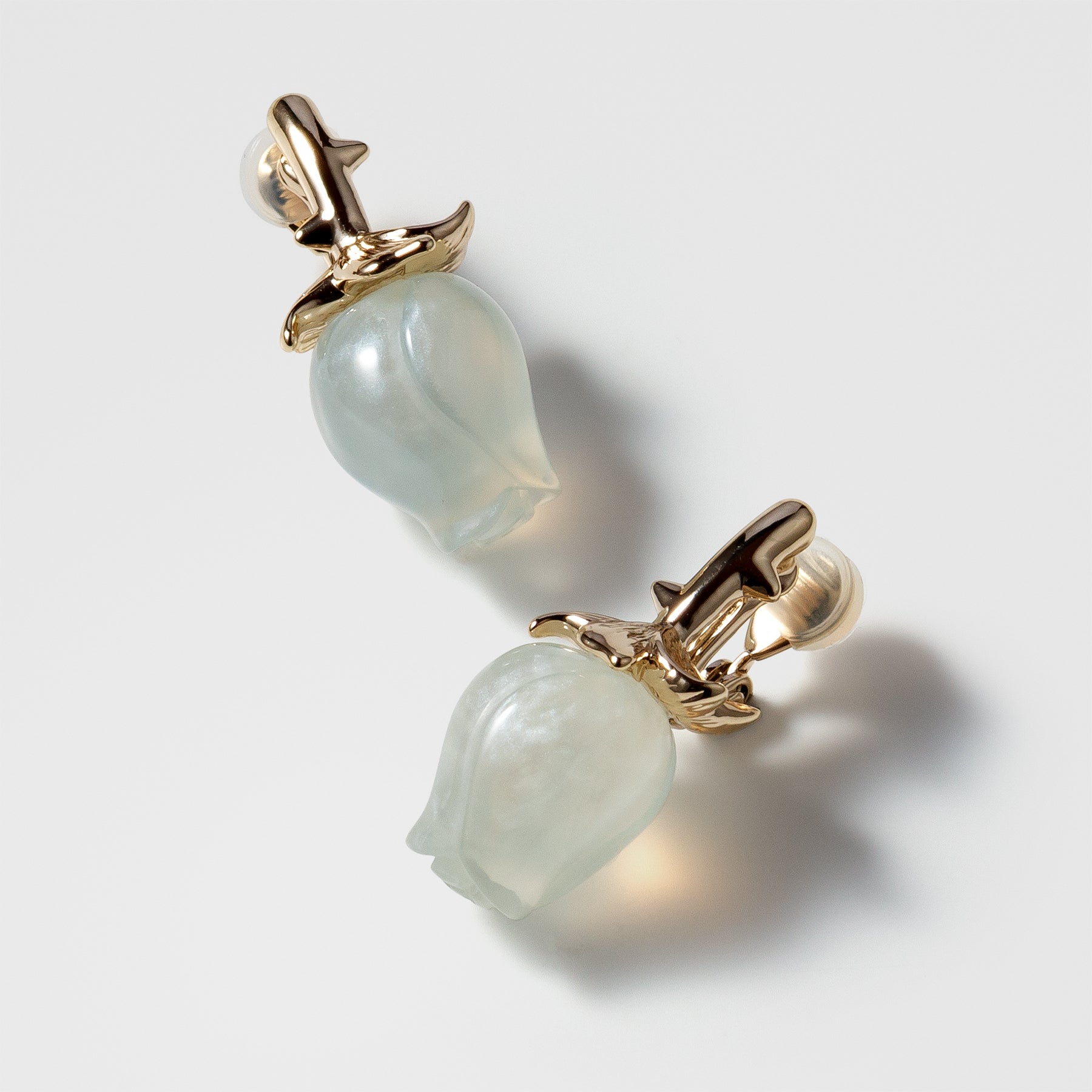 These clear resin rose motif clip on earrings seem to capture a soft light.