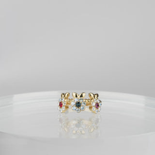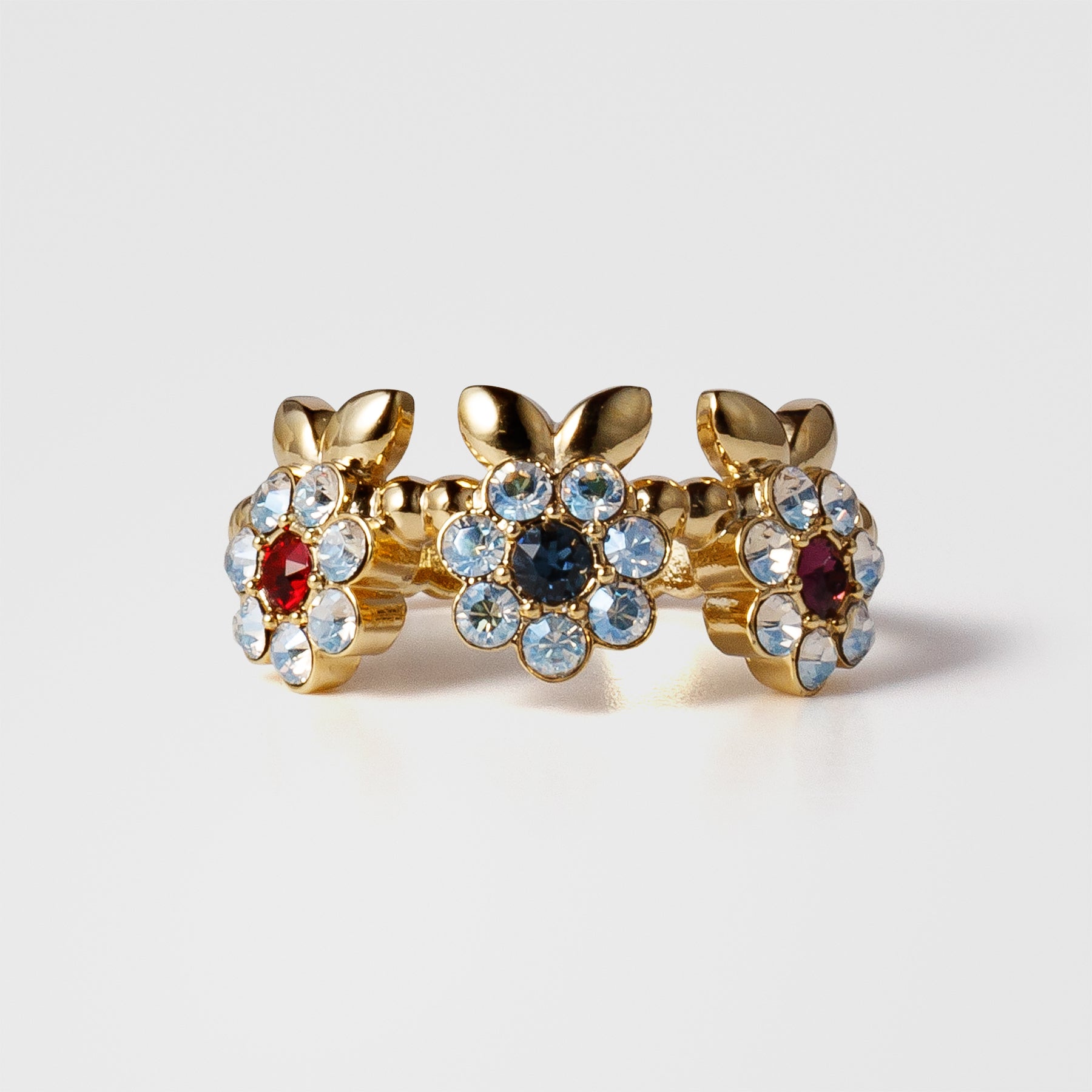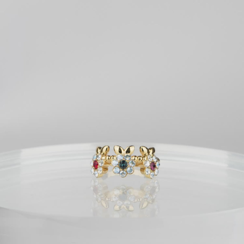 A gorgeous ring with three lovely jeweled flowers strung together.