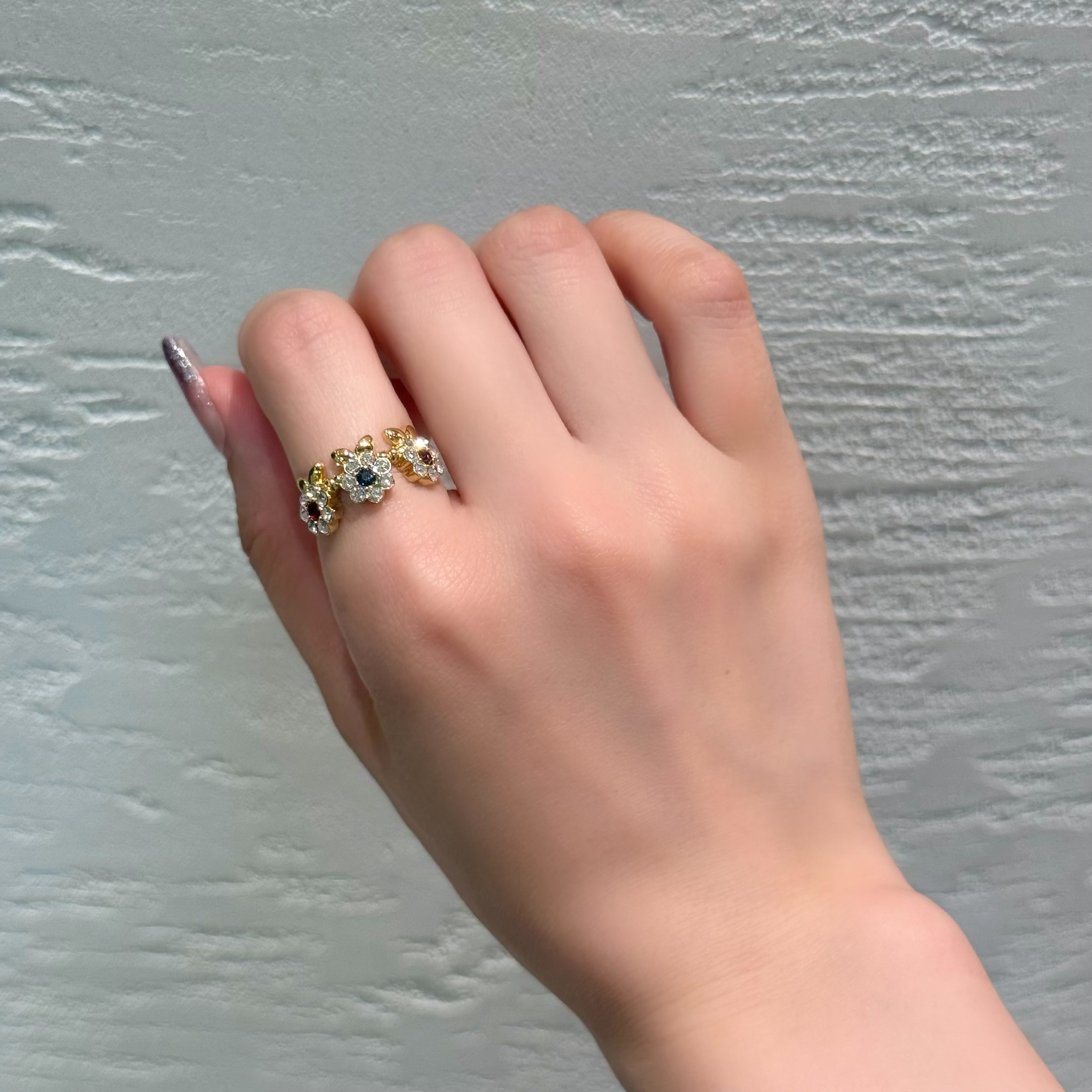 By arranging three colored center stones, we have created movement and expression within a single ring.