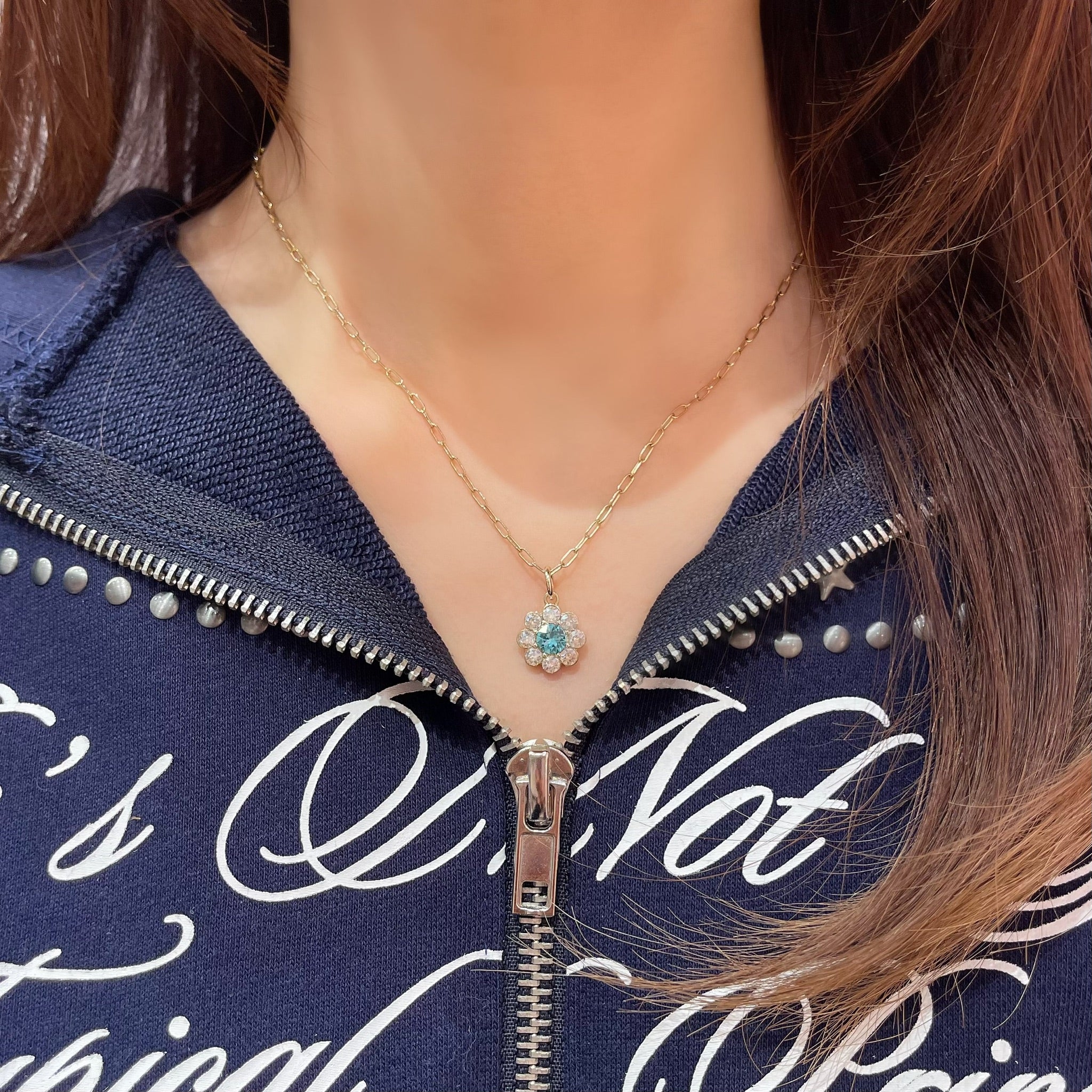 The petals are made of moonlight crystals centered around an aquamarine. Though small, it is packed with a captivating transparency and sparkling sparkle. The metal color is light gold.