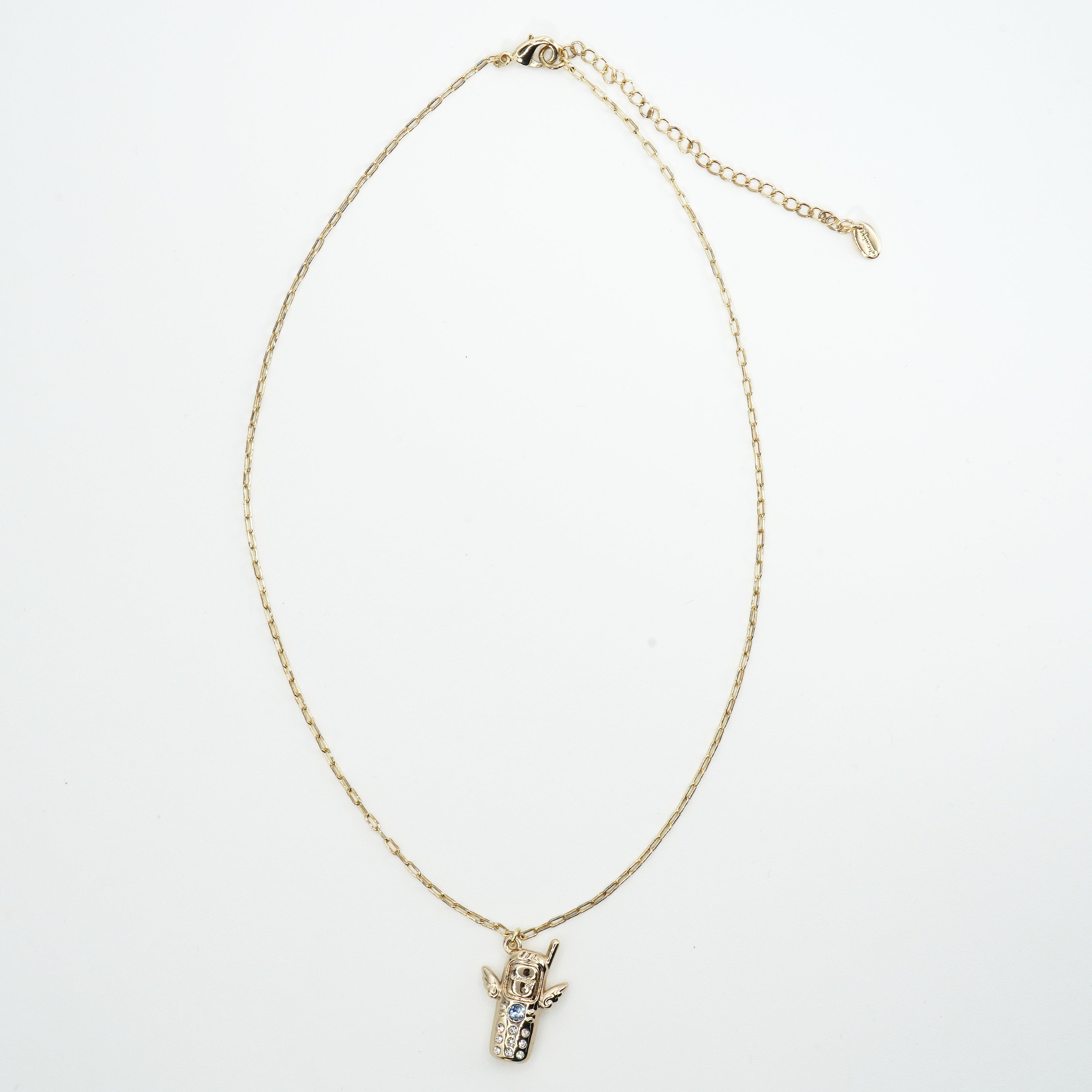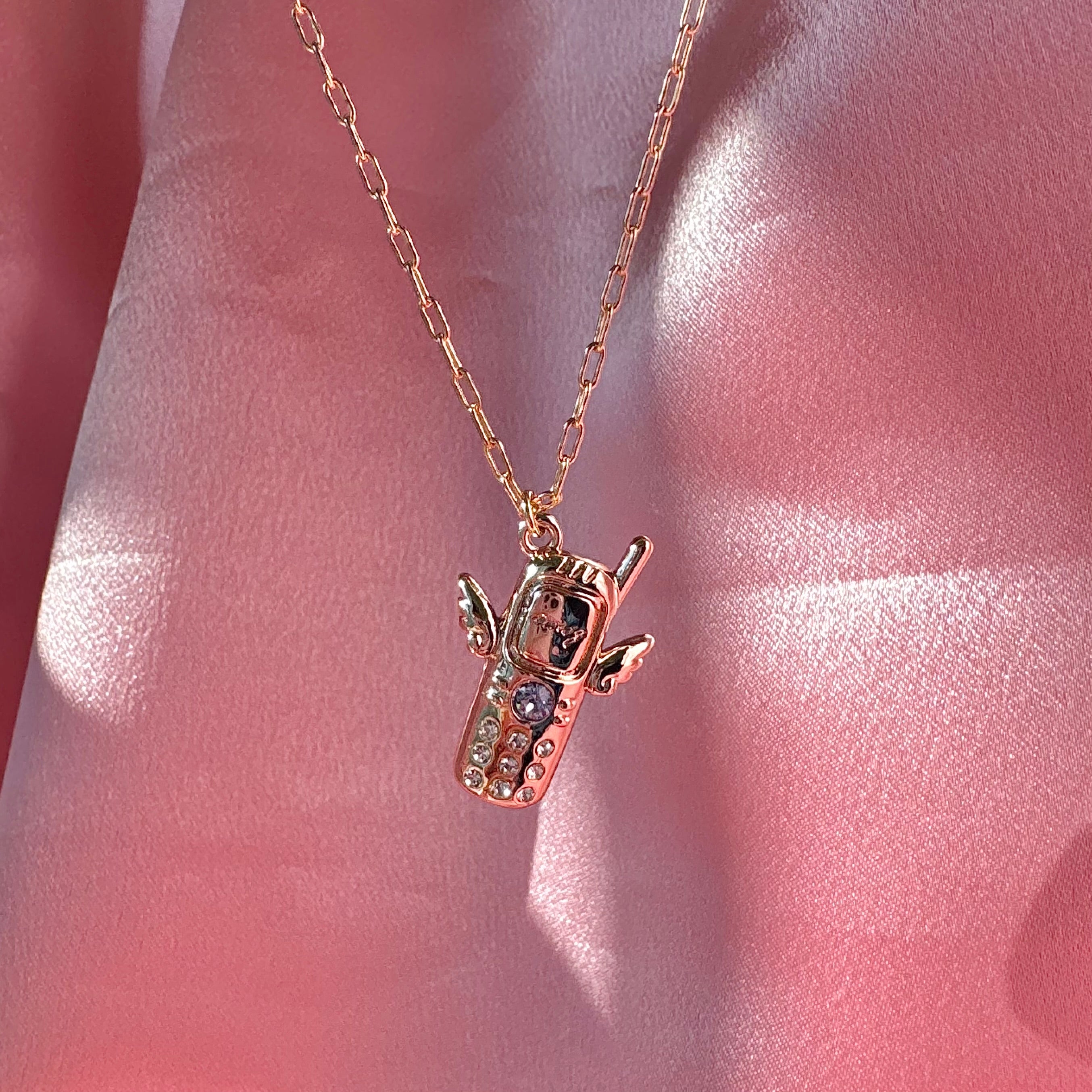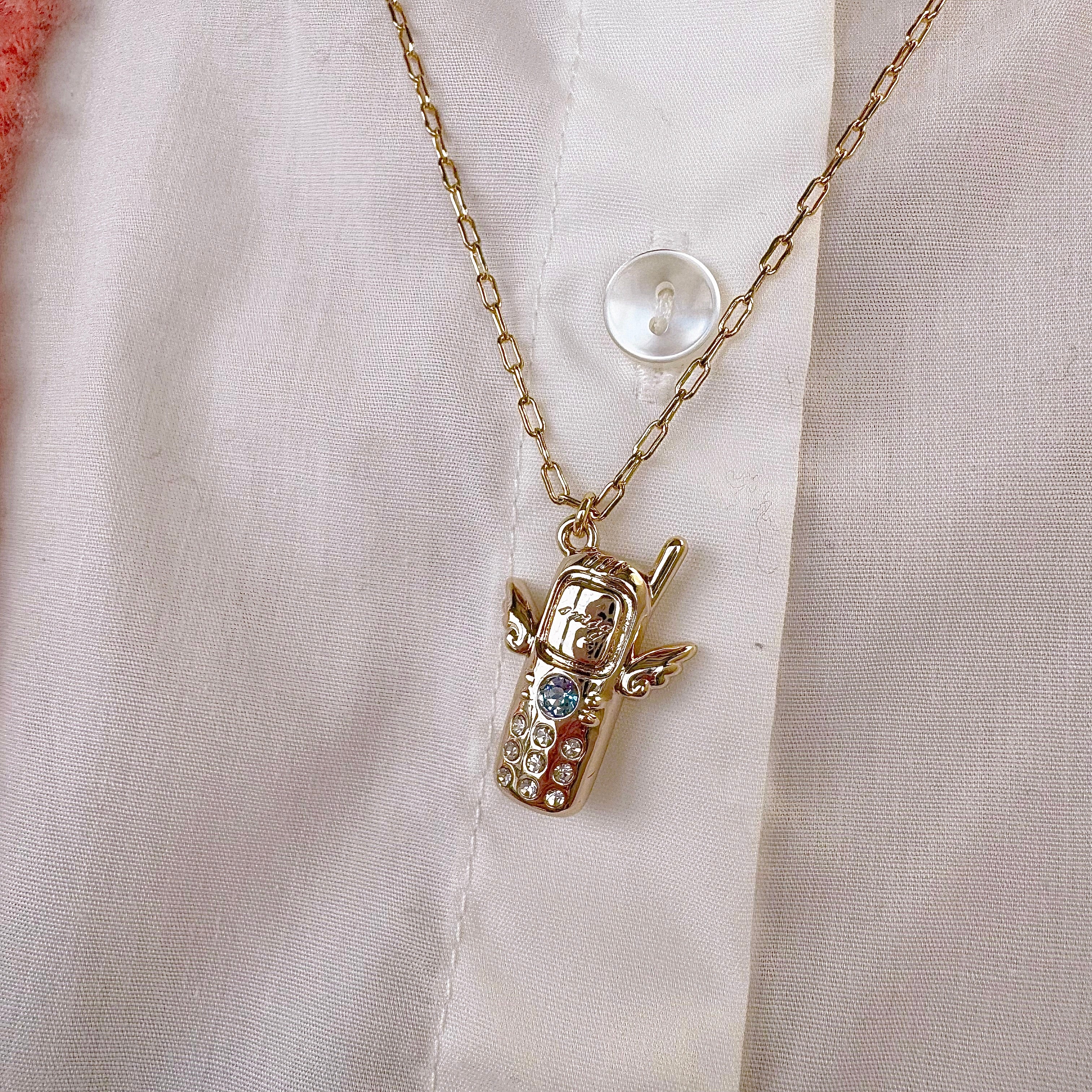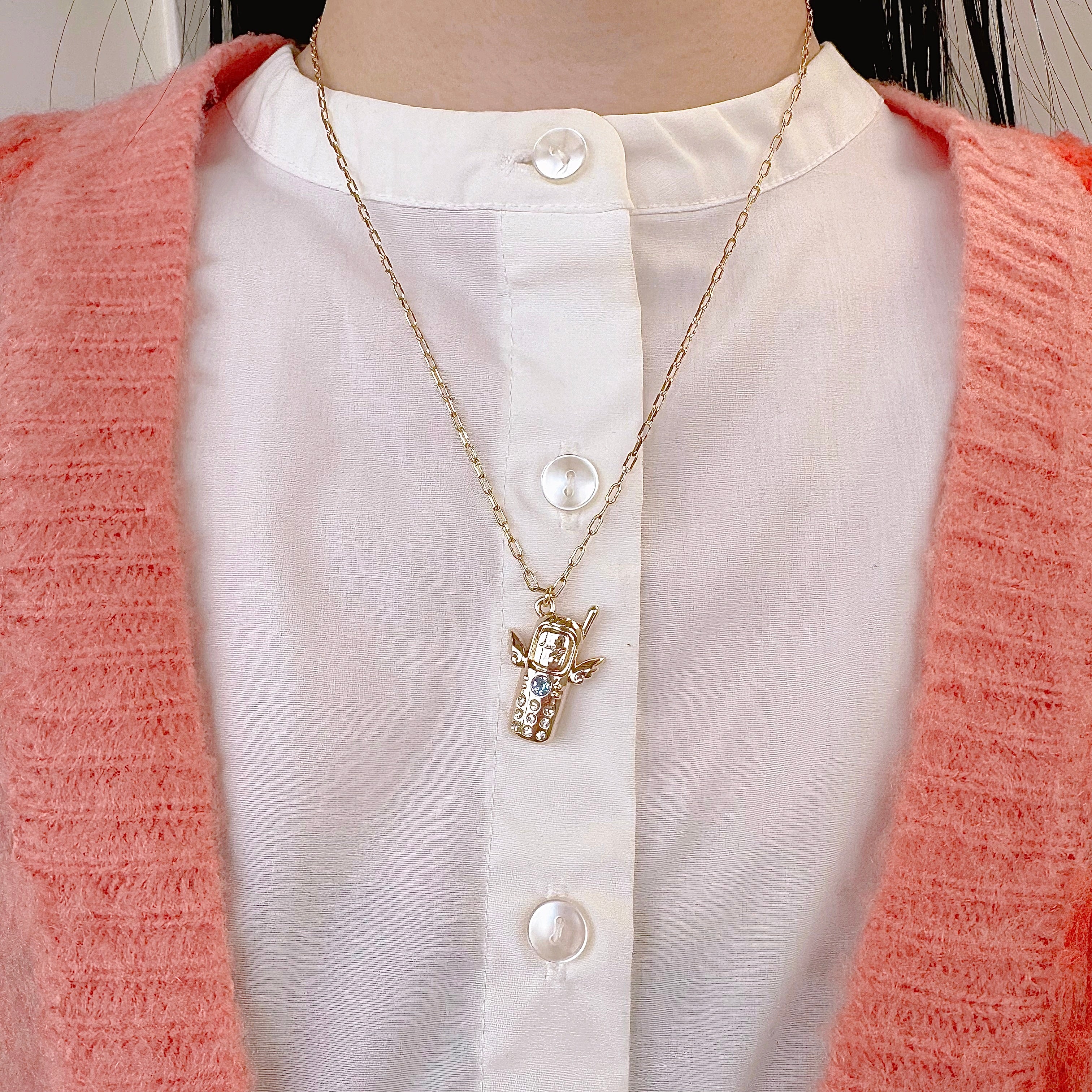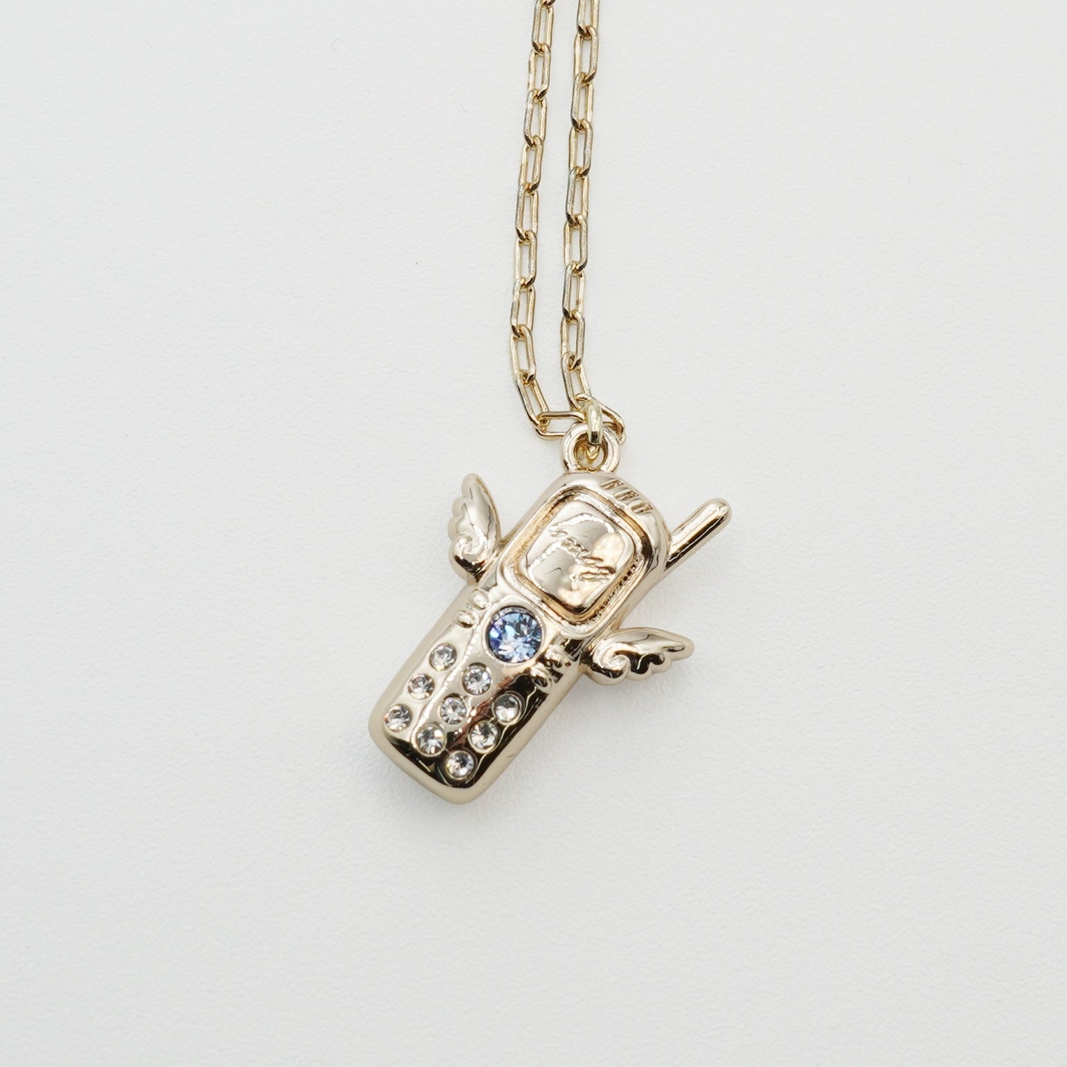 Bring back the excitement of those days to your chest. This playful necklace combines the Heisei era's iconic "garakei" (feature phone) with angel wings. "1msg" is engraved on the LCD screen, capturing the excitement of receiving an email. A light sapphire crystal sparkles in the center, evoking a nostalgic glow. Crystals are embedded in the buttons.