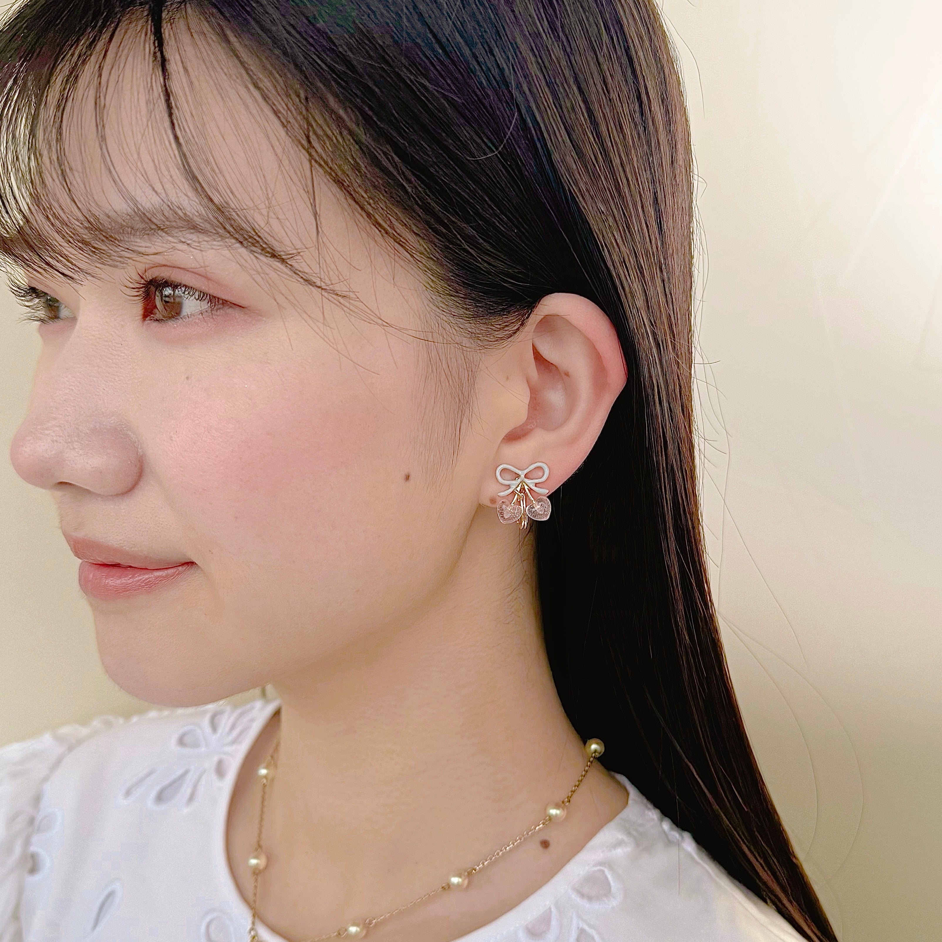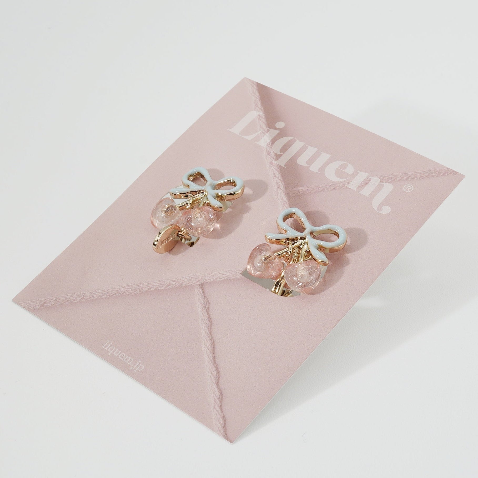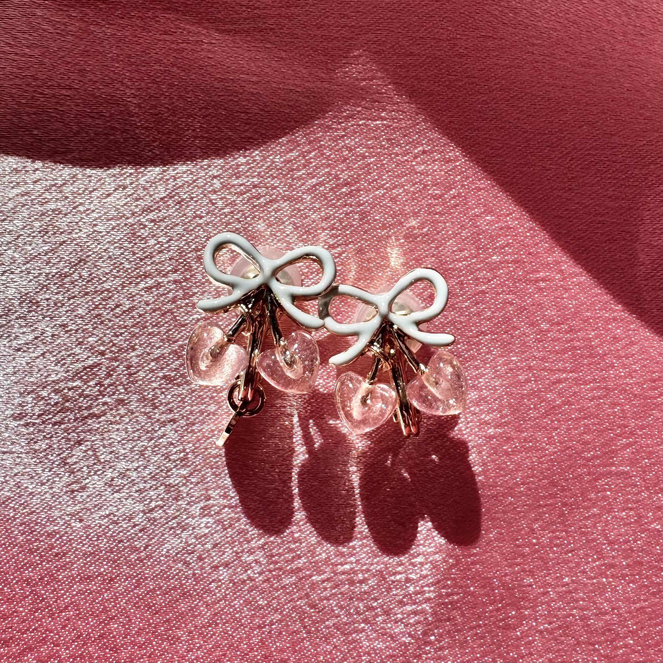 These round, sweet, ripe heart-shaped cherry earrings feature Liquem's iconic cherry motif, finished with a sugar pink glitter heart. For the first time, the ribbon is colored pale blue, creating a sweet and refreshing contrast.