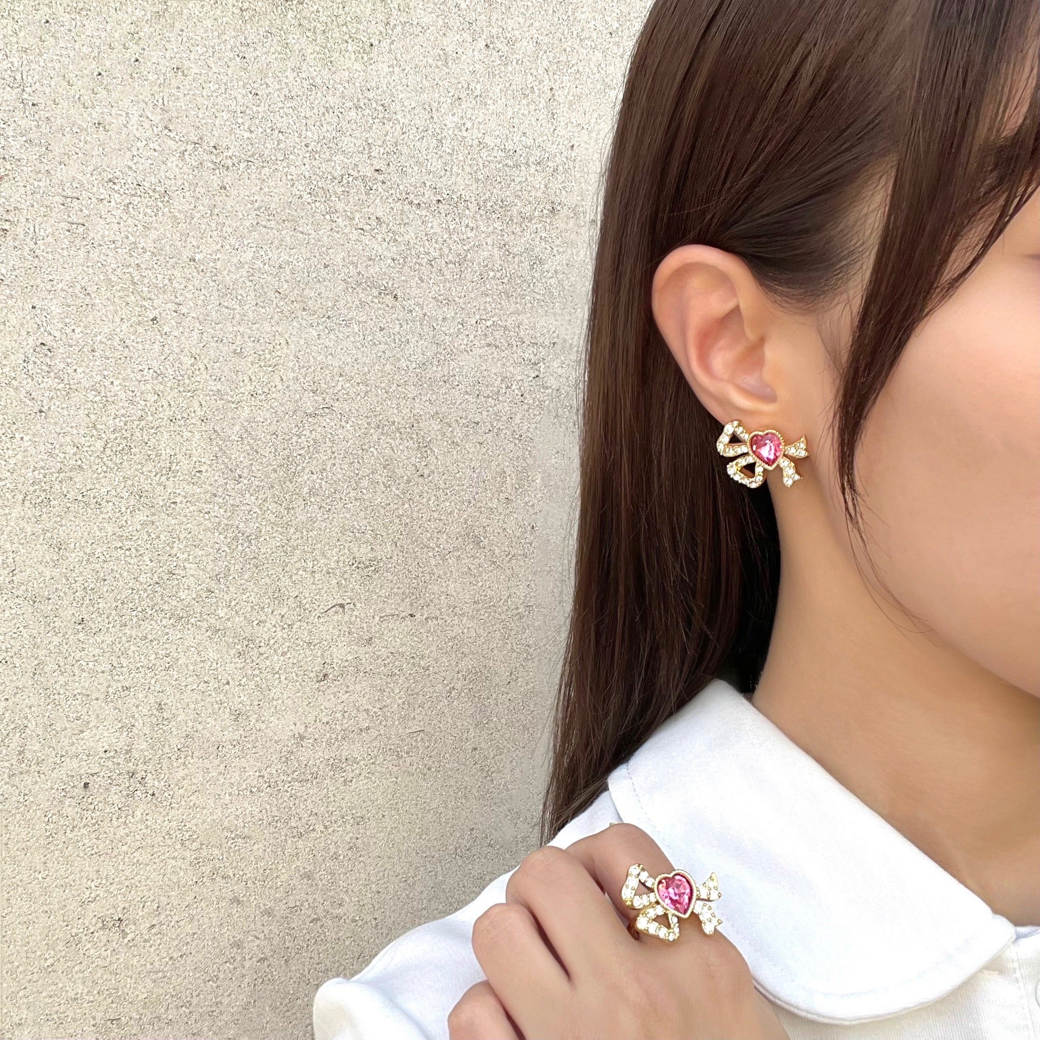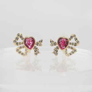 These earrings have a striking presence like a medal, with a rose-colored heart crystal in the center.