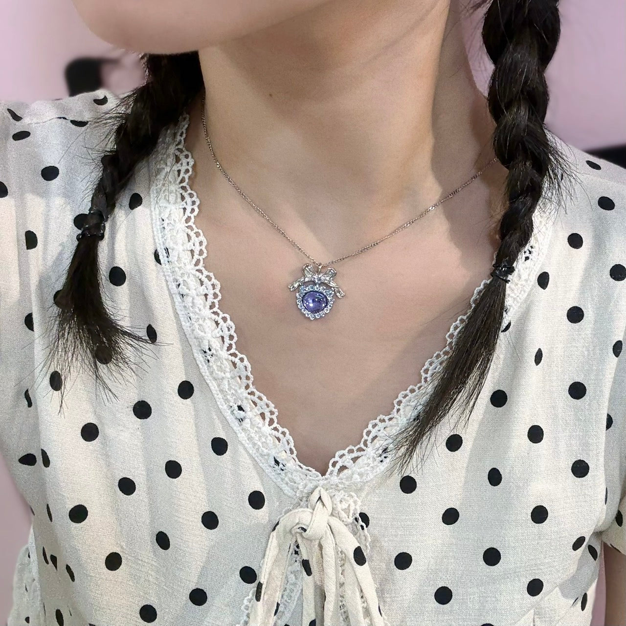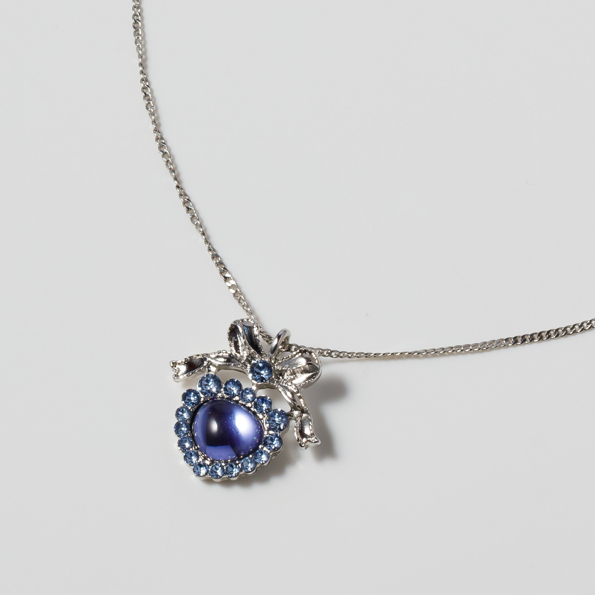 A pendant featuring a purple heart inspired by tanzanite under a classic ribbon.