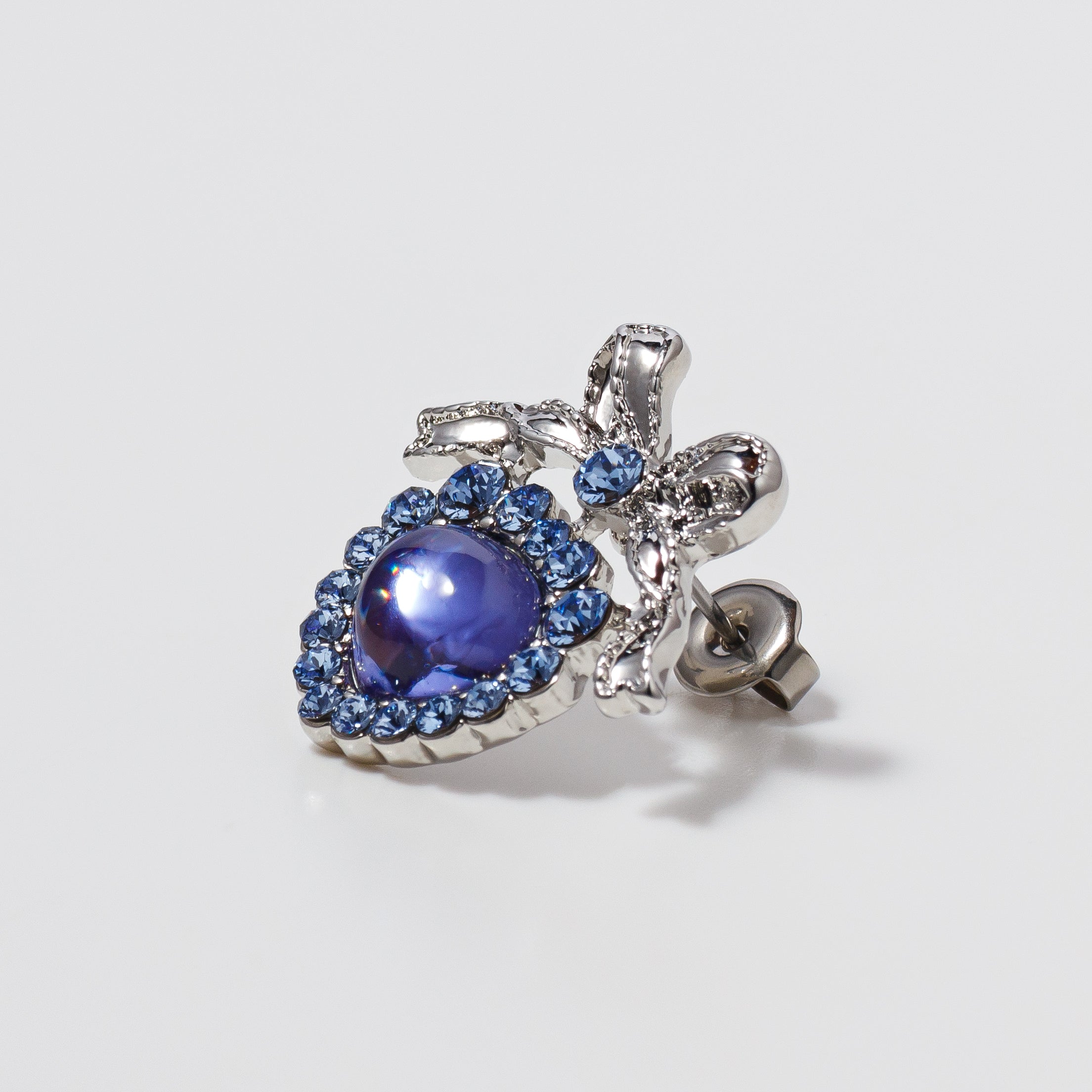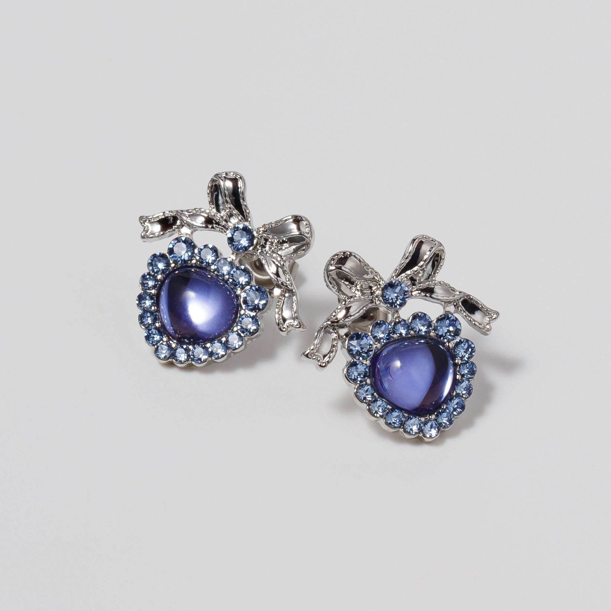 A light sapphire colored crystal is set in the center of the classic ribbon.