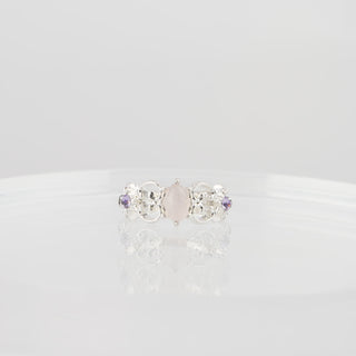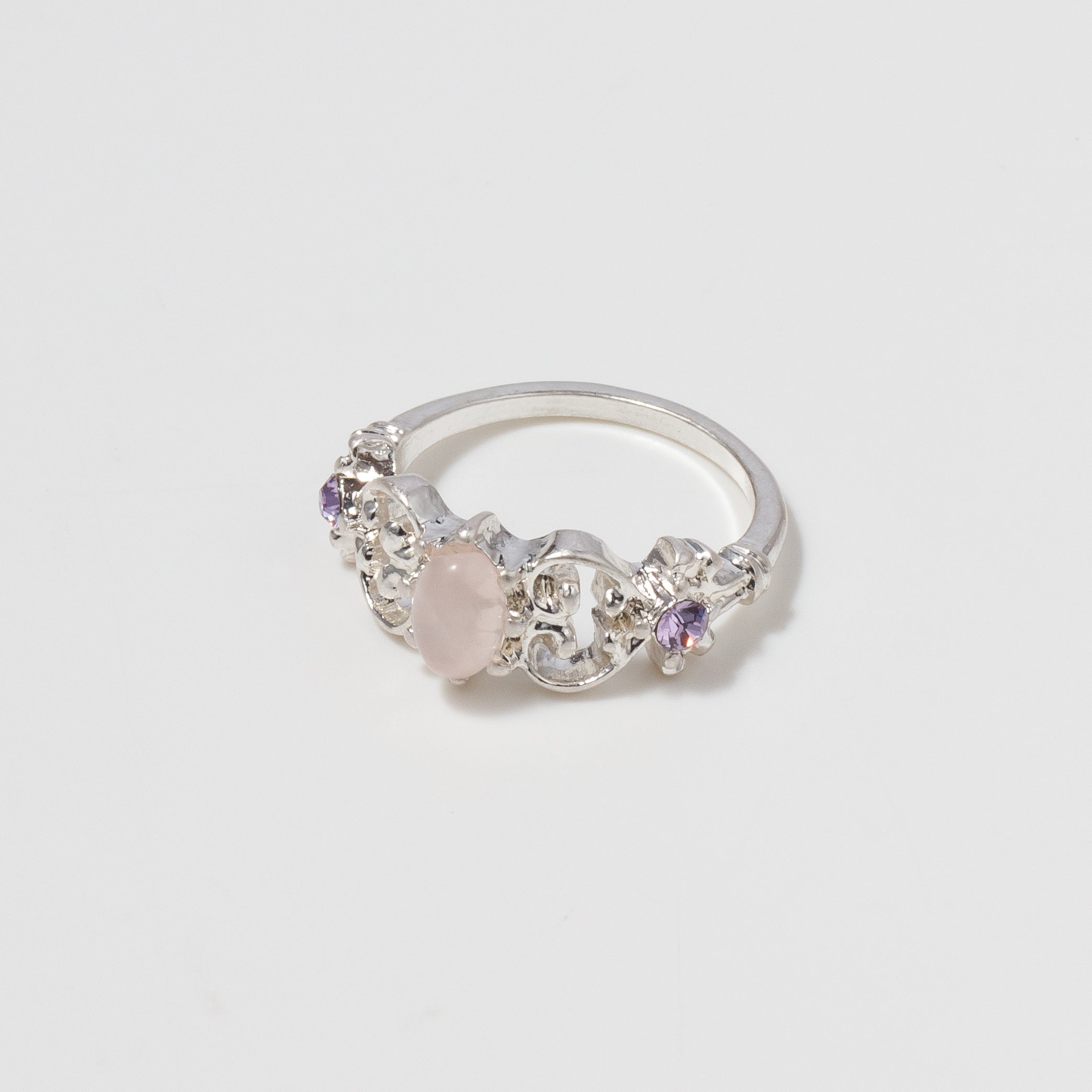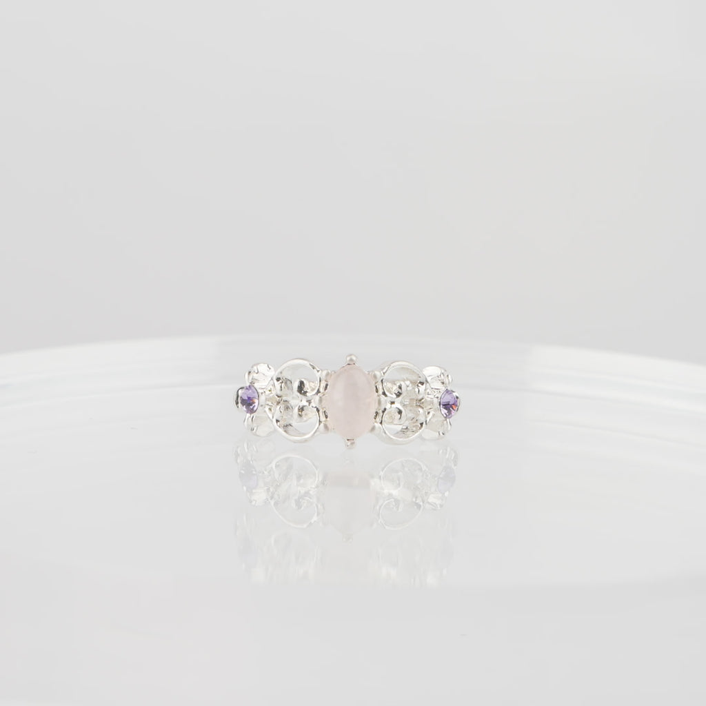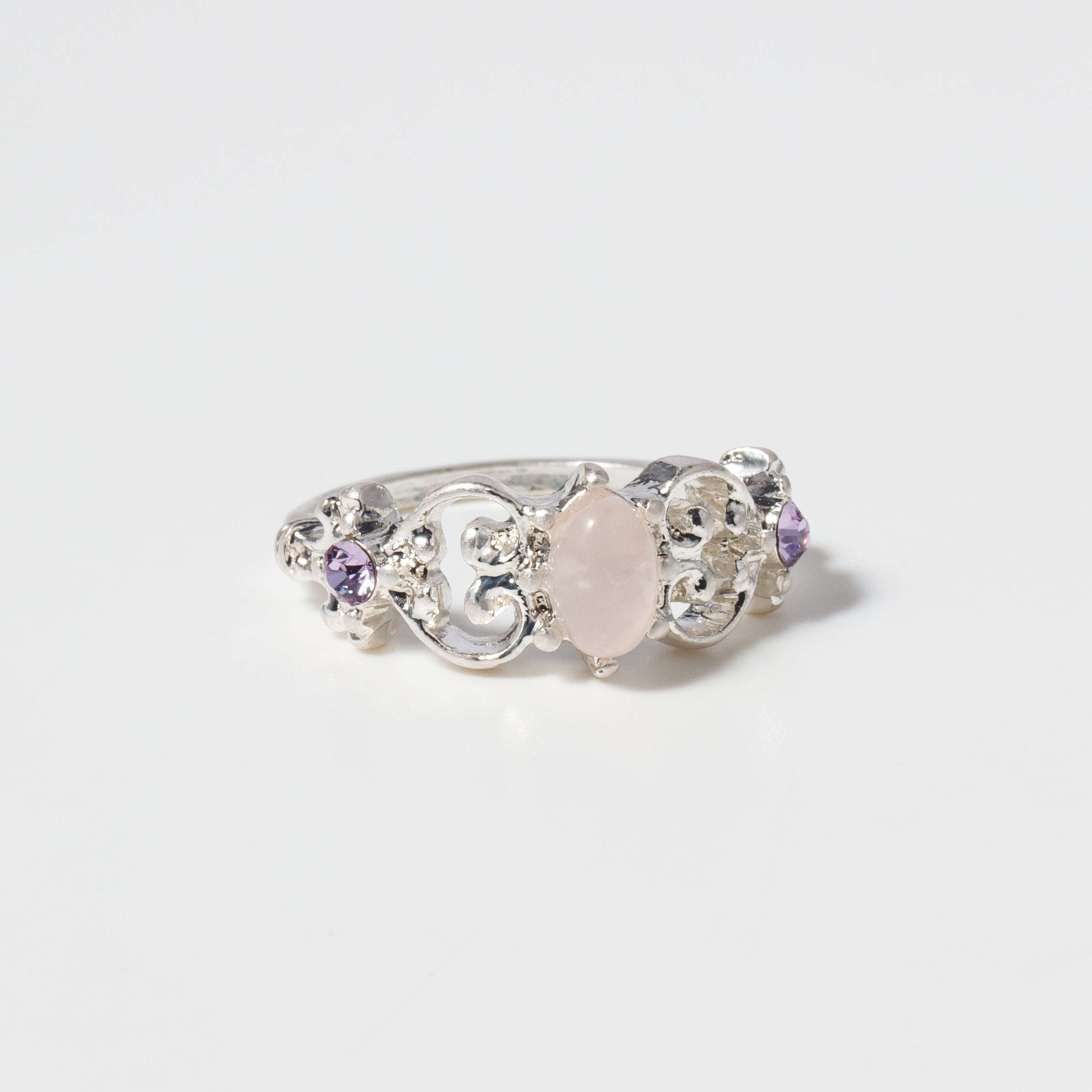 A key-design ring with rose quartz at the center and violet crystals on both sides.