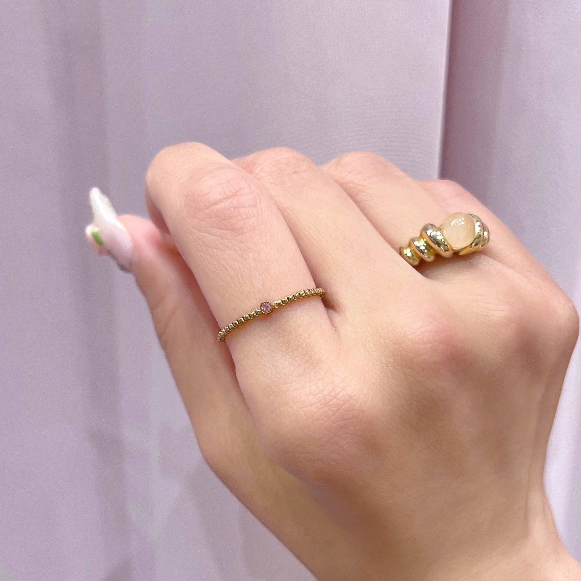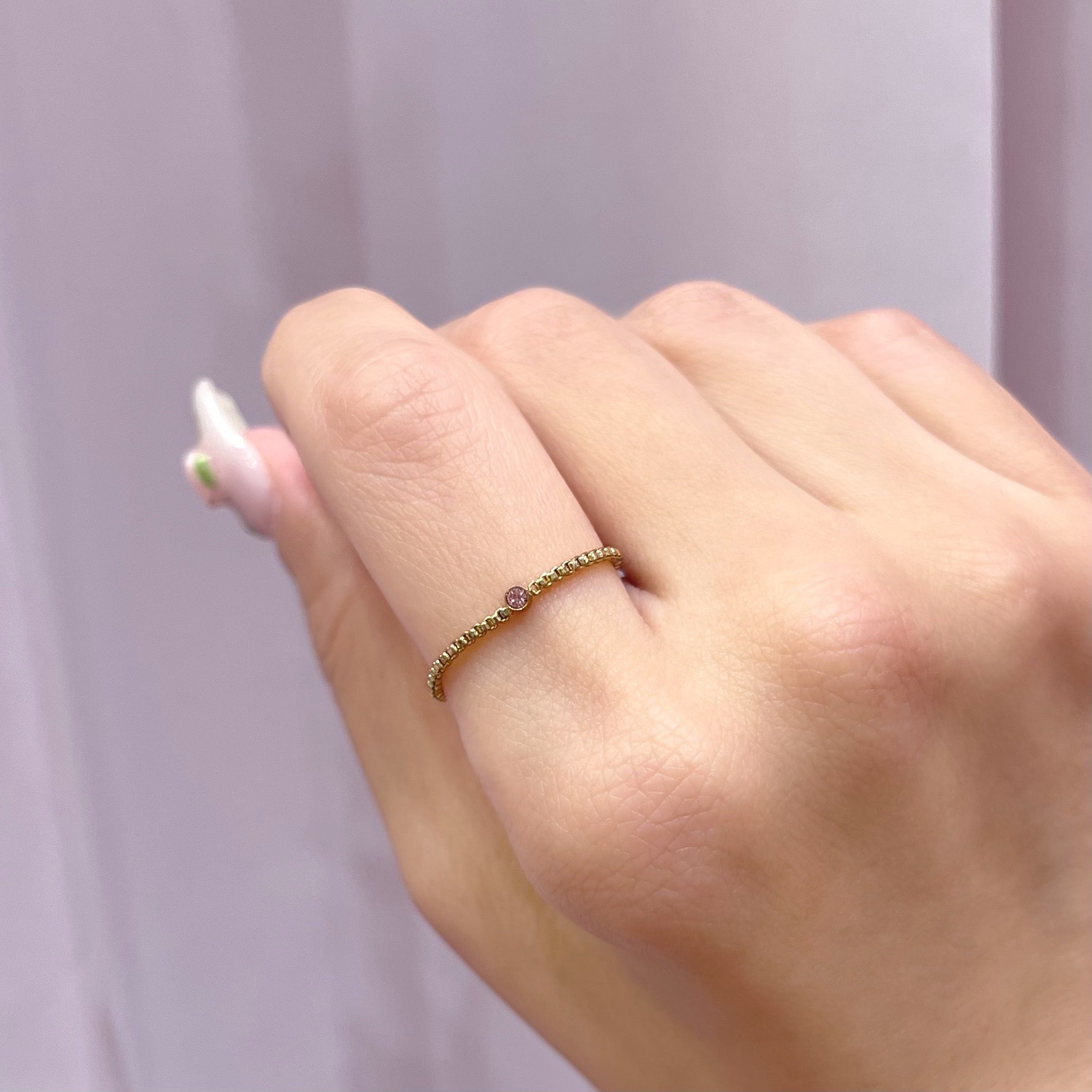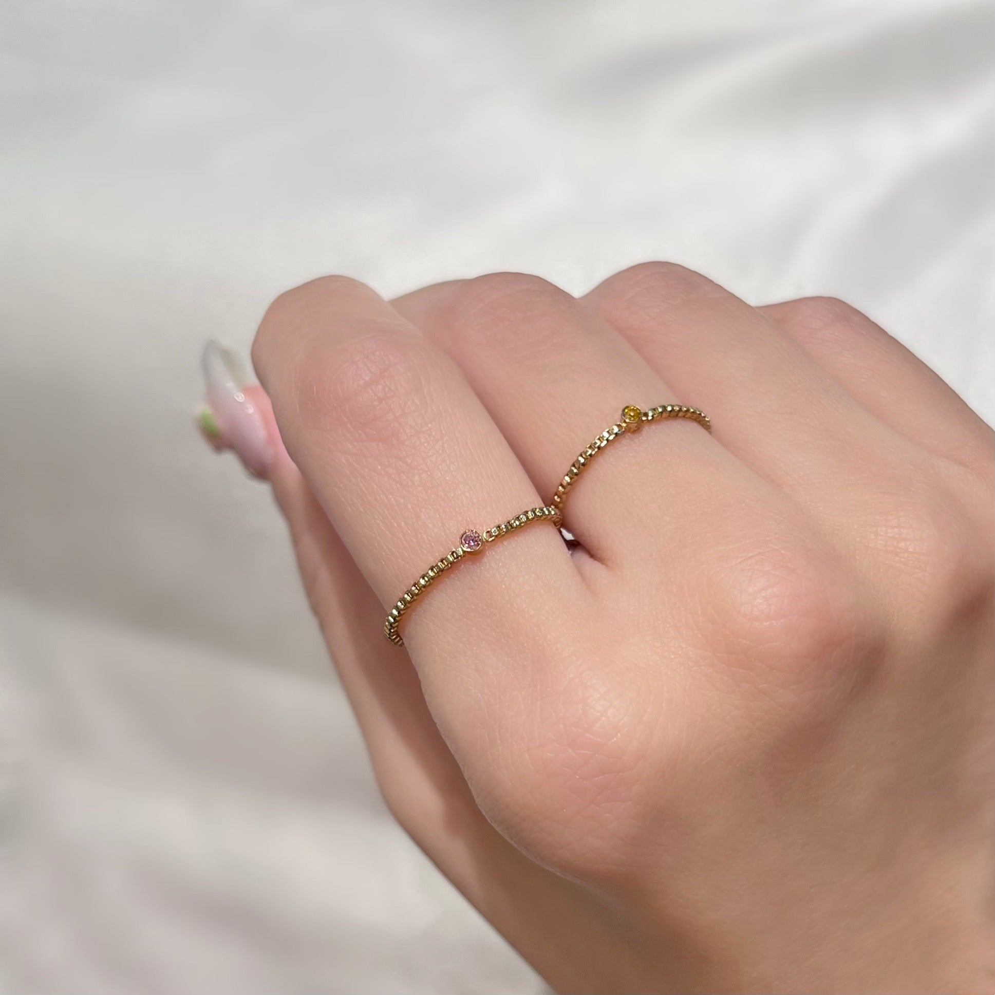 A chain-type ring made from surgical material that is hypoallergenic. A single pink crystal (rose) shines, giving the piece a simple yet striking presence. Available in 6 colors, it is recommended for layering or pairing. The metal color is light gold, shared among six colors.