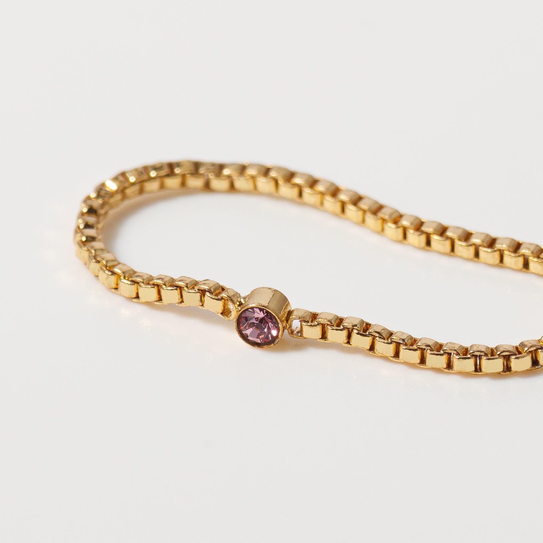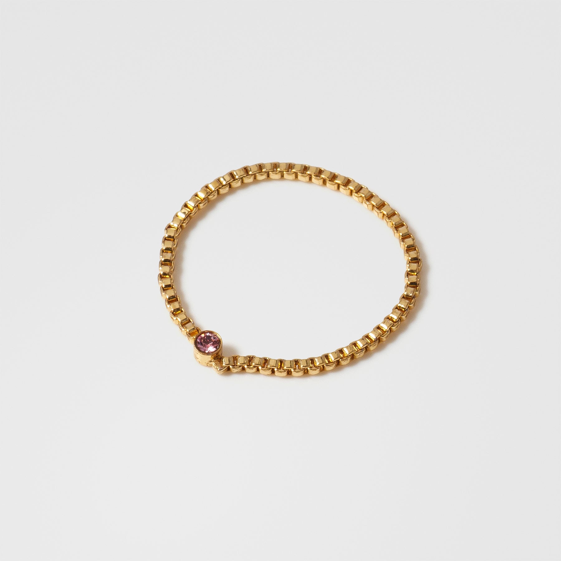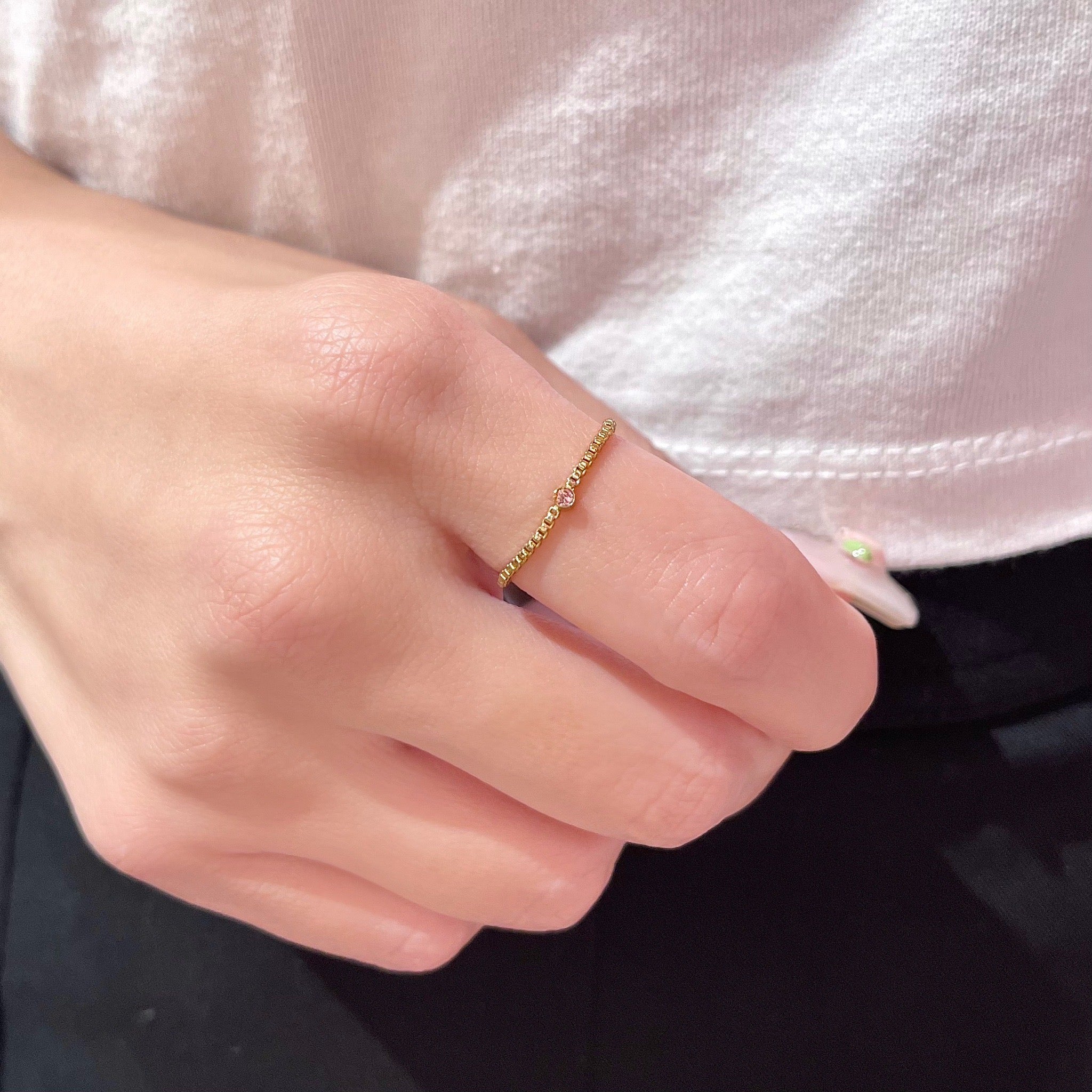 A chain-type ring made from surgical material that is hypoallergenic. A single pink crystal (rose) shines, giving the piece a simple yet striking presence. Available in 6 colors, it is recommended for layering or pairing. The metal color is light gold, shared among six colors.
