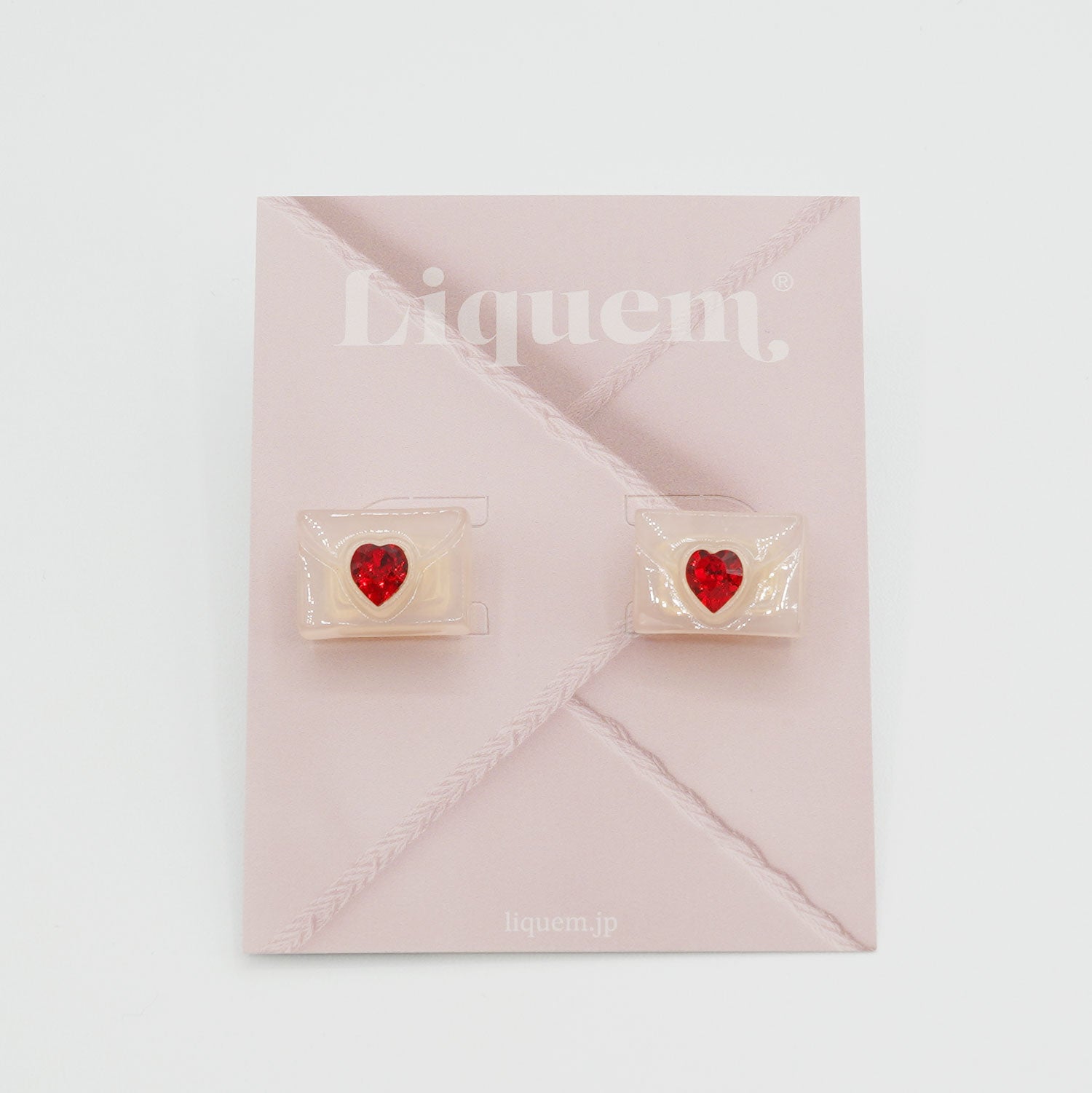 An iconic love letter motif on your ear. The letter that holds the classic bright red heart is a subtle beige pink with tiny powder glitter, creating a sophisticated depth within a girly look.