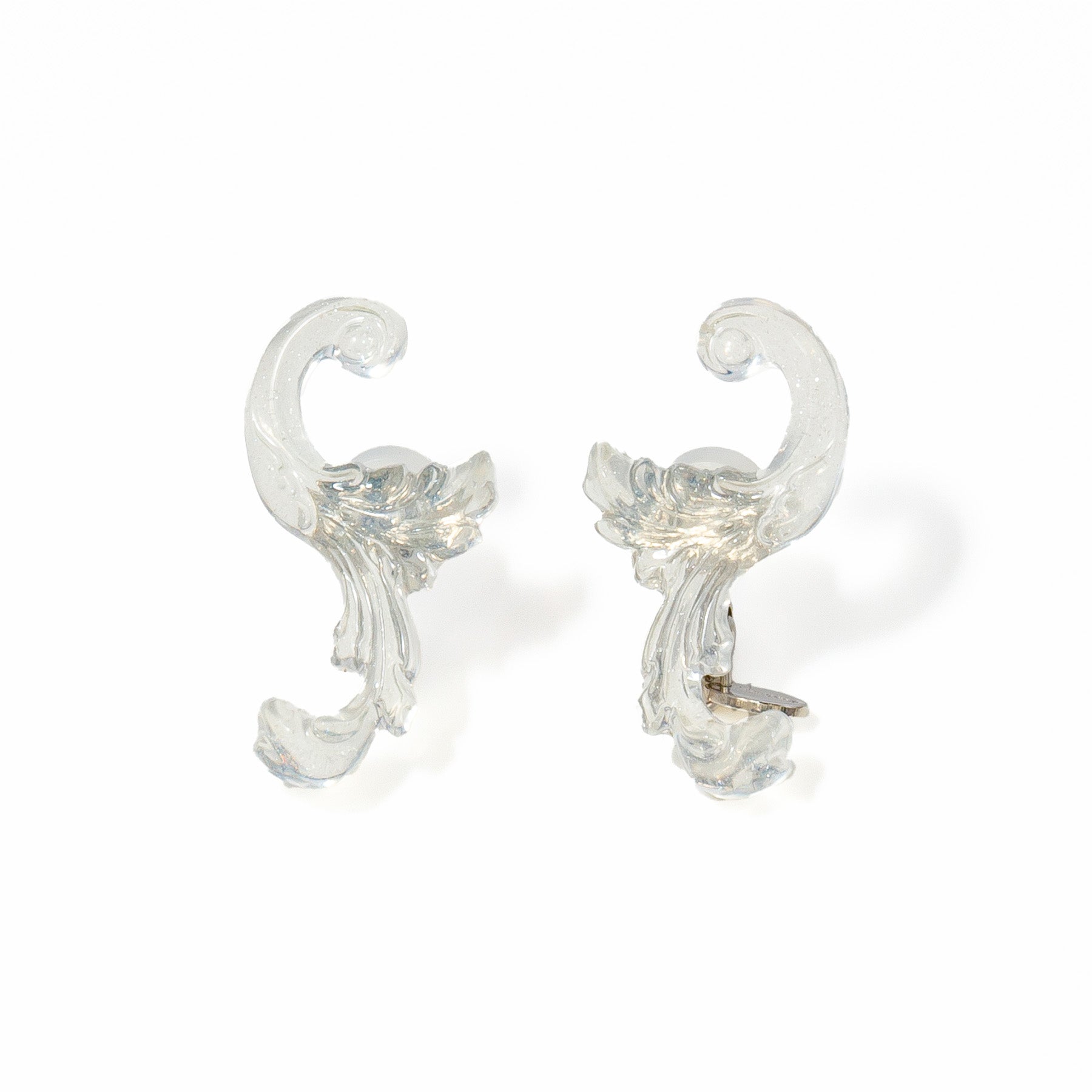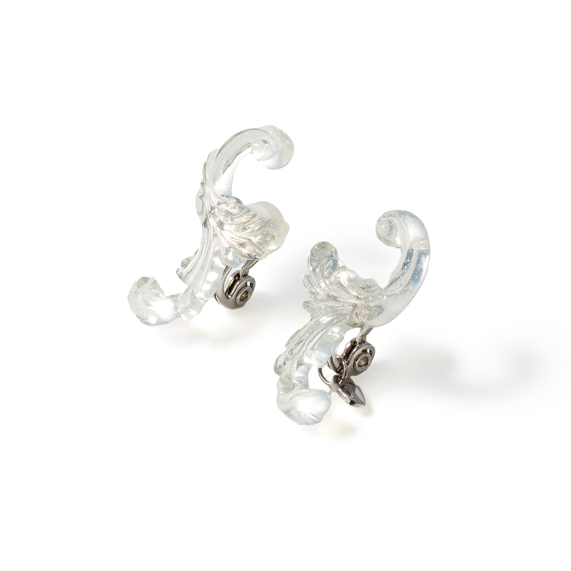 The Crystal Rococo Earrings are made with a transparent resin and feature the arabesque motif that was popular during the Rococo period.