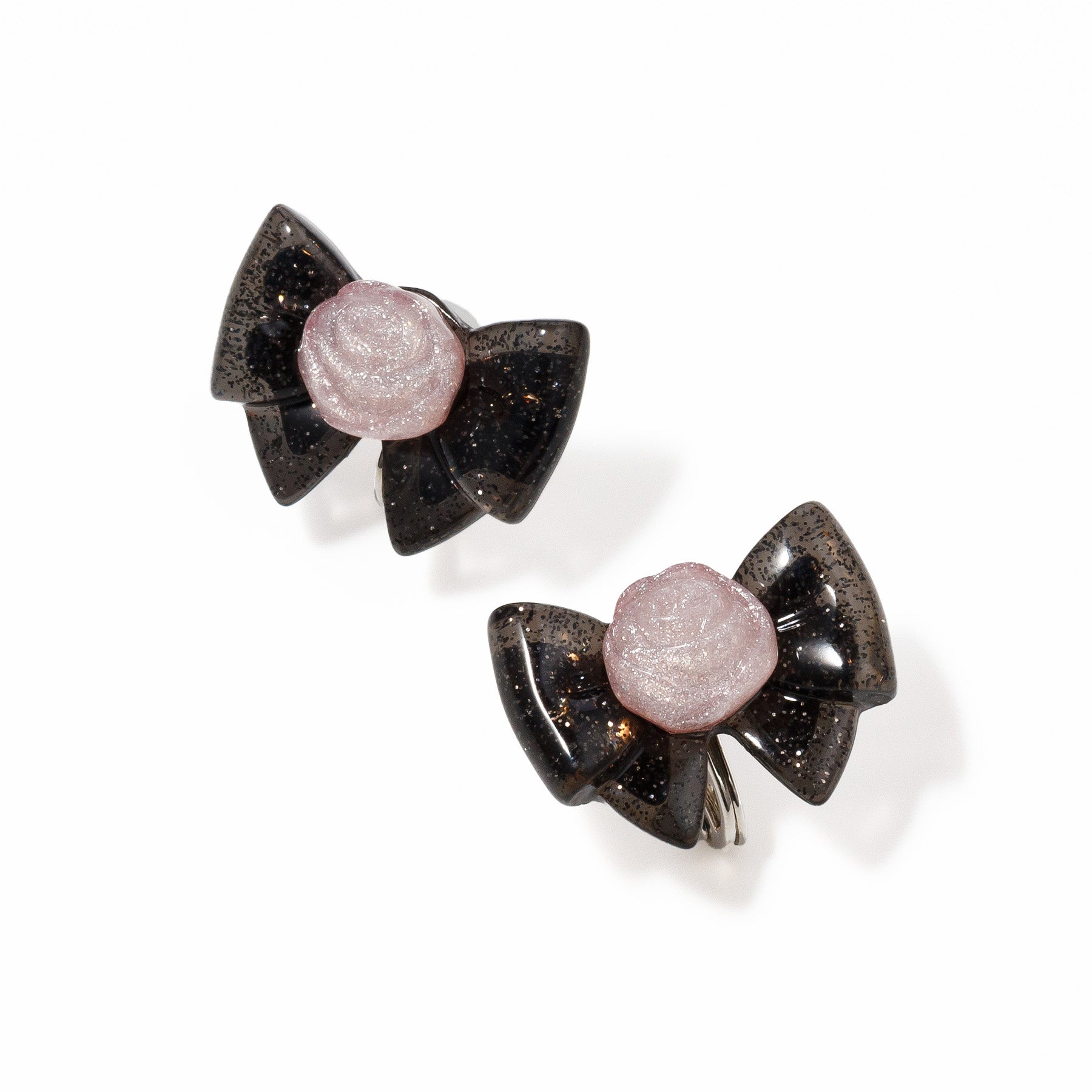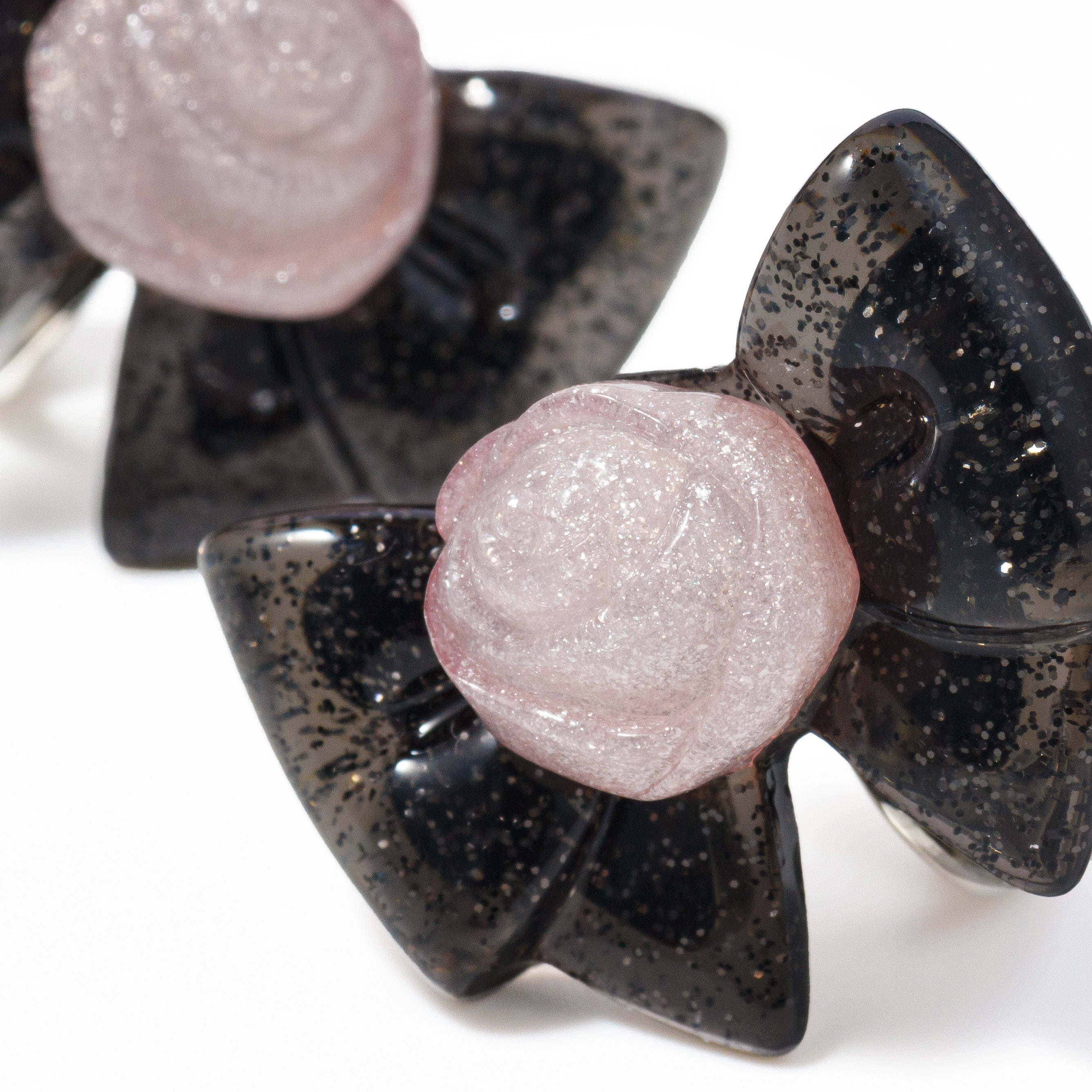 The ribbon part is black with scattered silver glitter, and the rose part has tiny glitter hidden inside.