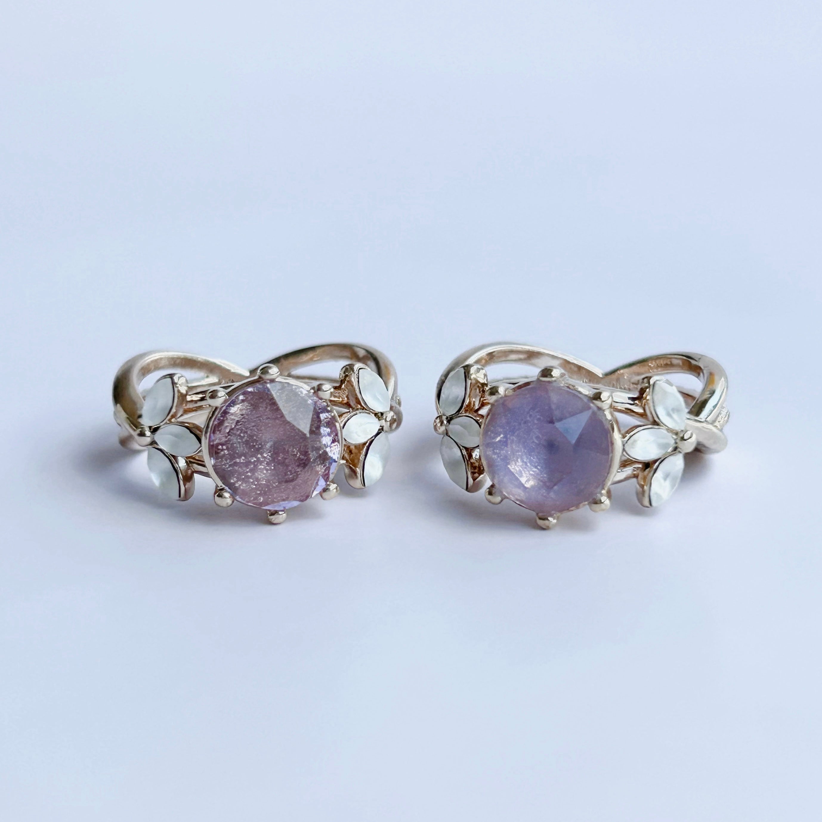 A violet crystal without foil is set in the center, expressing the transparency of a jewel. Frosted crystals are placed on both sides, catching light softly like frosted glass.