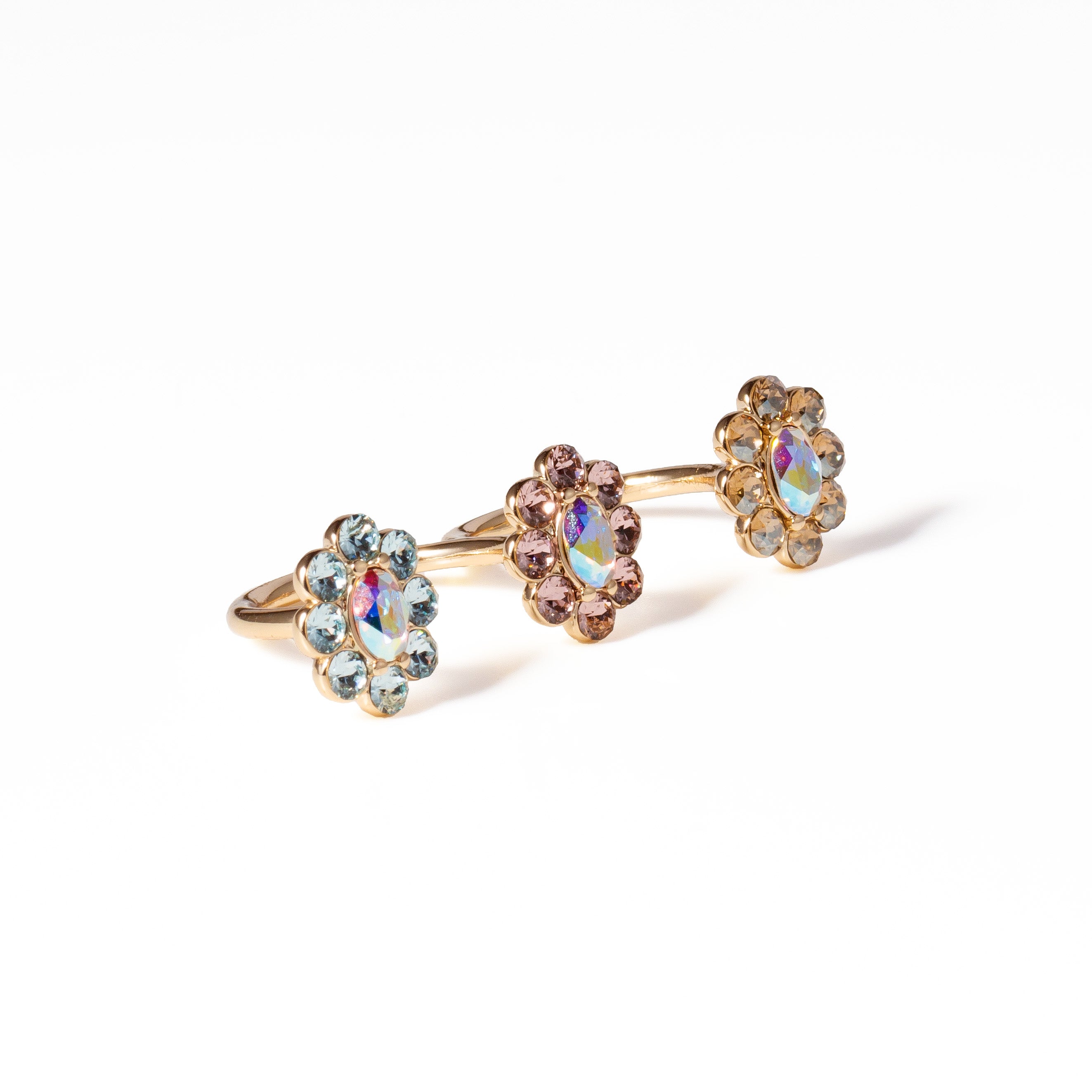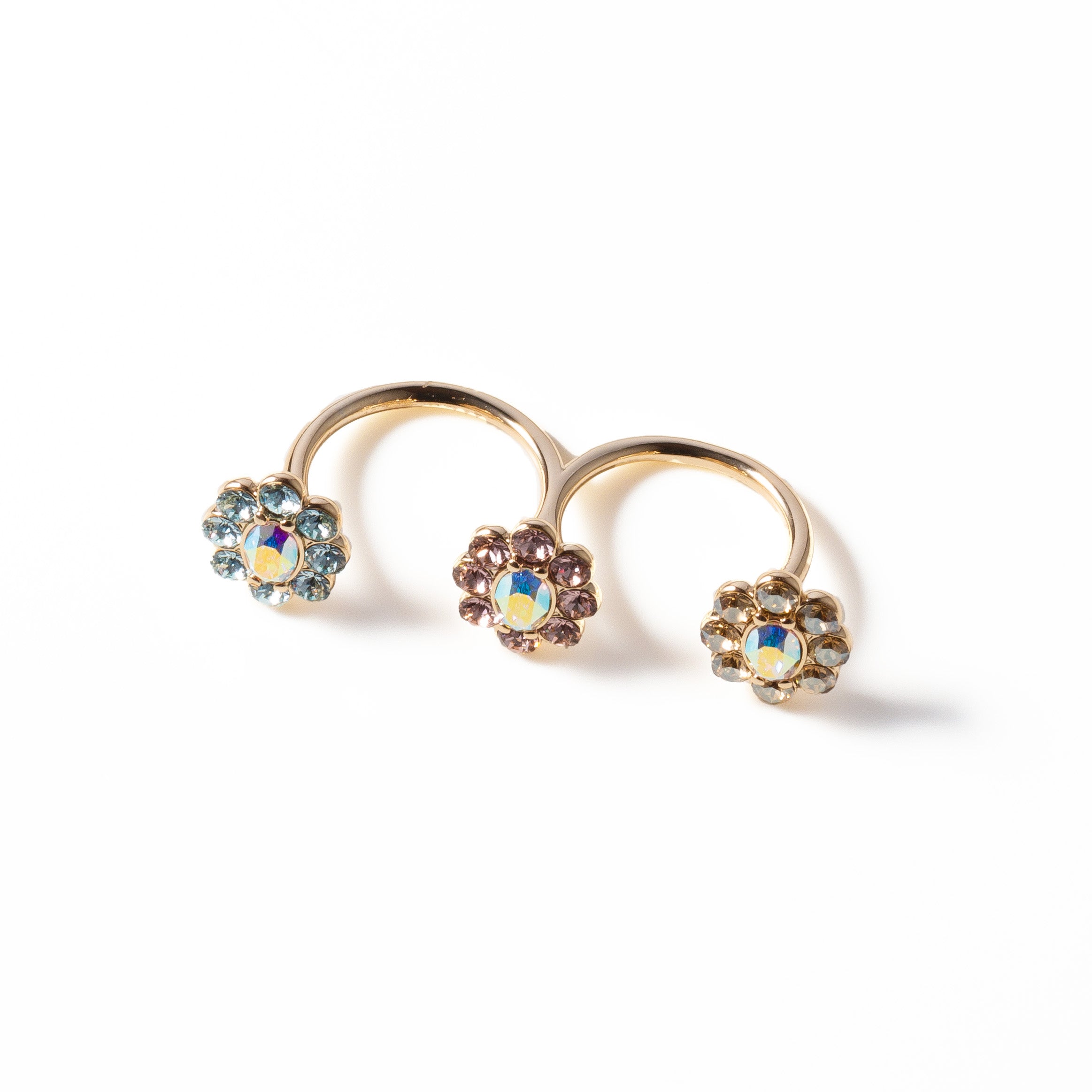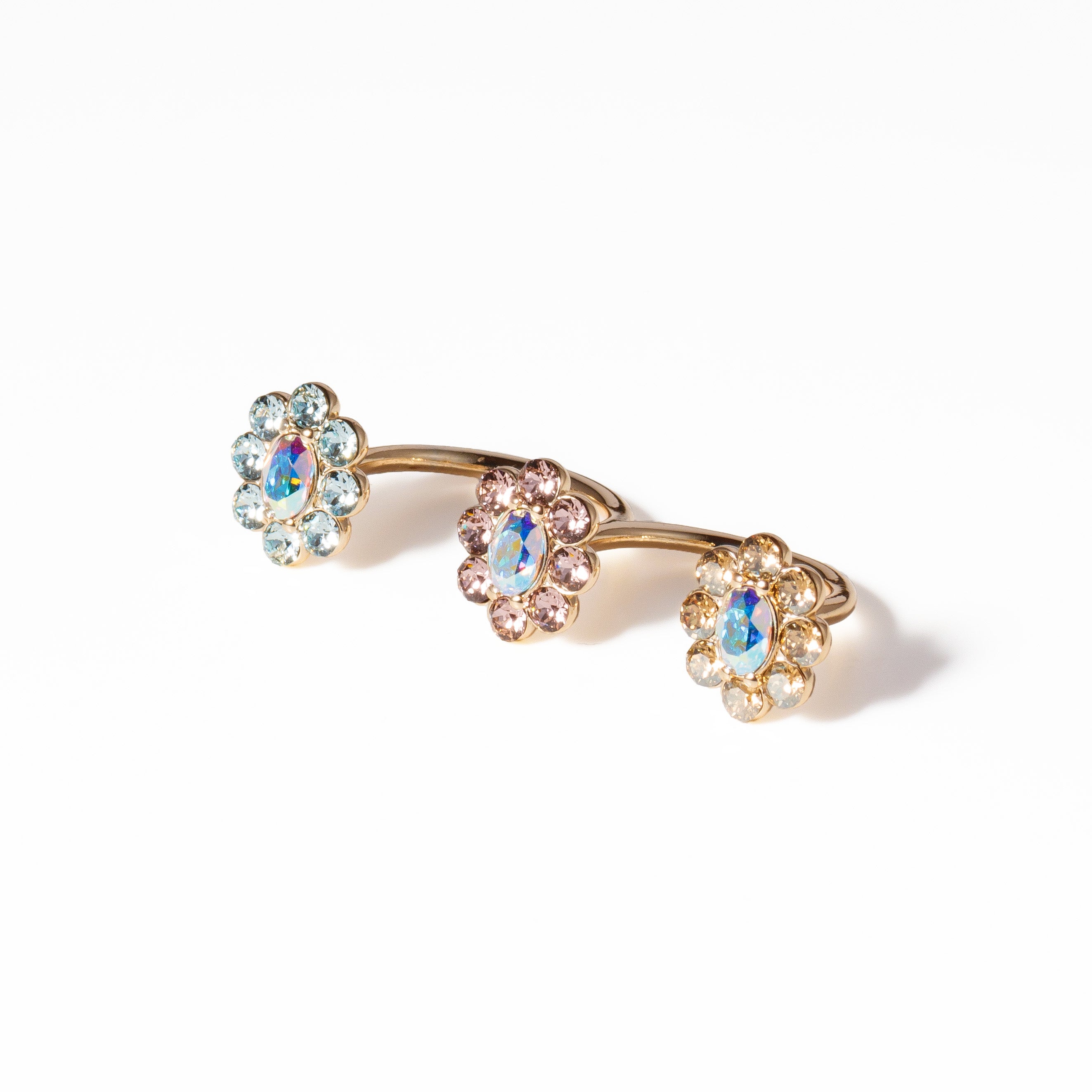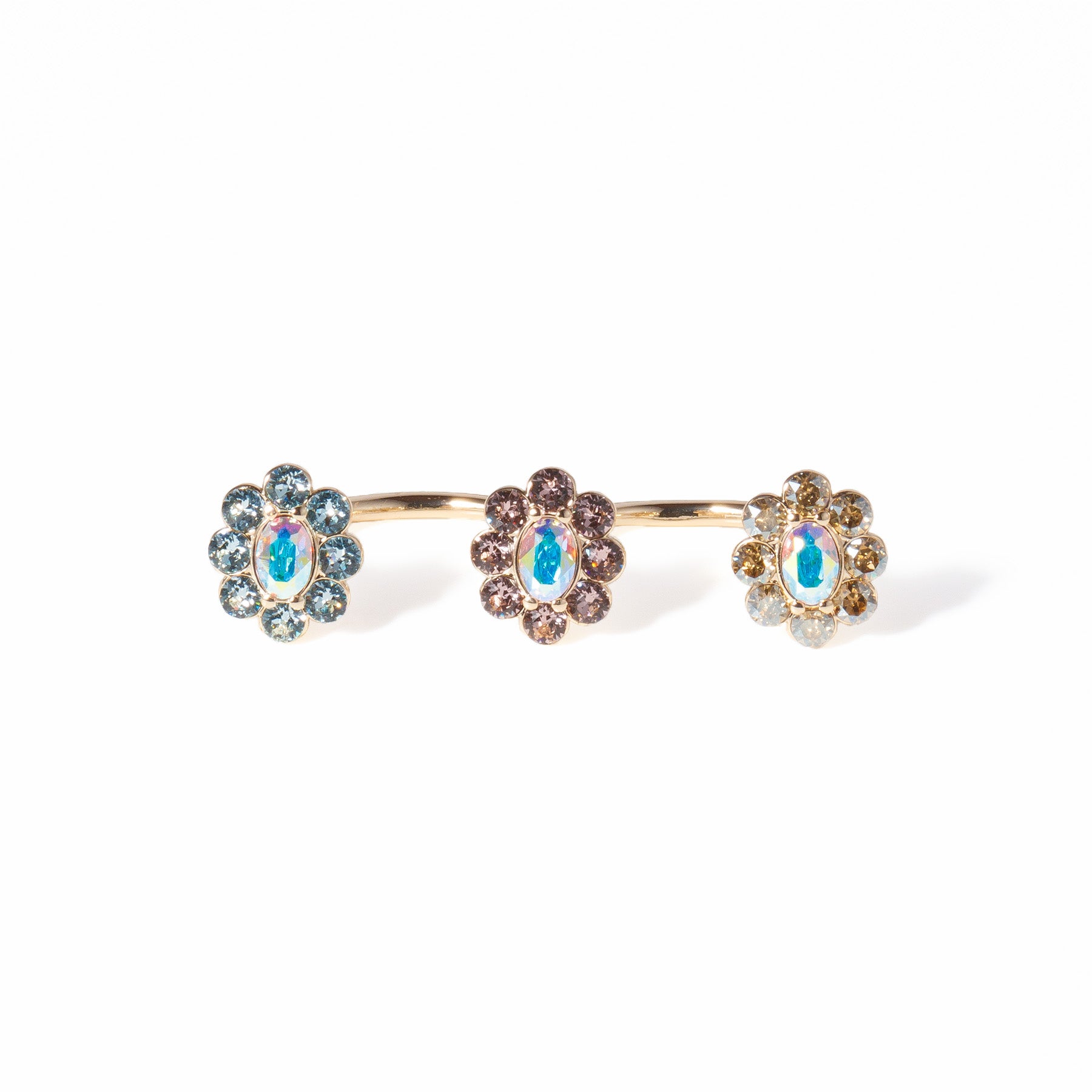This "Trois Bloom Ring" was born from this background. The three colored flowers nestled together tell a little story on the wearer's fingertips.