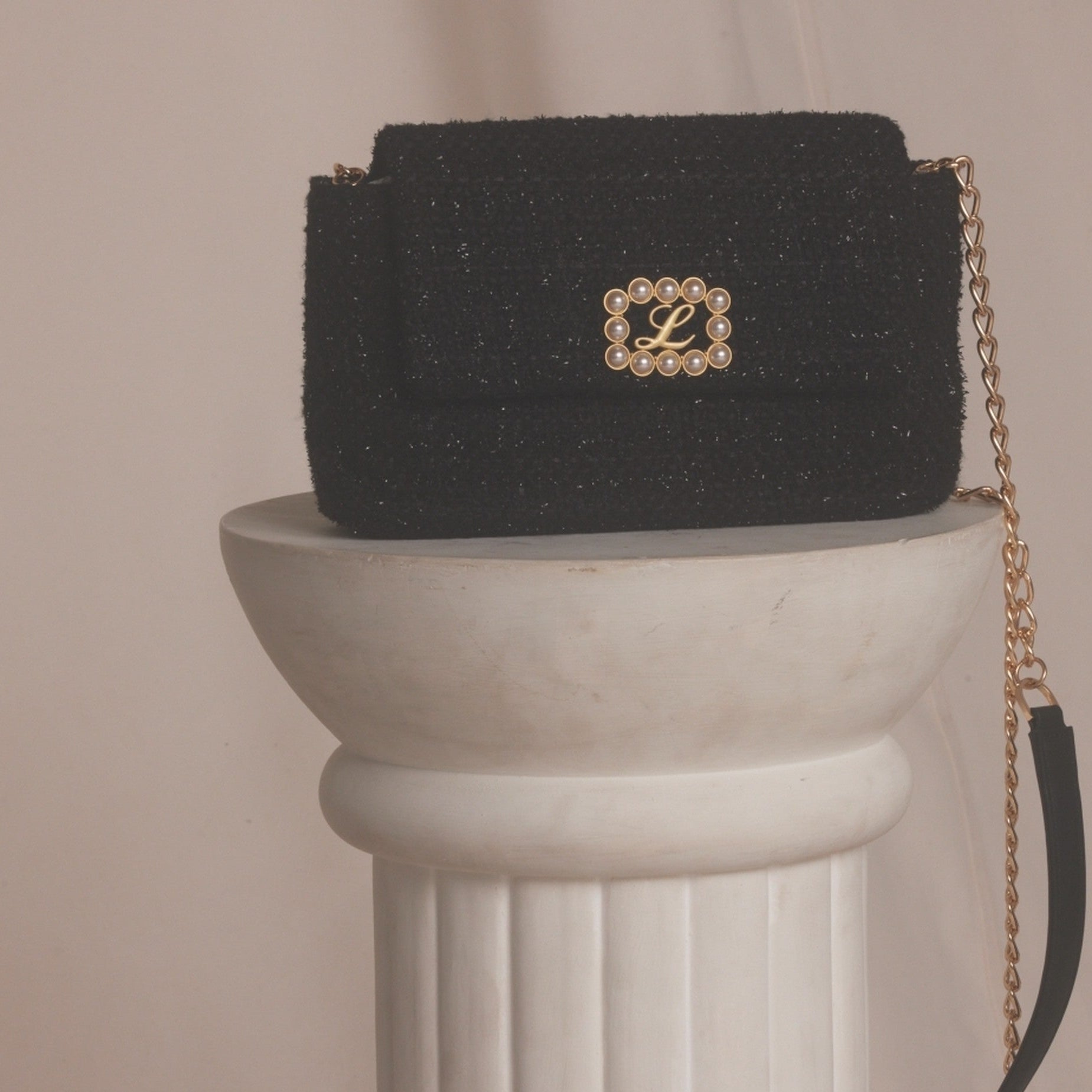 Tweed shoulder bag with L brooch.