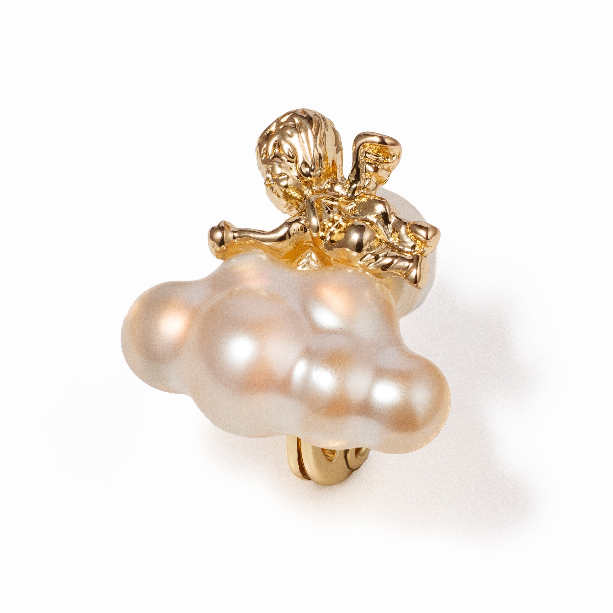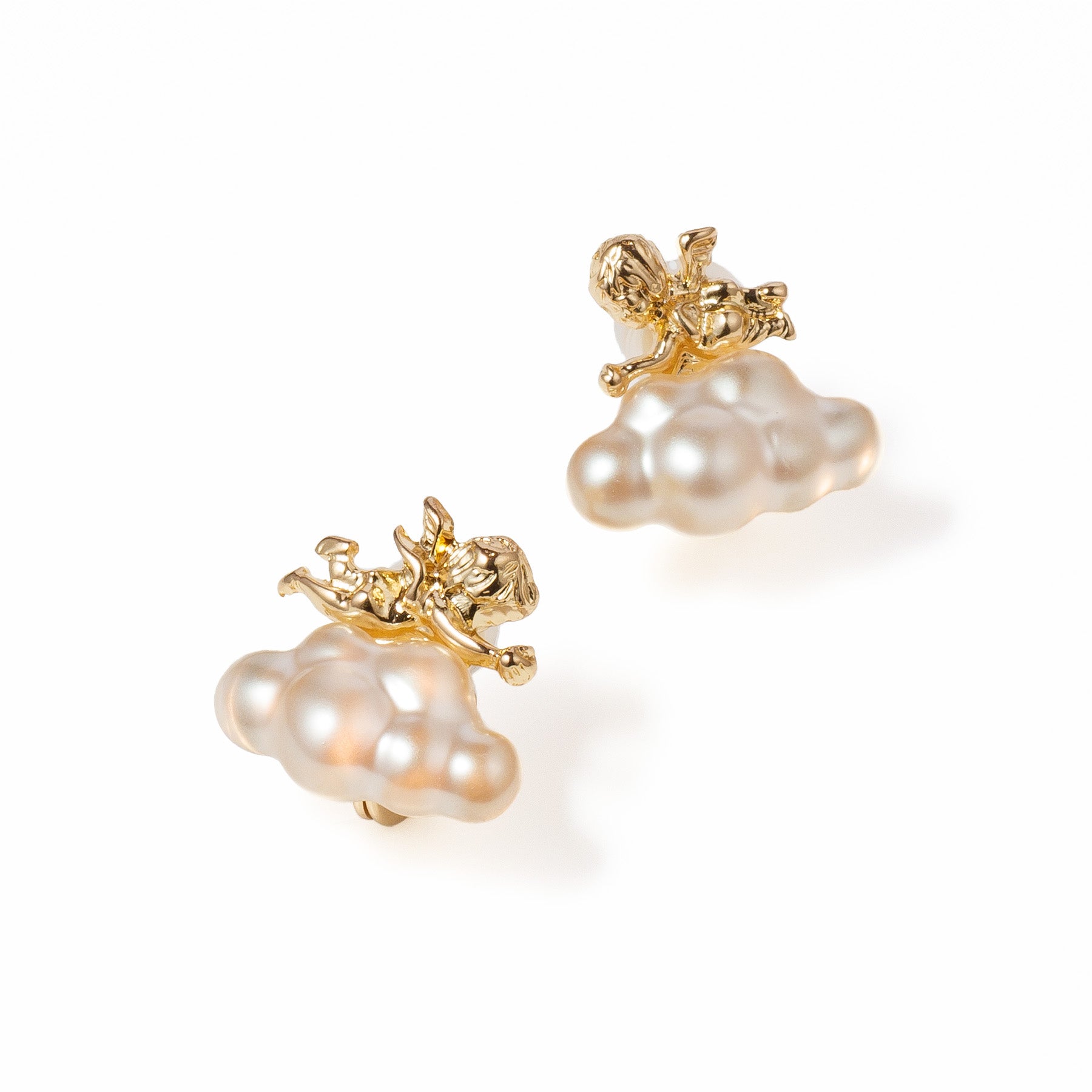 These earrings are inspired by the angels depicted in Rococo murals. A small angel with a different expression on each side descends from a plump cloud made of pearl-painted resin. The unique design, while featuring a classic motif, is playful and adds a touch of soft elegance to your ears. The metal color is gold.
