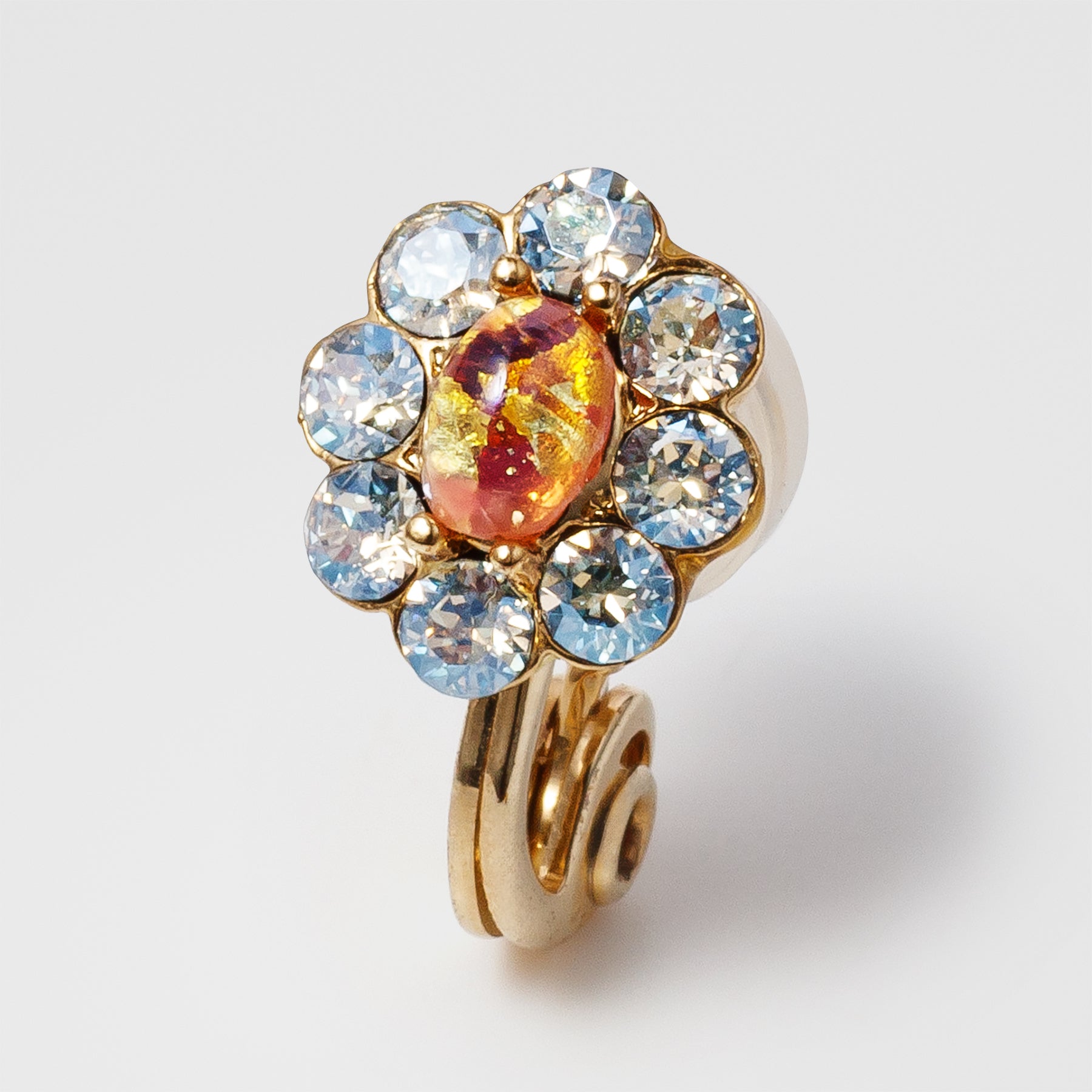 The vintage glass in the center, which matches the ring, is a rare, discontinued color from Preciosa. The soft orange nuances that shimmer with every light are like the first sunrise rising from the horizon, bringing a deep brightness to your heart.