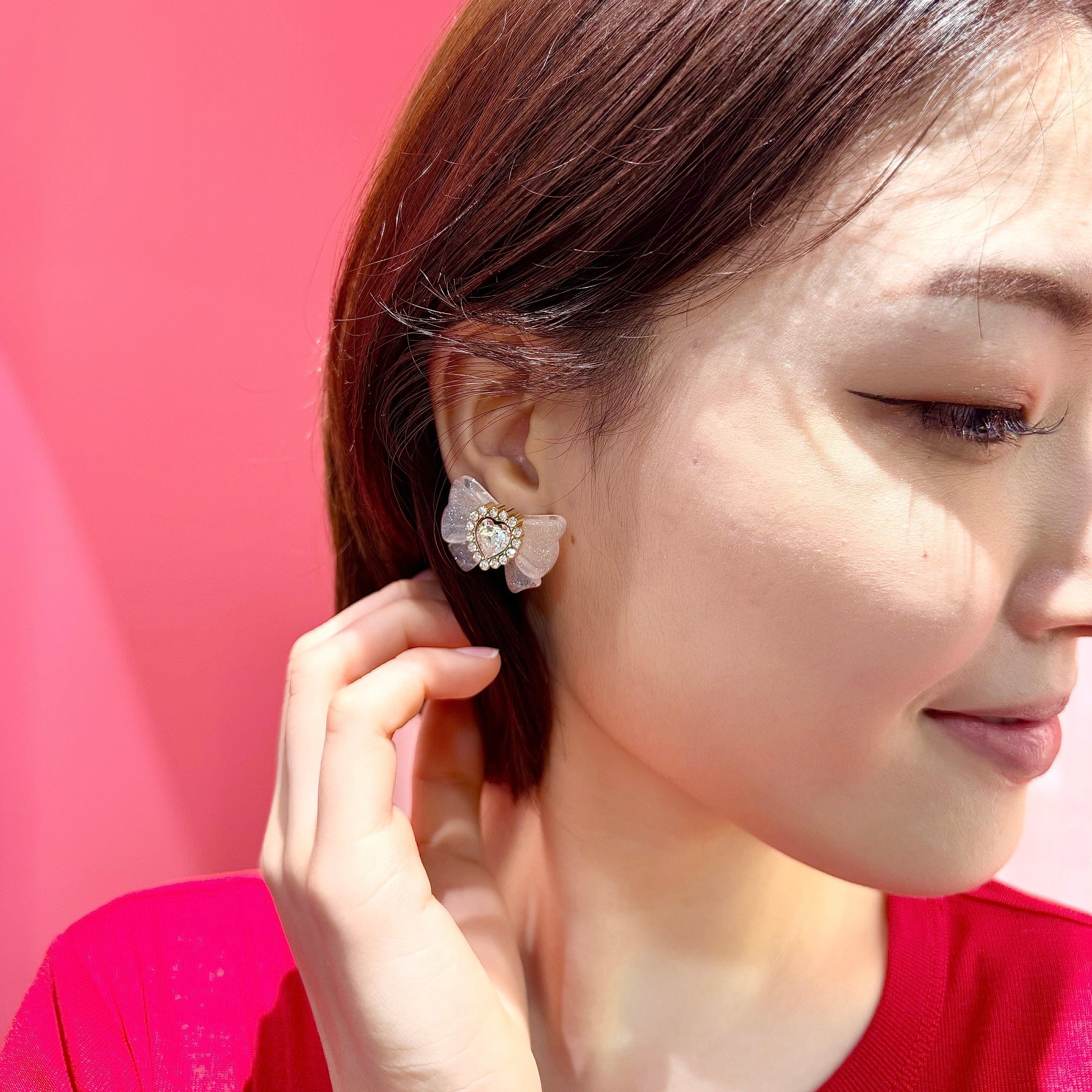 The white resin ribbon, which contains a subtle hint of tiny glitter, shines softly and elegantly in the light. At the center is a large, sparkling crystal heart. The result is a design that is the epitome of "cuteness," radiating an overwhelming sense of excitement.