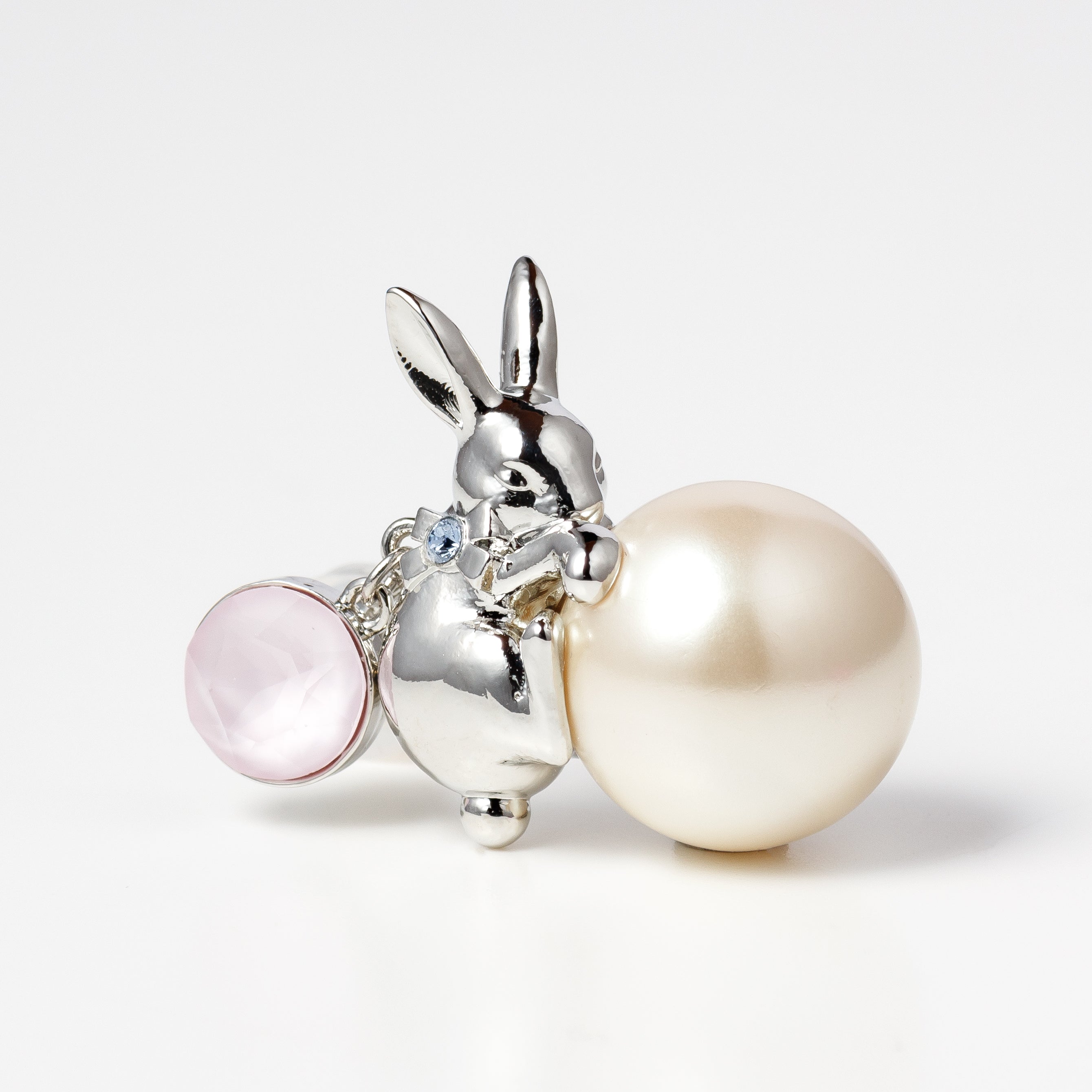 このアクセサリーを見た瞬間に、ふっと「優しい気持ち」になってもらえたら。そんな願いを込めて、うさぎがパールを抱きしめてお昼寝しているような、身につける人によって、自由にその物語を膨らませて楽しんでいただきたい一品です。