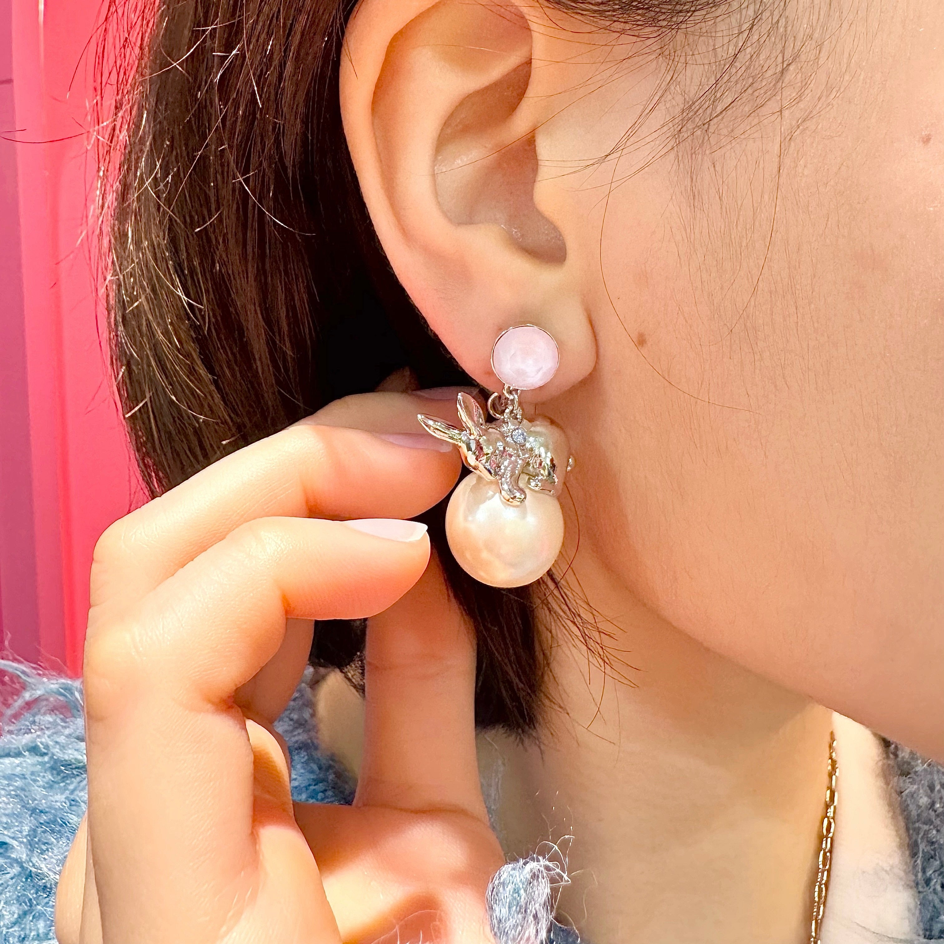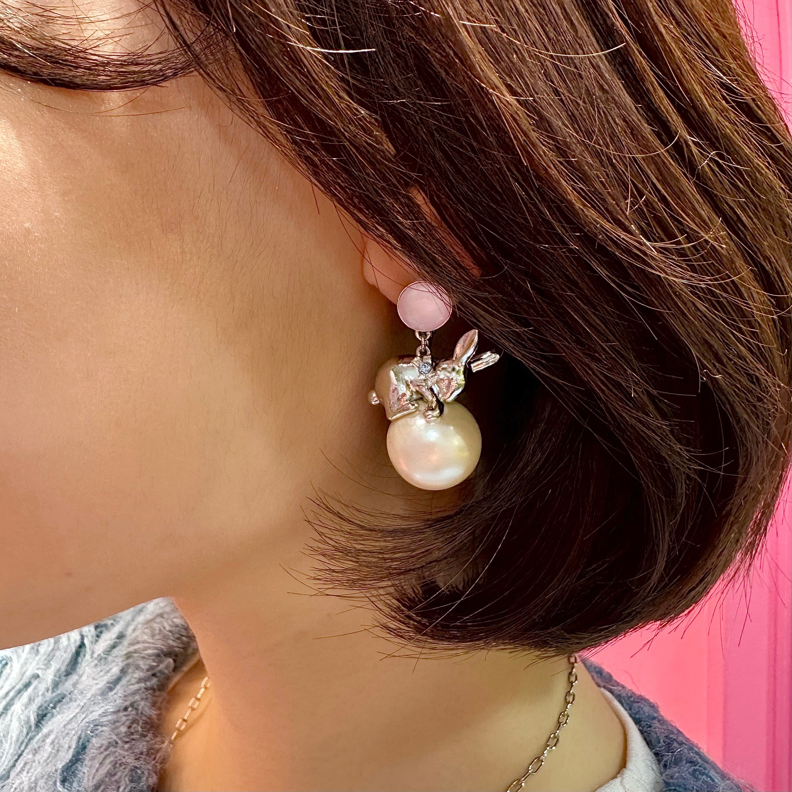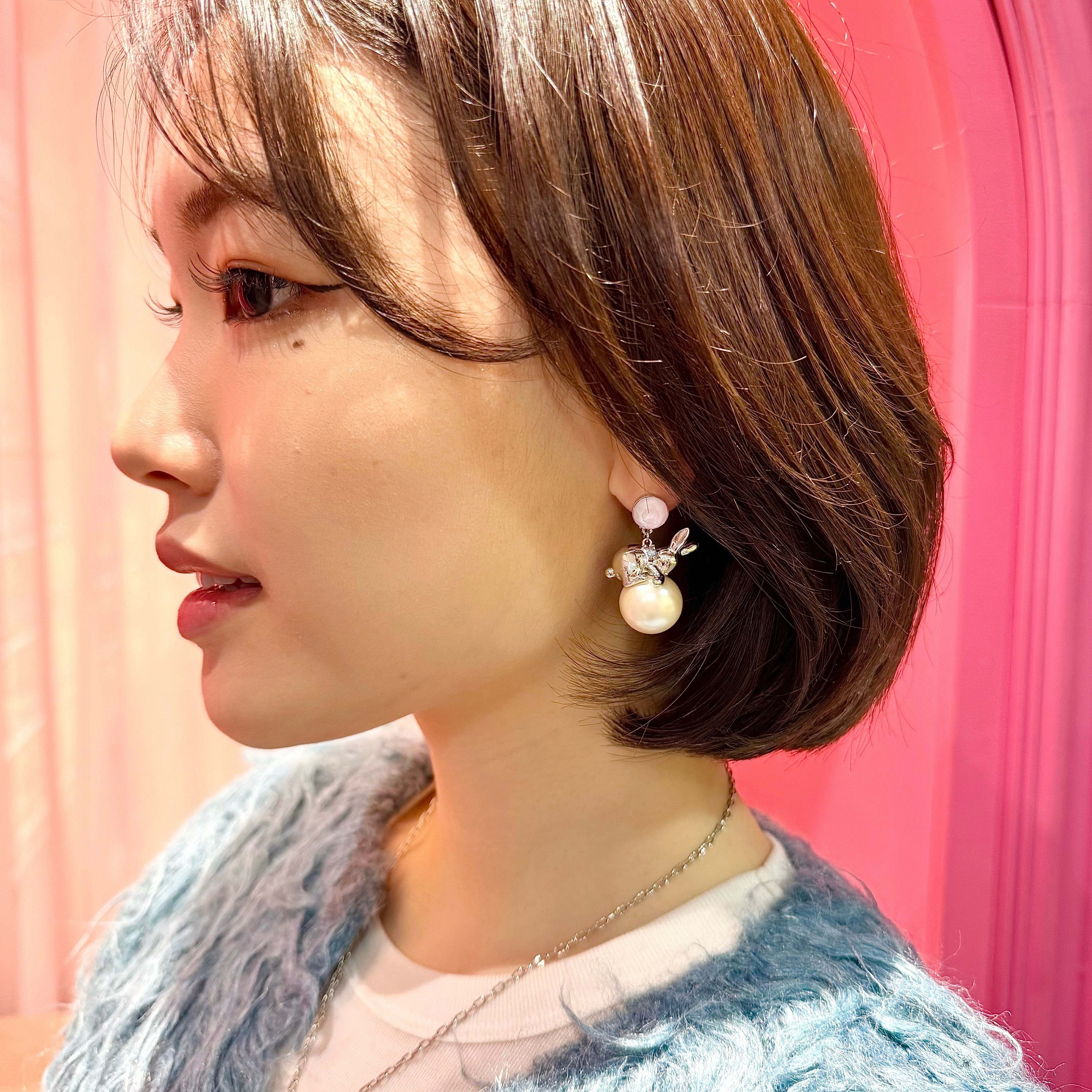 そんな穏やかで愛らしいワンシーンを耳元に宿す、特別なアイテムです。うさぎの背後には、まどろみの中の柔らかな光をイメージした、パウダリーピンクのクリスタルを添えました。心にポッと灯がともるような優しさに満ちたデザインです。