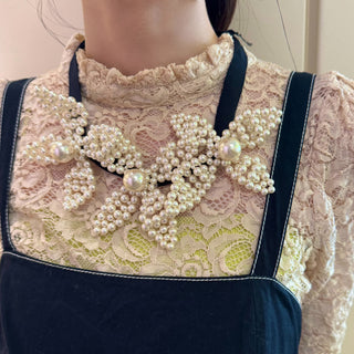 パールで編んだ大きなお花がネックラインを飾るリュクスなネックレス。抜け感とモードの両方が手に入ります。優雅なレイをイメージしており、存在感たっぷりなのに、パールのやさしさで軽やかにまとえるのも特徴。1つのお花に3サイズの花びらを4枚使用し、ニュアンスをつけています。*こちらの商品は箱に入れてお届けします。
