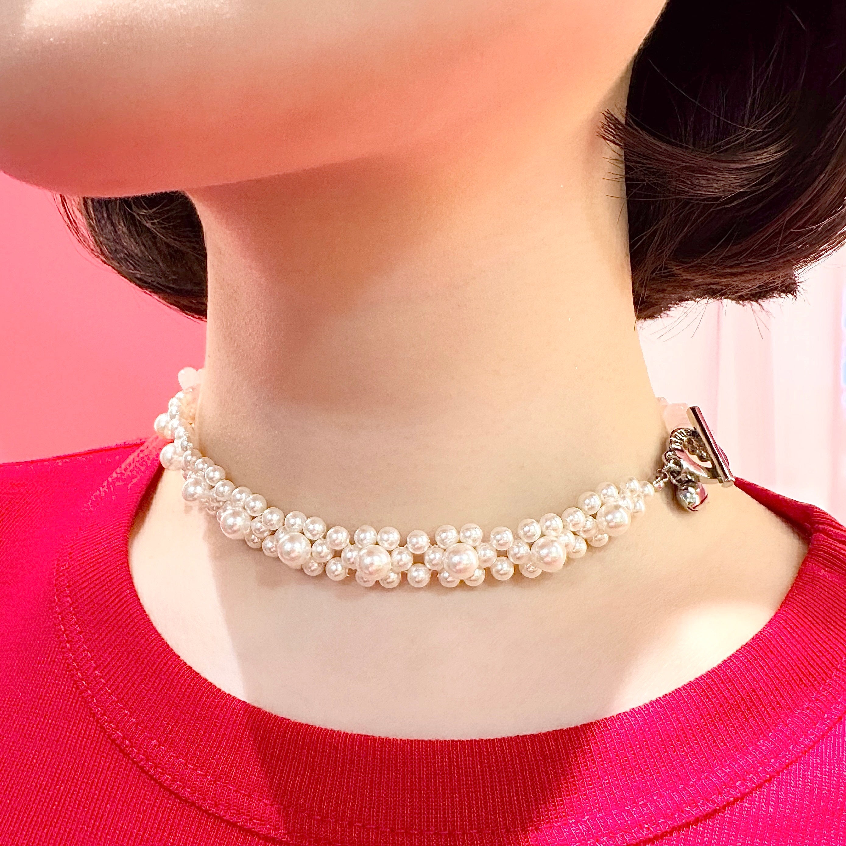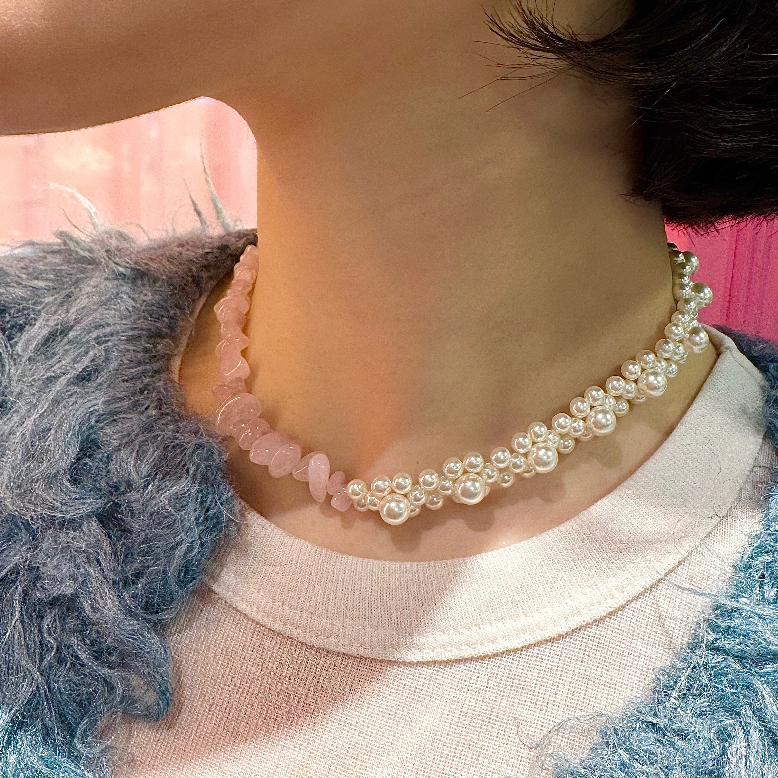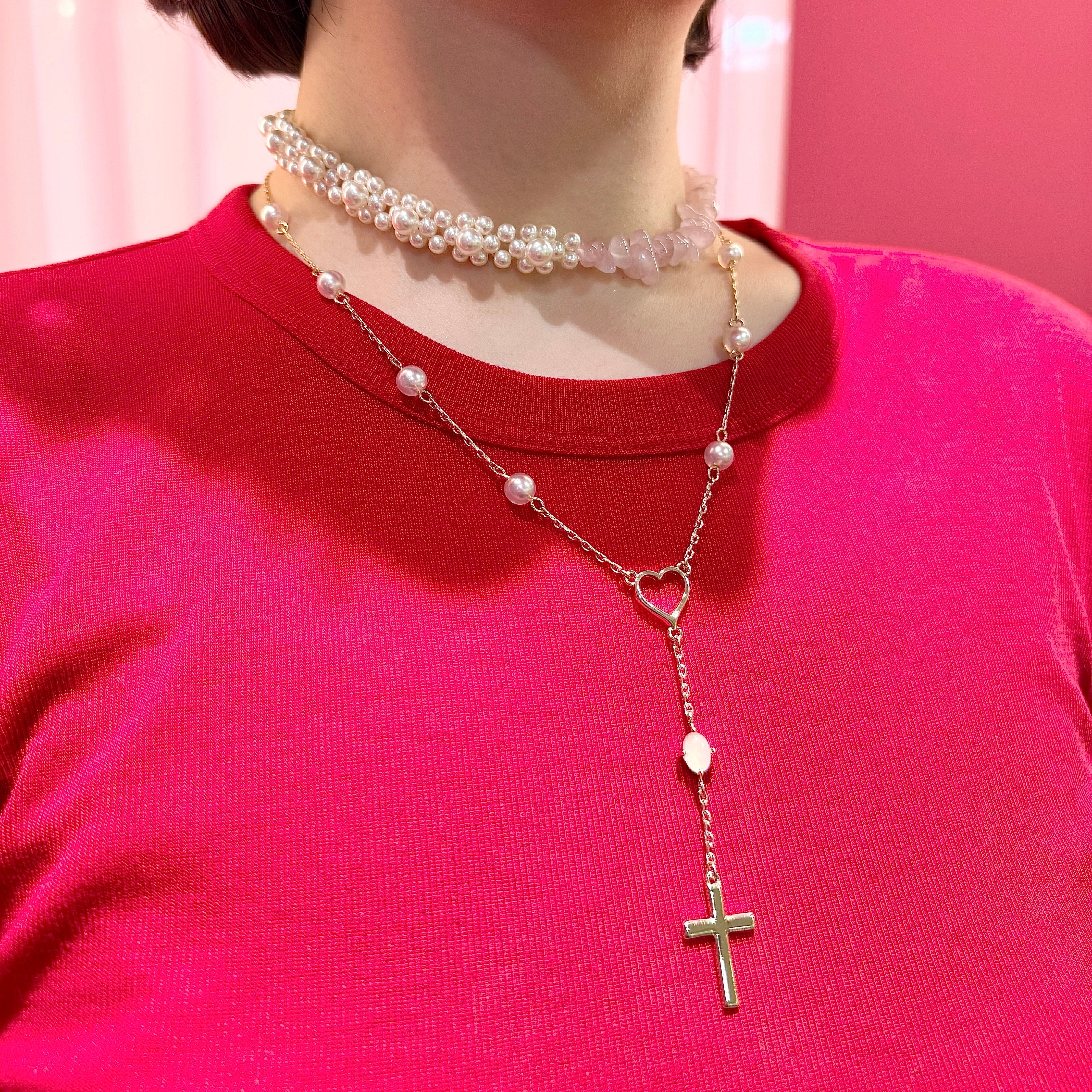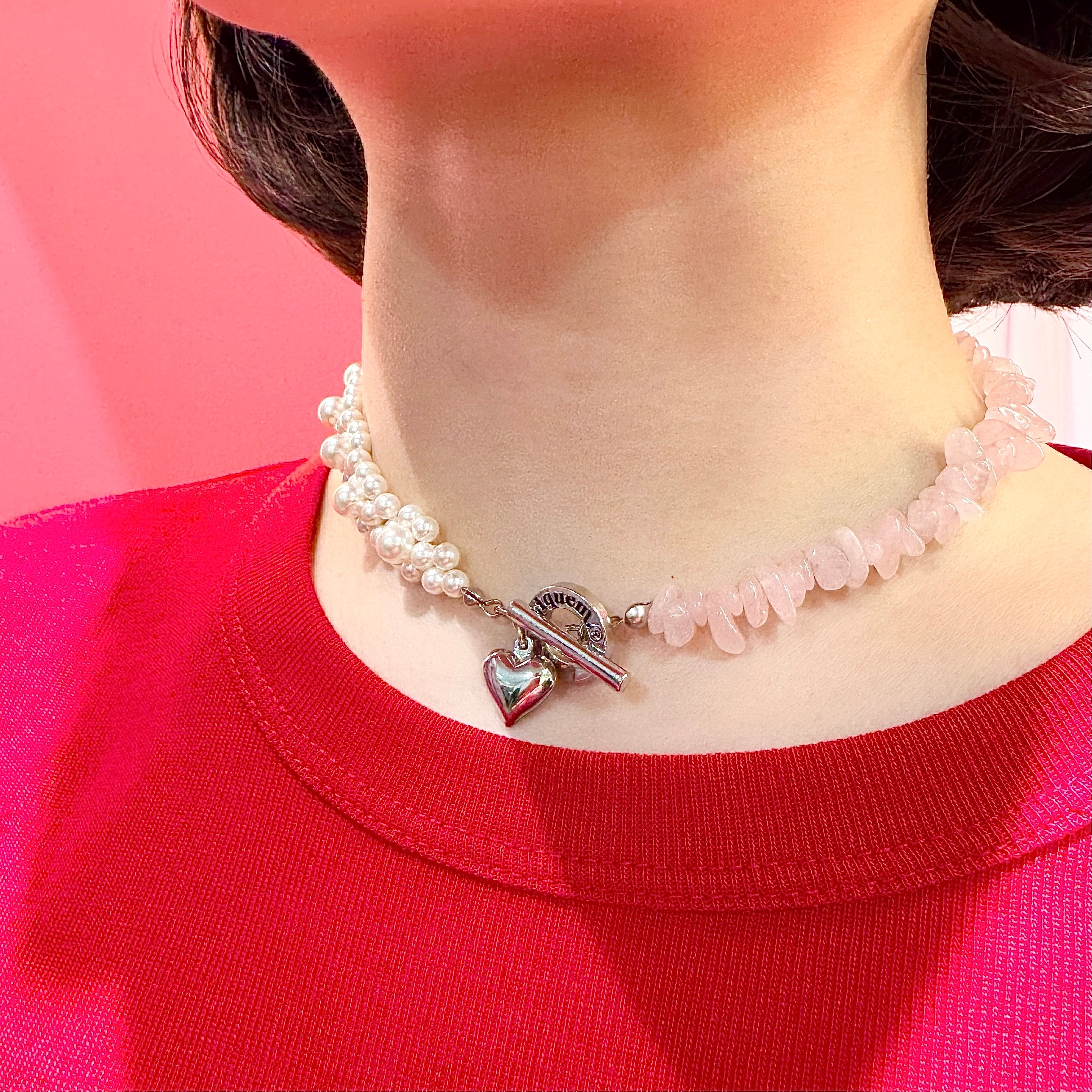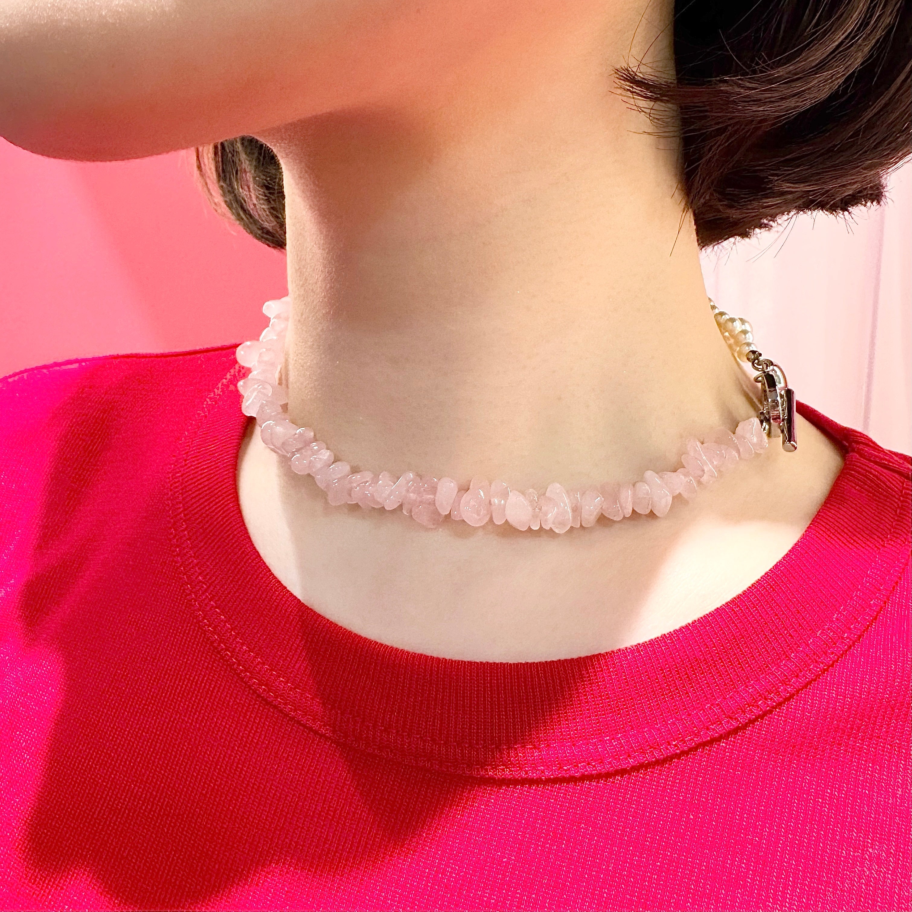 その日の「自分」に合わせて見せ方を選べる汎用性の高いネックレスです。ガーリーなブラウスにはパールをメインにして上品に、カットソーやスウェットなどのカジュアルなスタイルにはローズクォーツを覗かせて抜け感を出したり。身に纏うたびに、ふと自分を労わる優しさを思い出させてくれる、特別な存在になるはずです。