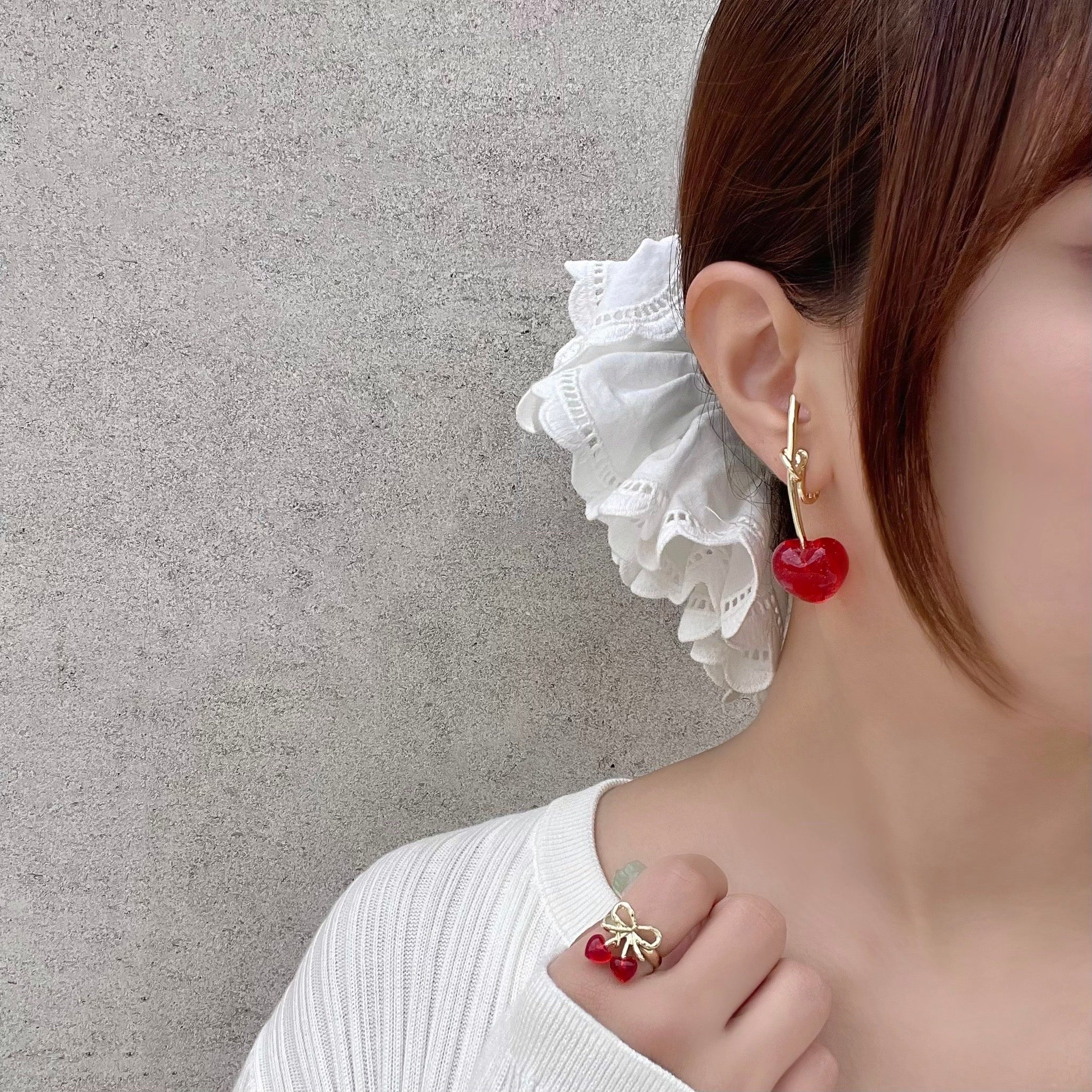 ピアスやネックレスも揃えて、甘く爽やかなコーディネートを楽しんで。