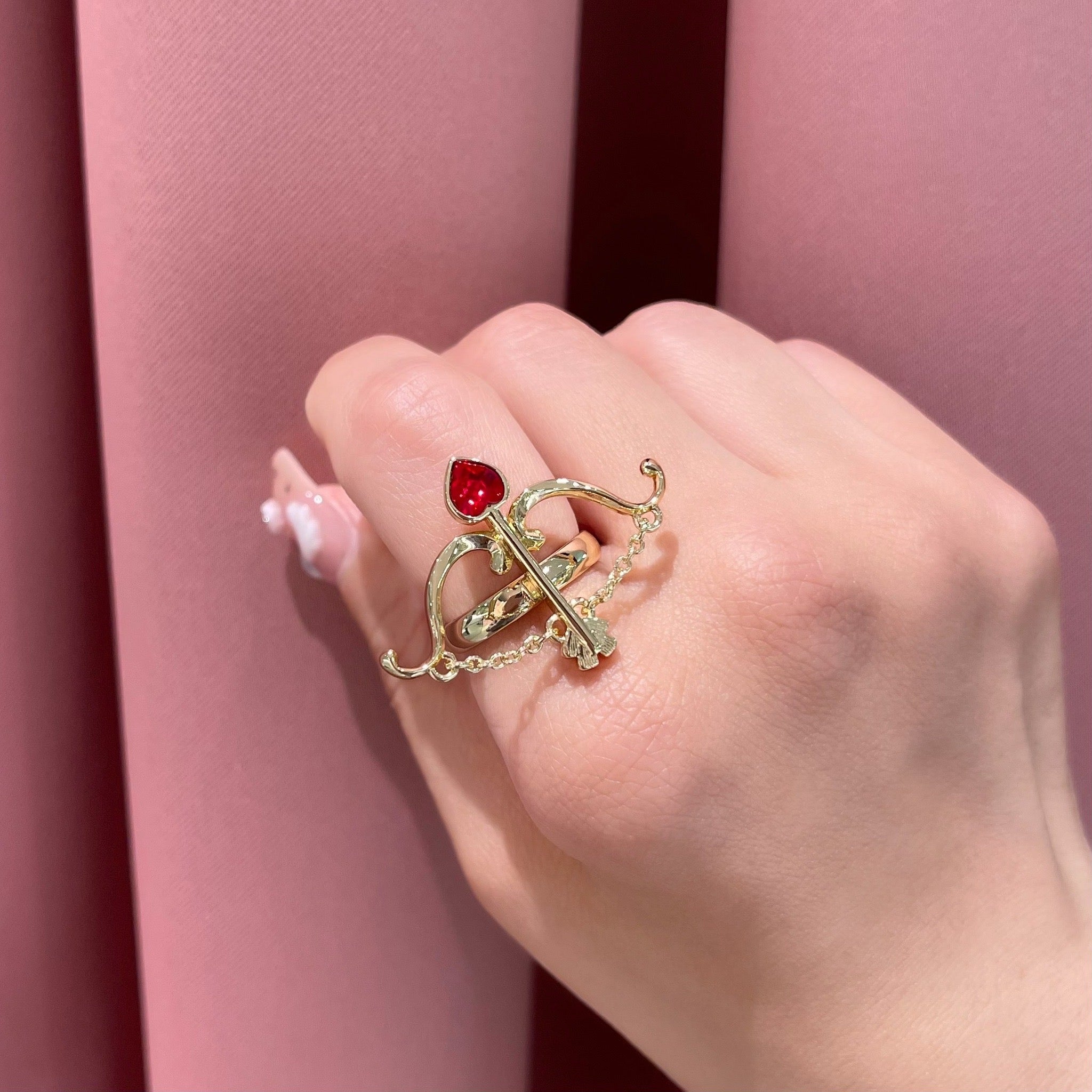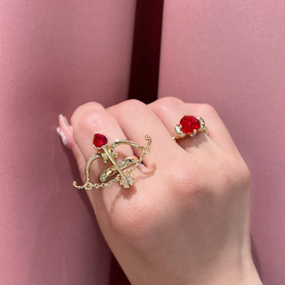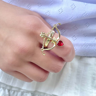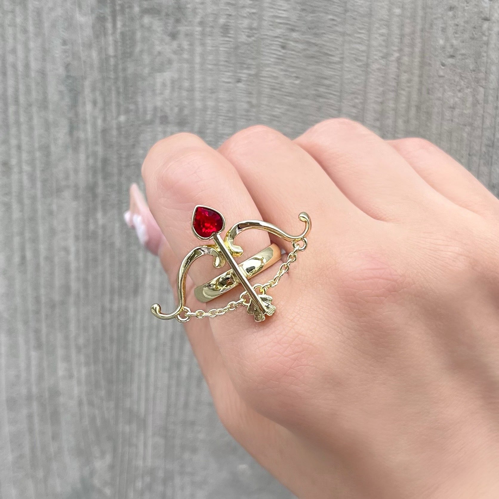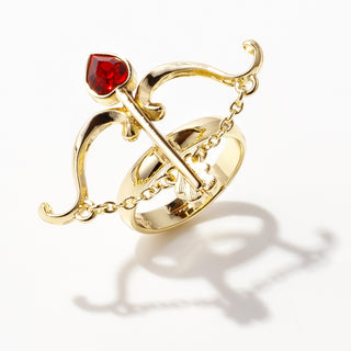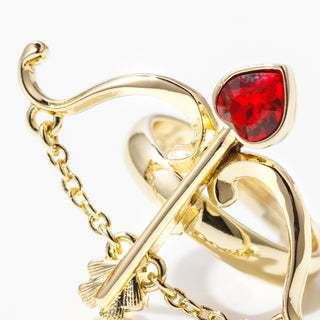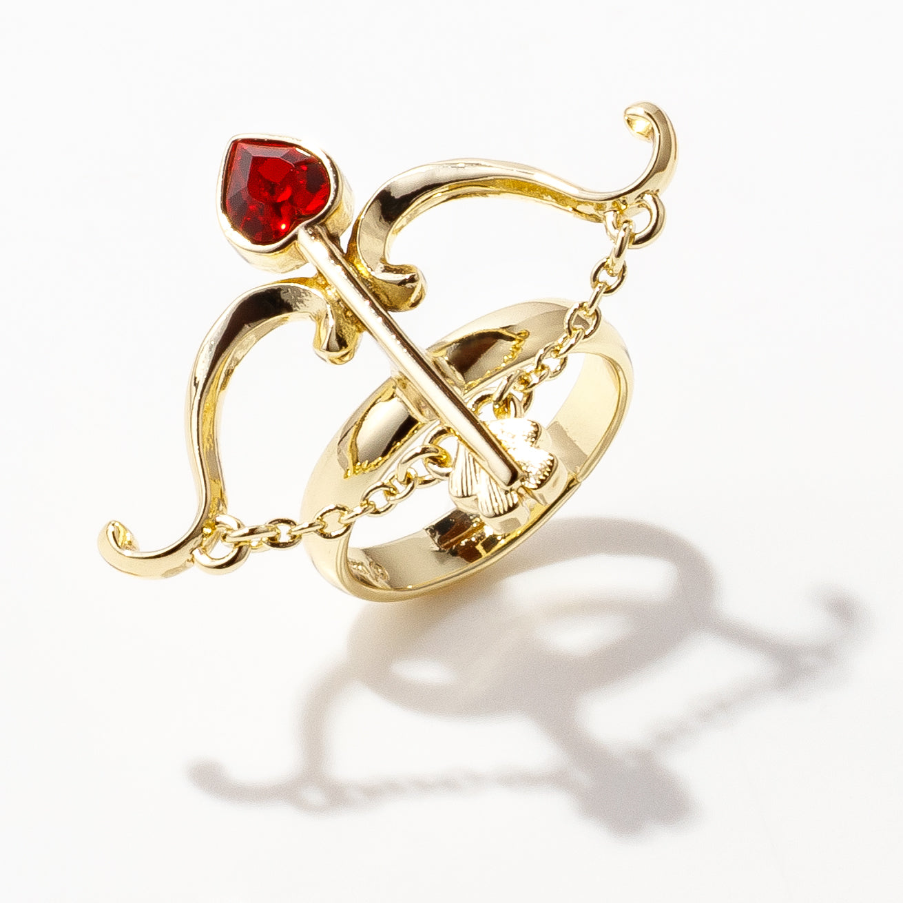 ゴールドの弓と、真っ赤なハート型クリスタルの矢が目を引くデザイン。