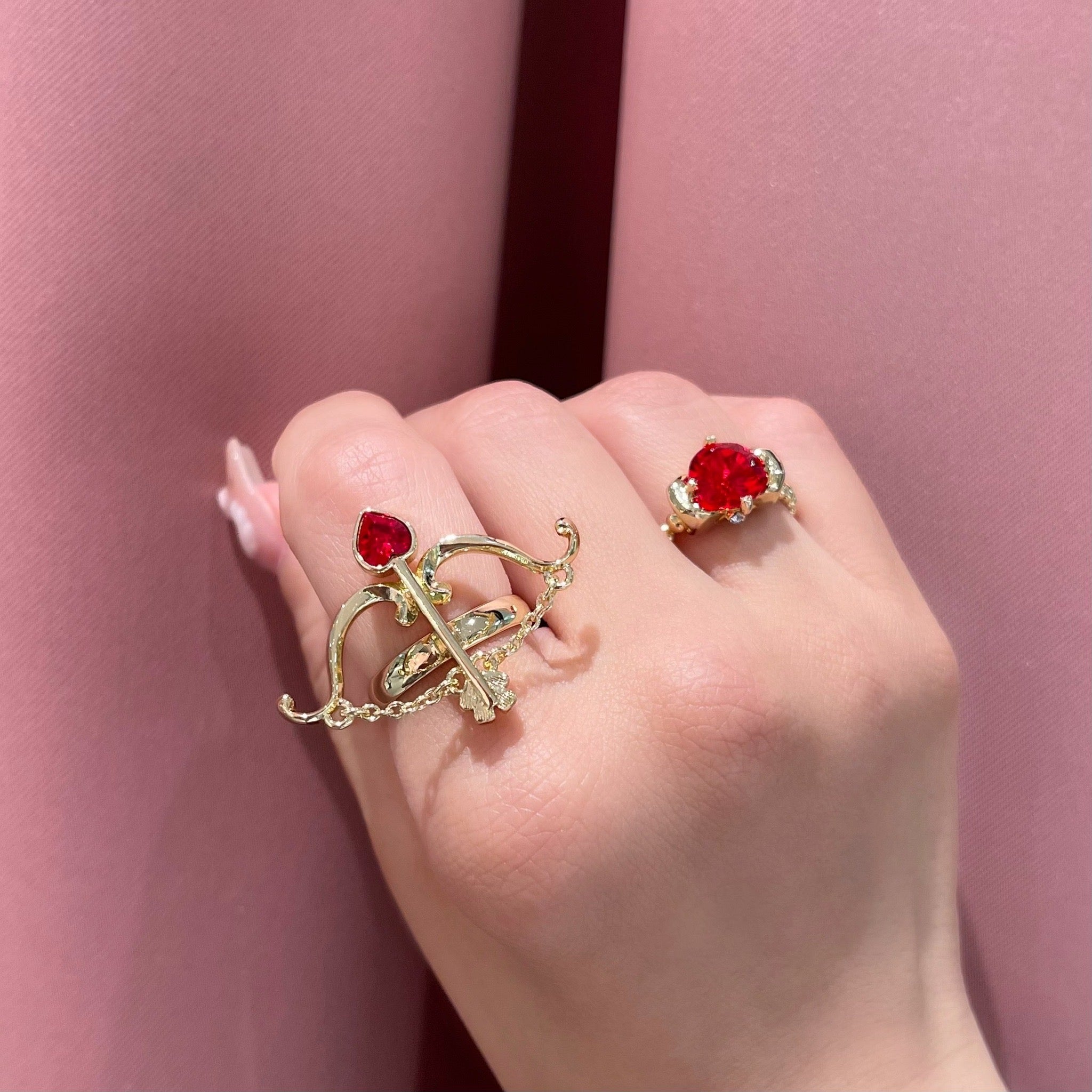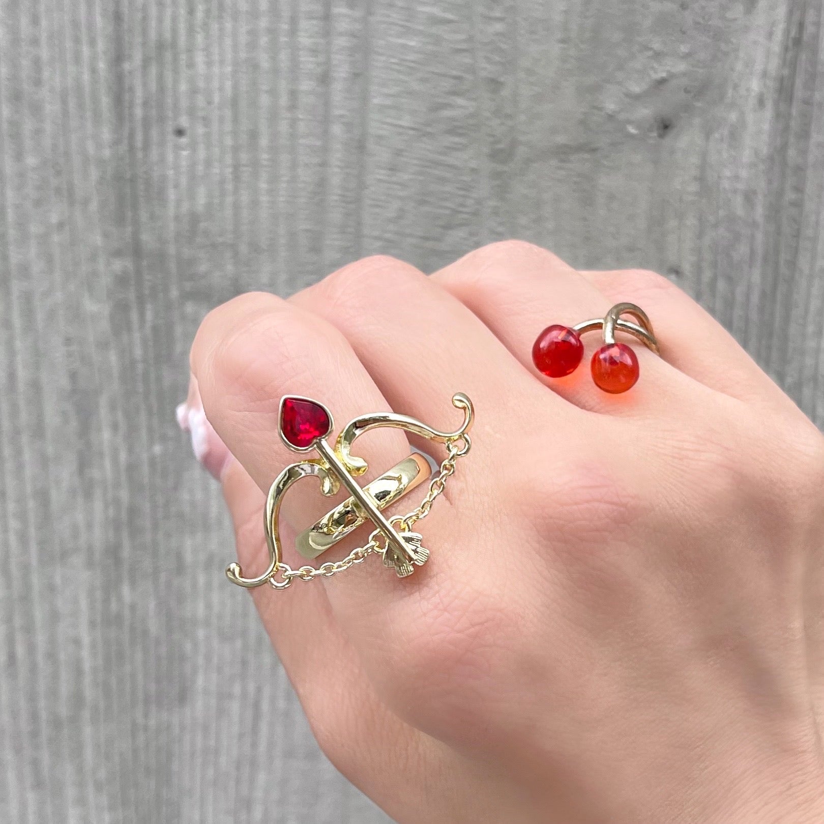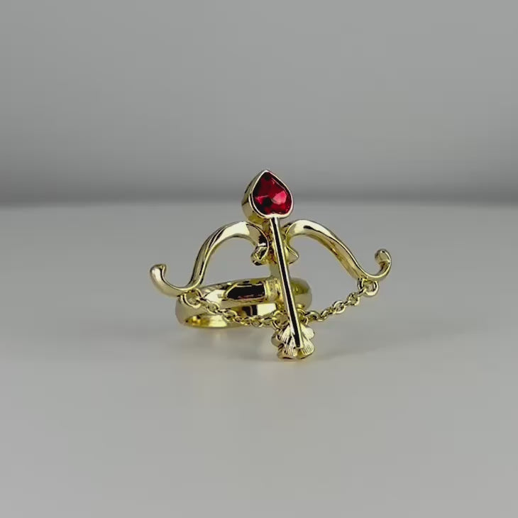 ゴールドの弓と、真っ赤なハート型クリスタルの矢が目を引くデザイン。