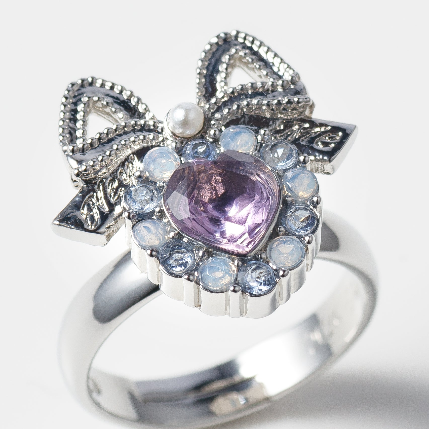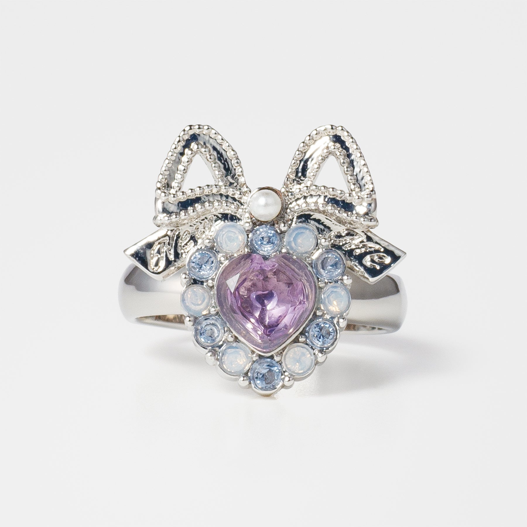 デザインの核となるのは、ハートシェイプの天然石・アメジスト。その周りをホワイトオパールとライトサファイアのクリスタルが淡く彩り、まるで冬の澄んだ空気を纏ったような透明感のある輝きを放ちます。