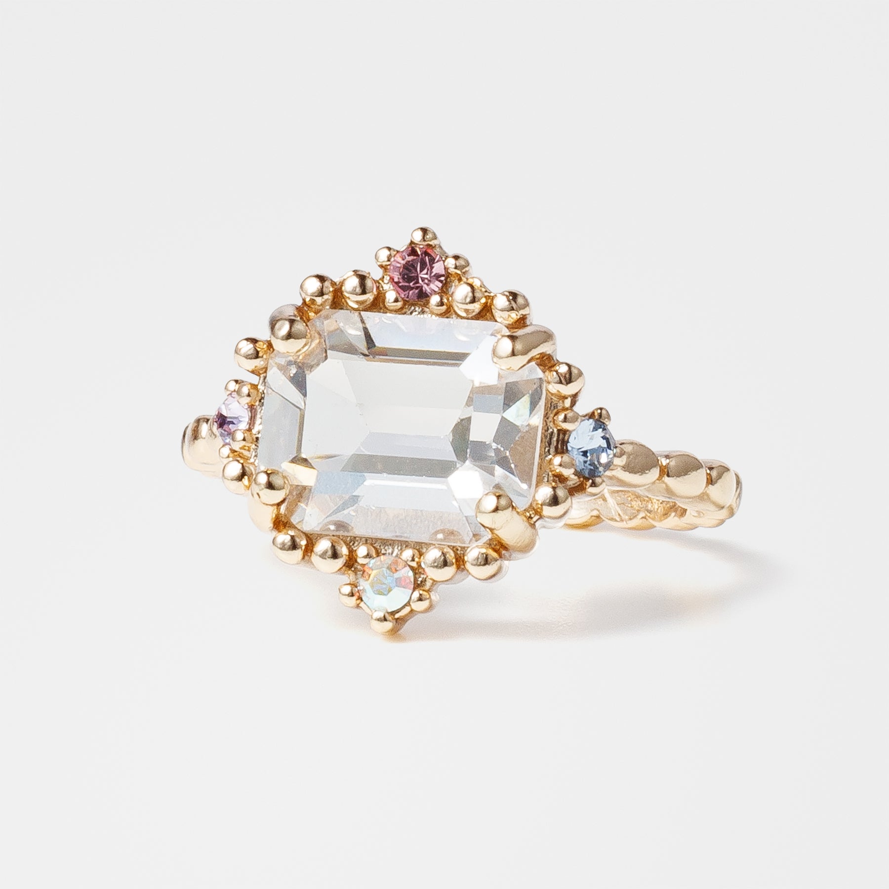 夢のような輝きを纏った「ジェムジェリーリング(ドリーム)」。中央には、あえて裏面の箔を取り除いたクリスタルを配置しました。光を遮ることなく透き通るその透明感が美しいリングです。