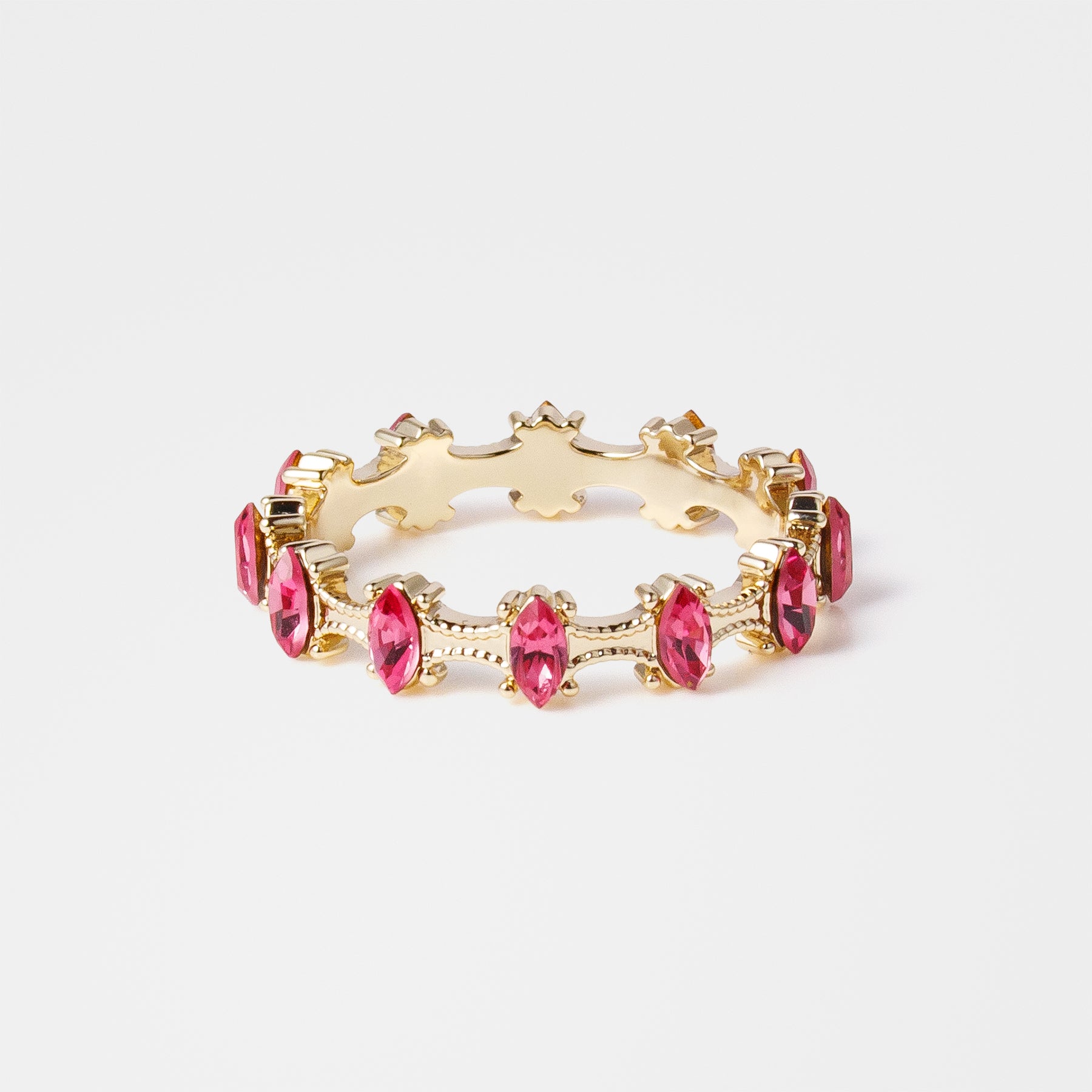 マーキスカットが持つシャープな印象を、パッと目を引く「ローズ」の色味でドラマチックなリングになりました。発色が良いので細くても十分ポイントになります。
