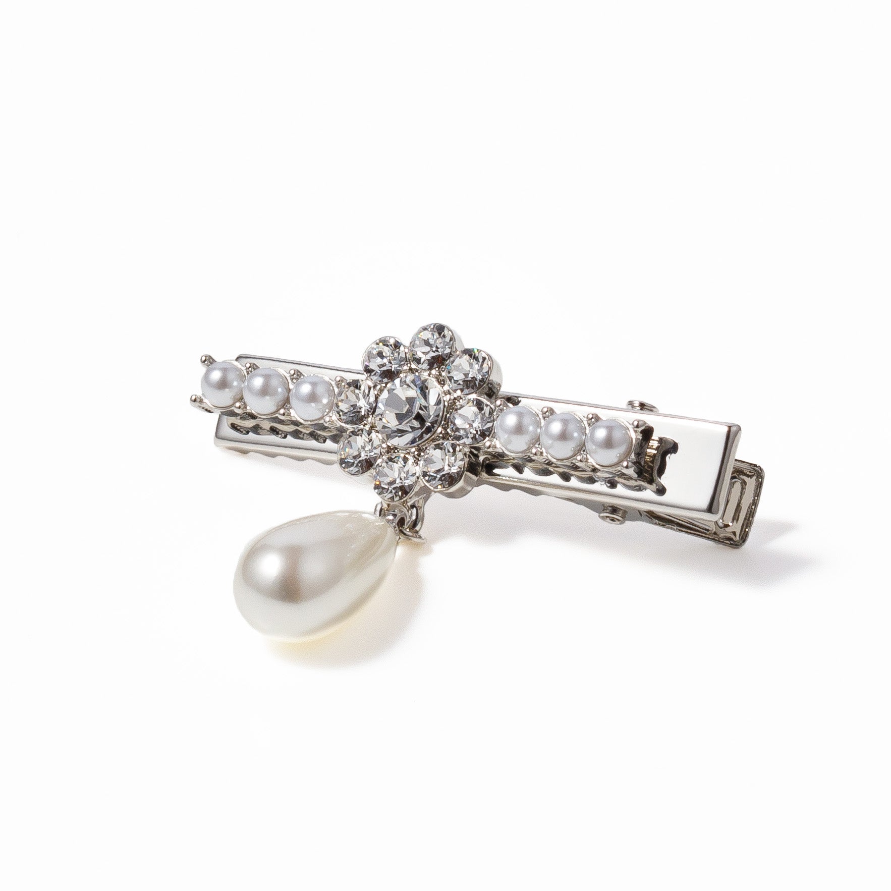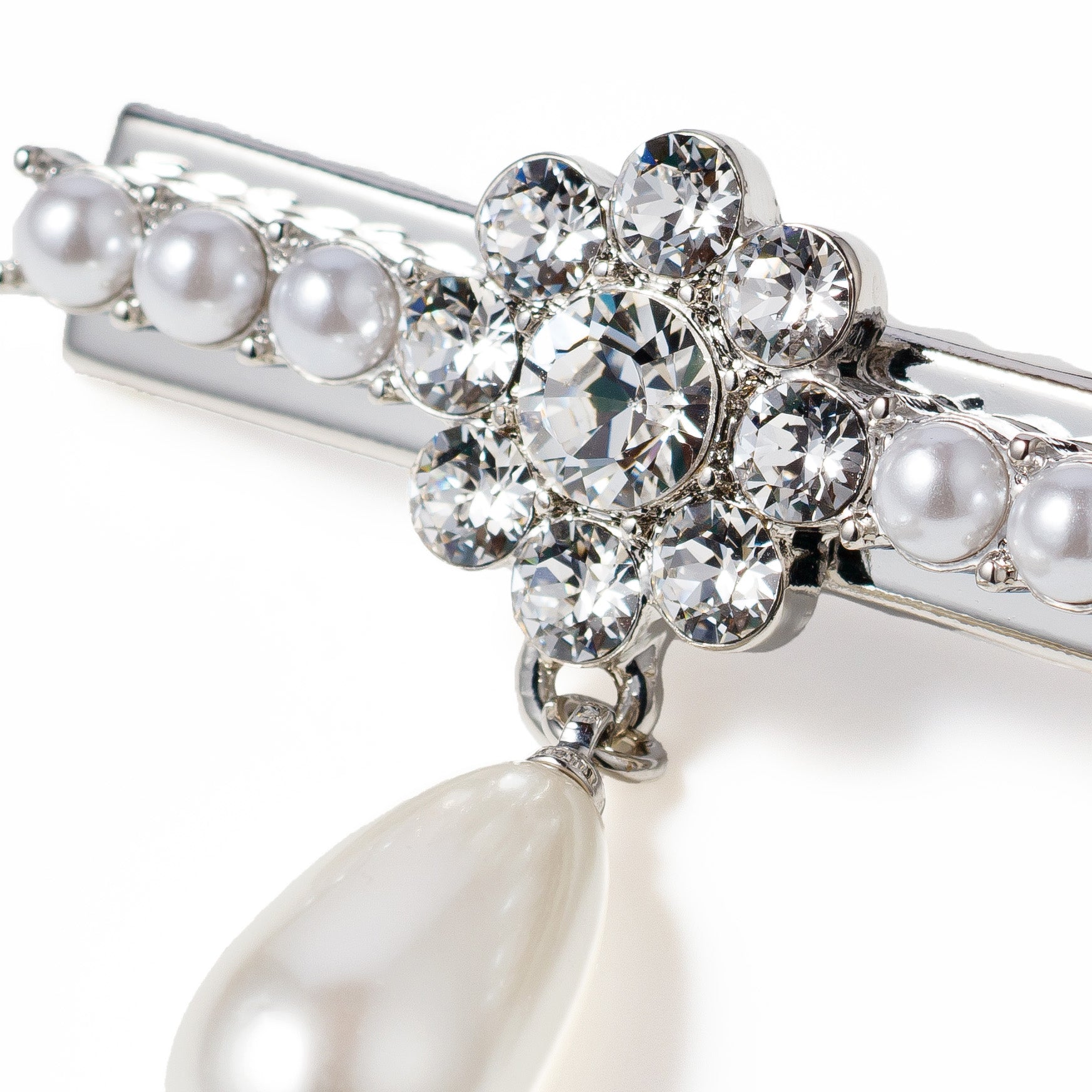 銀色金屬底座與水晶和珍珠結合。