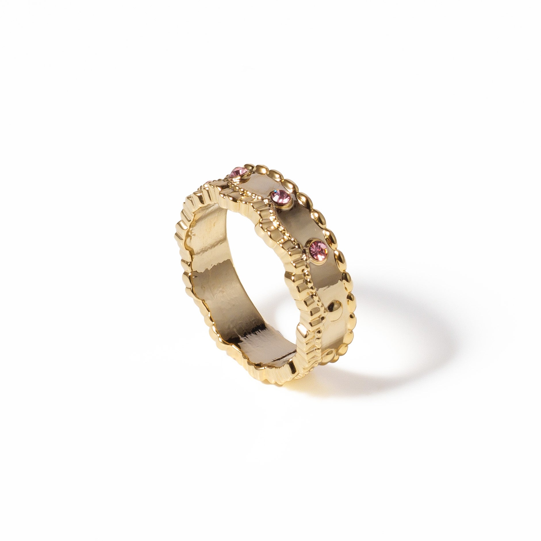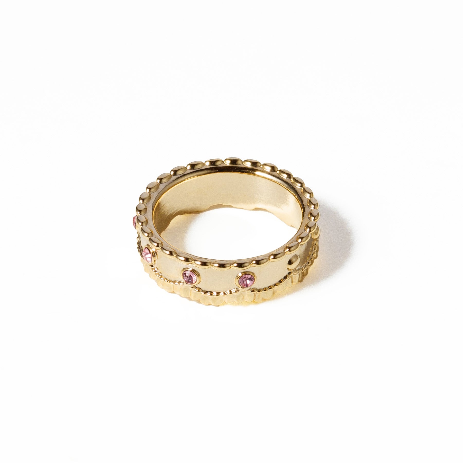 淺金色底座上點綴著淺玫瑰色水晶,營造出宛如公主裙的甜美戒指。